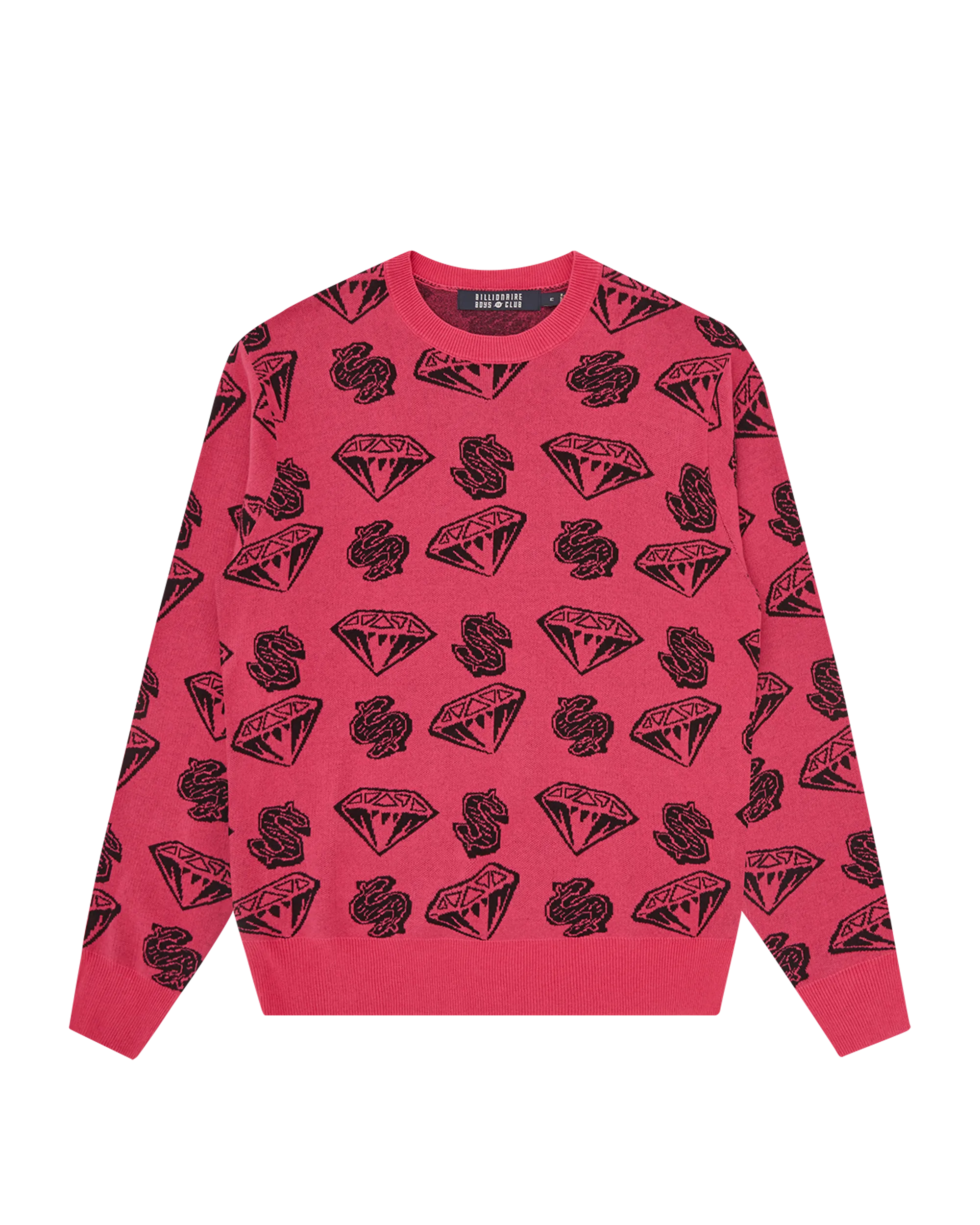 Diamonds & Dollars knitted sweater featuring an all over graphic, rib collar, cuffs, and hem.