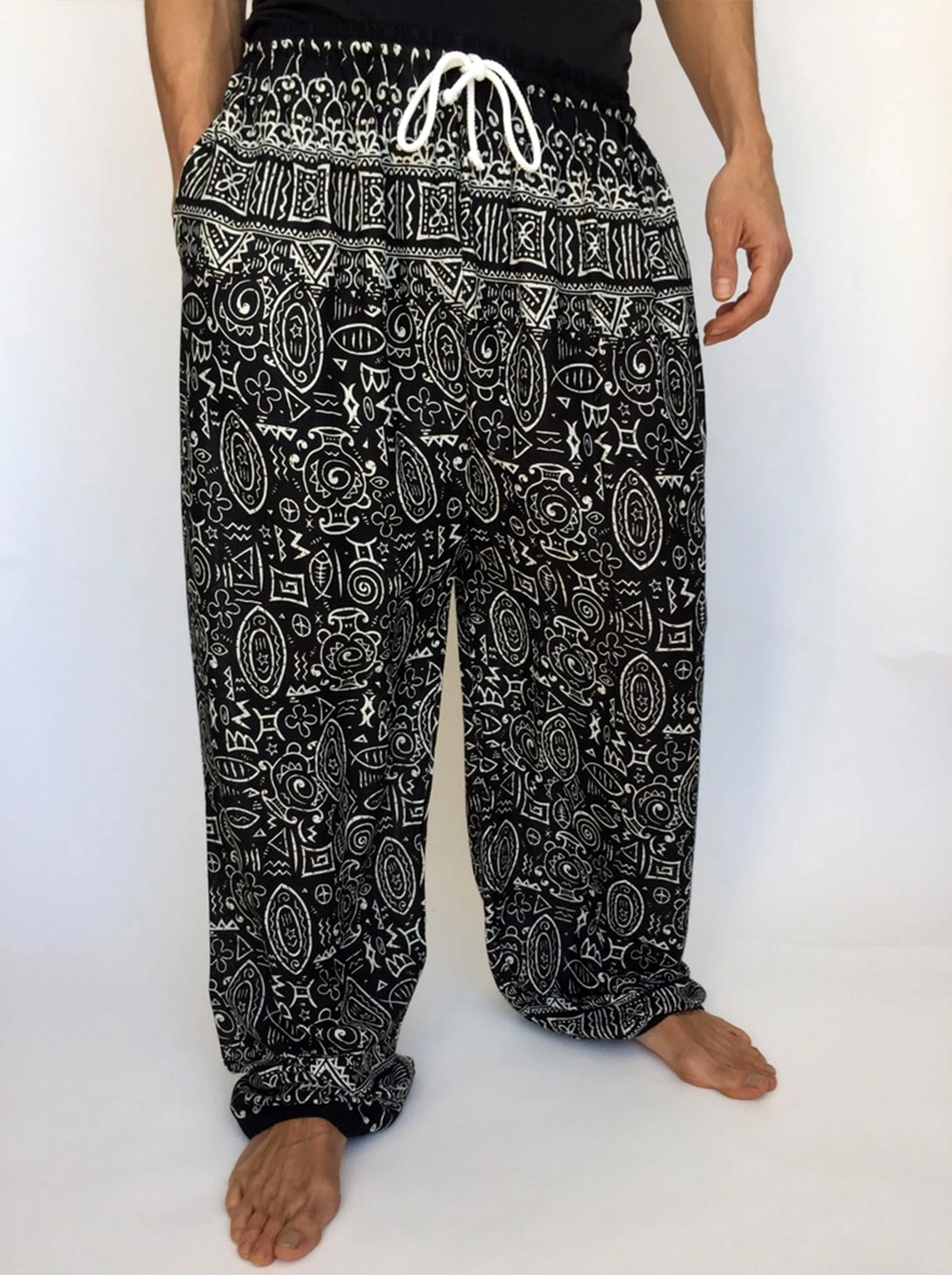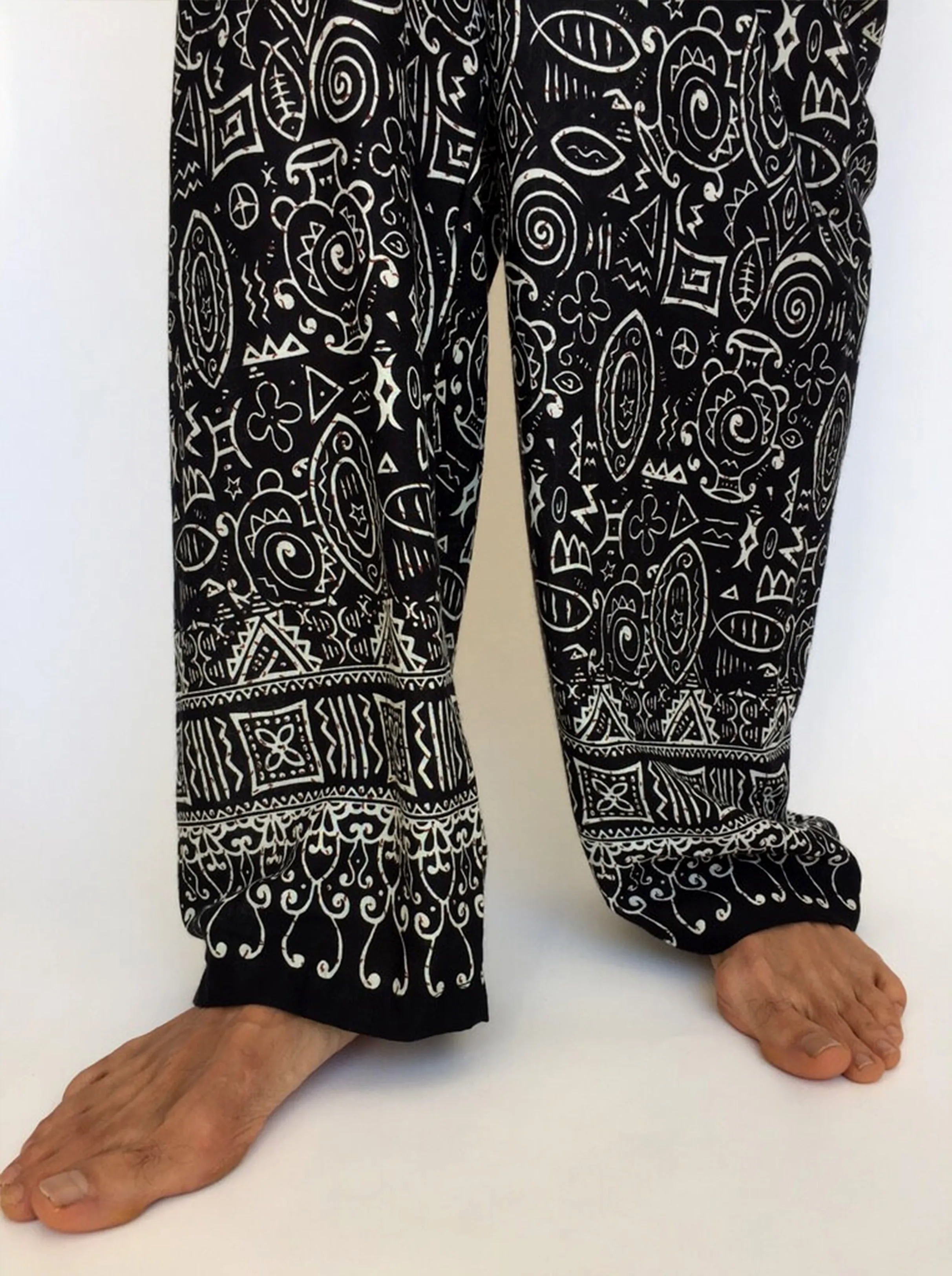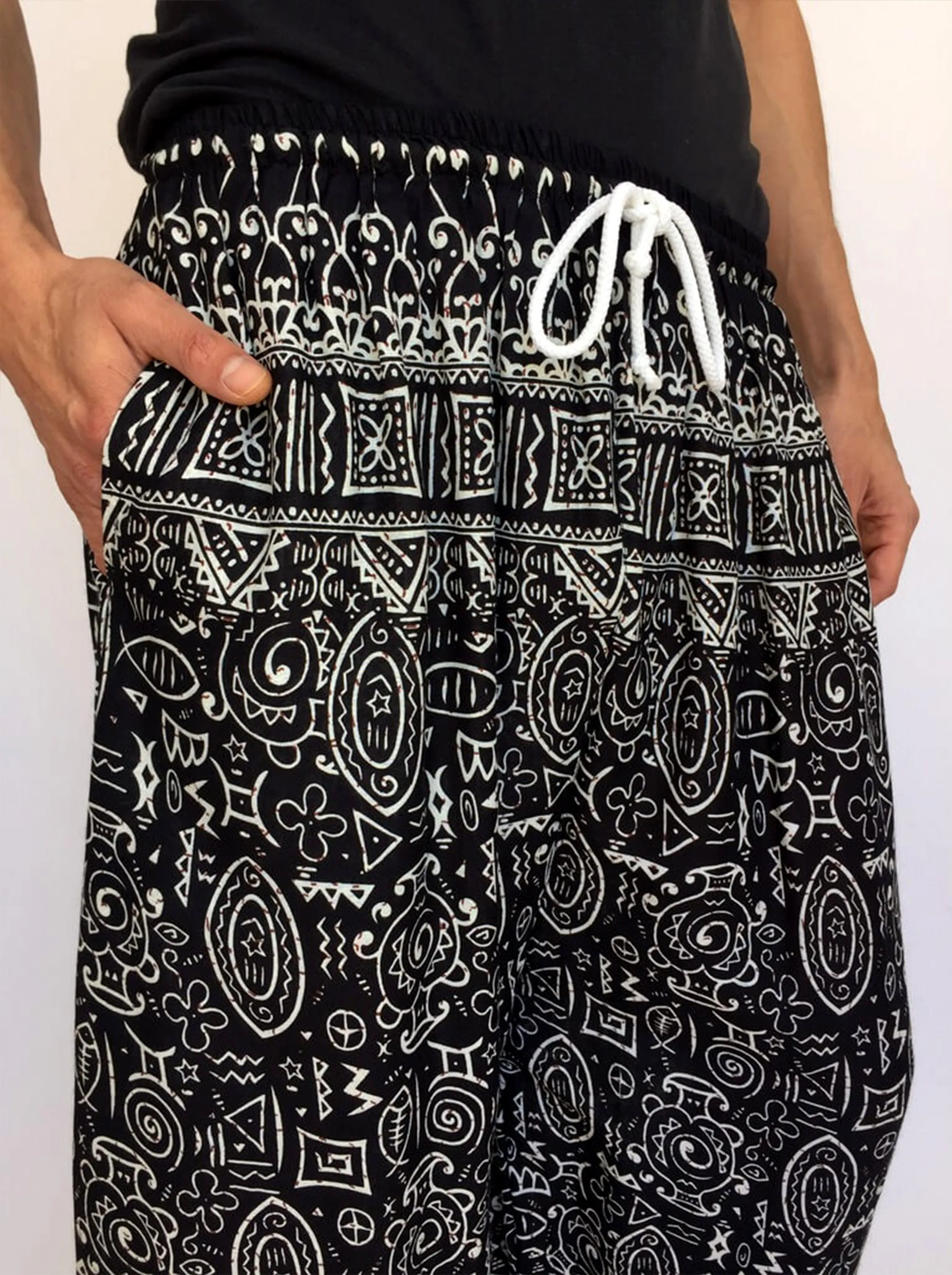 Drawstring Hippie pants with Pocket made from light and airy rayon material. Features 1 pocket and a drawstring/elastic waist and free ankle cuffs.