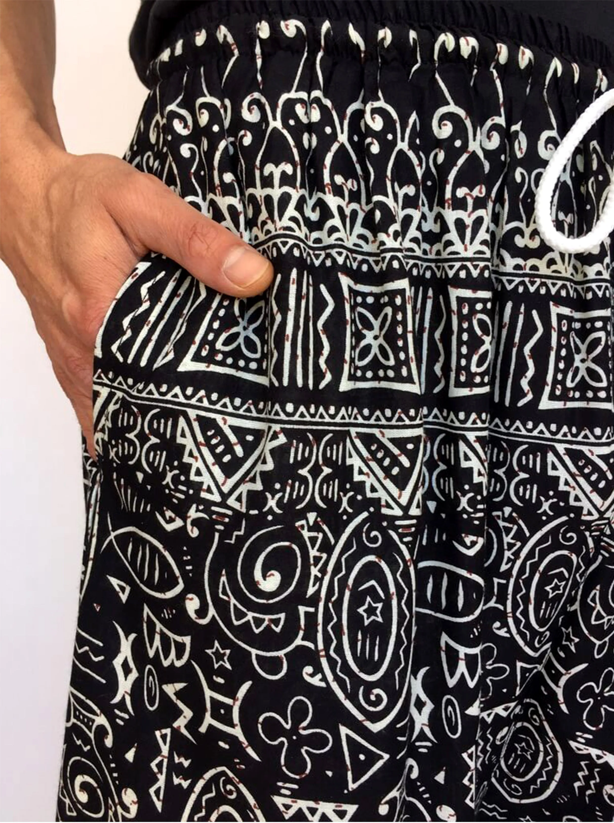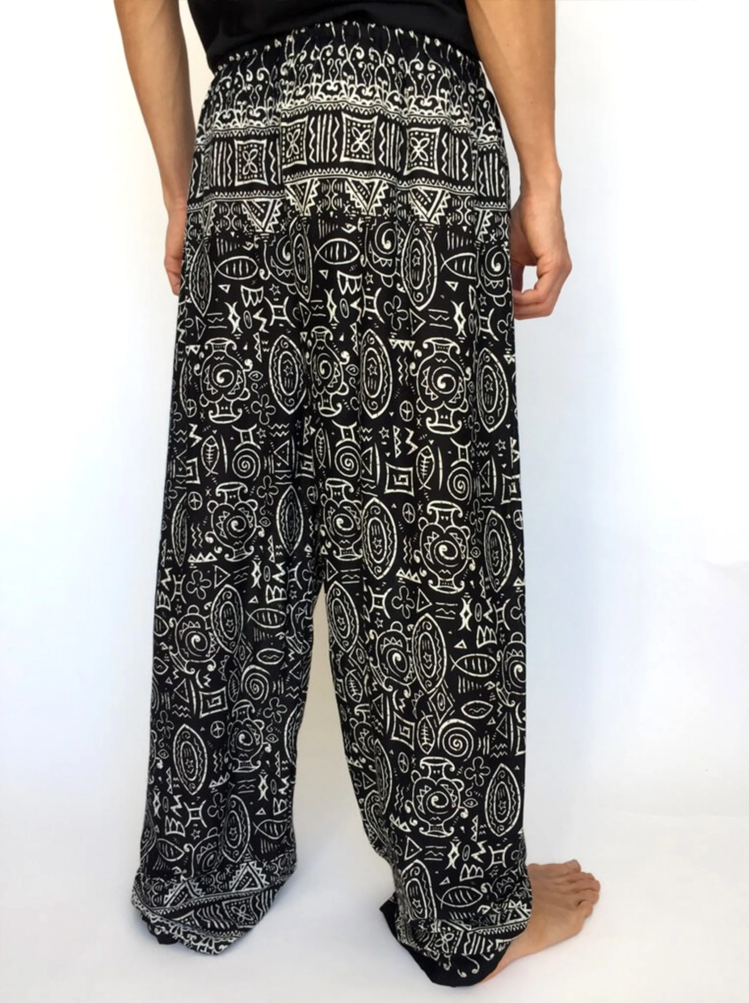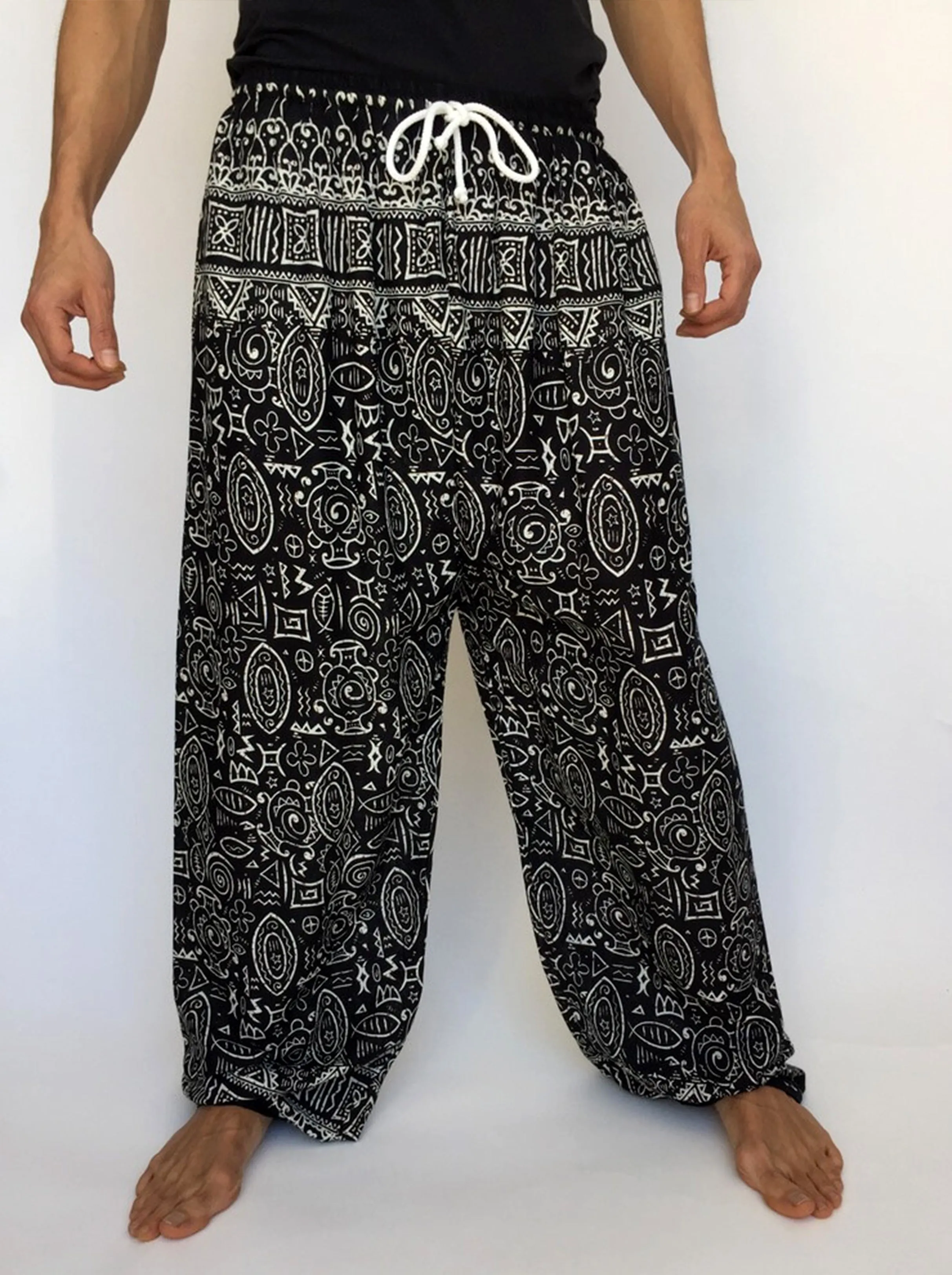 Drawstring Hippie pants with Pocket made from light and airy rayon material. Features 1 pocket and a drawstring/elastic waist and free ankle cuffs.