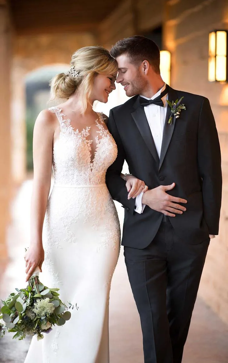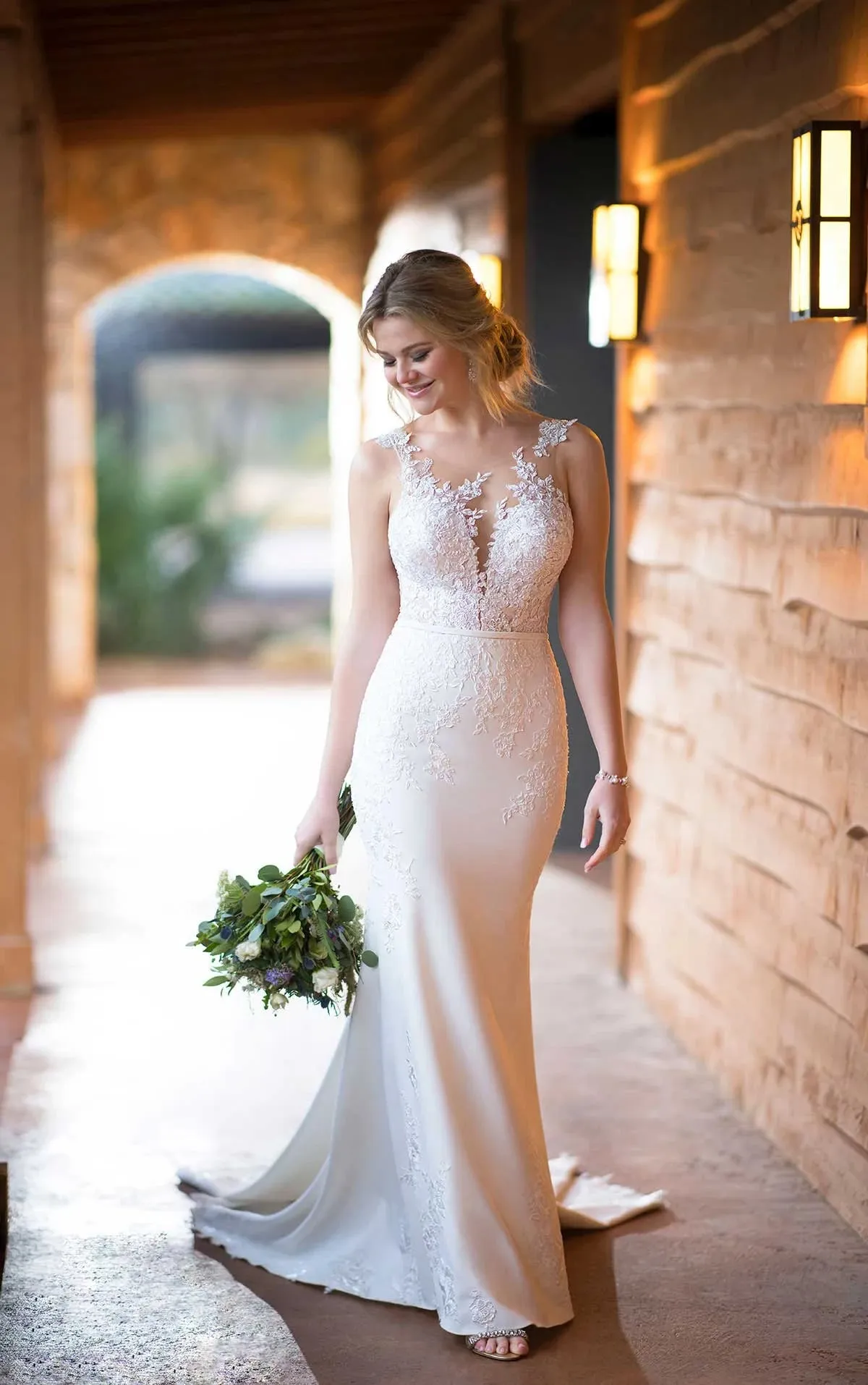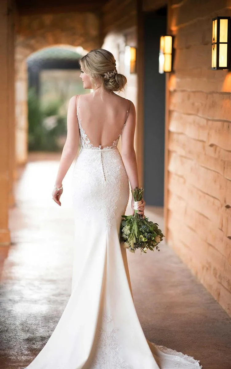 A sophisticated style with a unique twist, prepare to fall in love with this elegant wedding dress with asymmetrical neckline from Essense of Australia. A plunging, V-neckline commands attention on the bodice of this lace and crepe gown and is accentuated with placed lace that creates a breathtaking, asymmetrical pattern. The lace from the semi-sheer bodice continues slightly onto the gown’s crepe skirt and is repeated near the hem and up the front. The back of this gown is completely open and highlighted on either side with organic lace. Visible seaming shapes the body down the back of the skirt before extending into a slight train, complete with sparkling details. The back of this elegant wedding dress with asymmetrical neckline zips up beneath fabric-covered buttons.