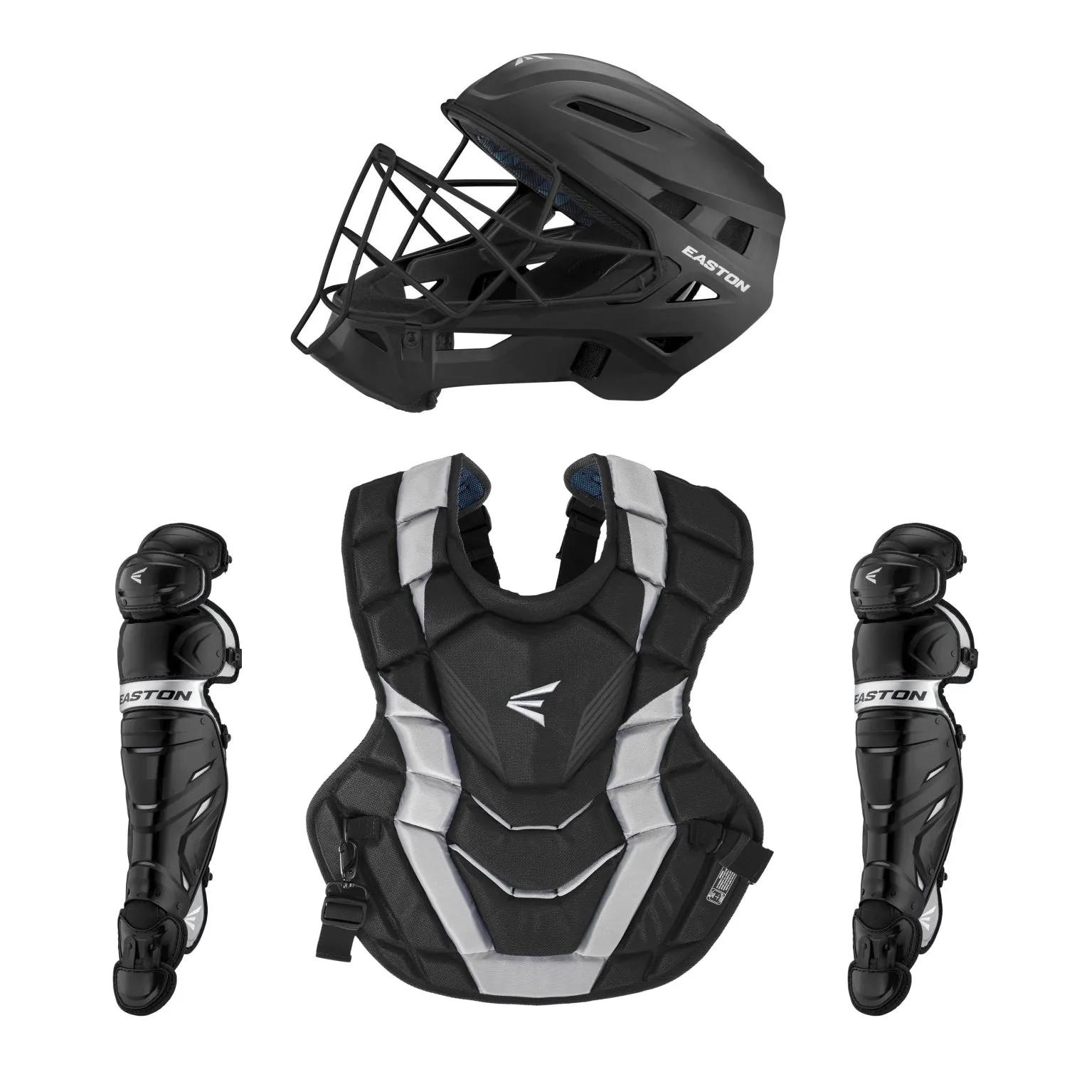 The Easton Elite X Intermediate Catchers Set is a high quality catchers set. However, what makes this set stand out against all other is not a unique feature. It is the over 10 stock color combinations available. With any other set, you would have to wait six to nine weeks to get a custom designed set. Thus, with the Elite X set you can match up to any team colors. Look sharp behind the plate will be easy when you are wearing this set from Easton. The set features a helmet constructed in a streamlined design that allows for a superior fit. It s light weight feel along with the soft foam lining gives this helmet an extremely comfortable fit. The set also includes an adjustable chest protector that provides over the shoulder protection. It has a unique two toned design that has a solid base color with a second accent color. The third piece to the set is the leg guards. They have an inner knee protection and Zero Shock memory foam to supply a comfortable fit and also add protection. Easton produces this catchers set. They are the number one name in youth baseball equipment. Why would you purchase a set from any other manufacturer? Since Easton is the name you know and trust, it only makes sense to order their products. So take the field in the hottest gear on the market. Flash a custom look without having to wait months for delivery. As a result, the most difficult decision you will have is which color combo to choose. Once you make your decision, add the set to your shopping cart and purchase from Baseball Bargains today. The set comes complete with: