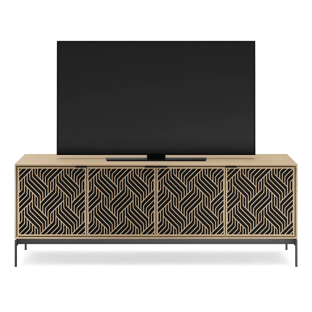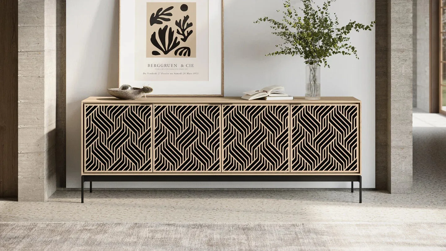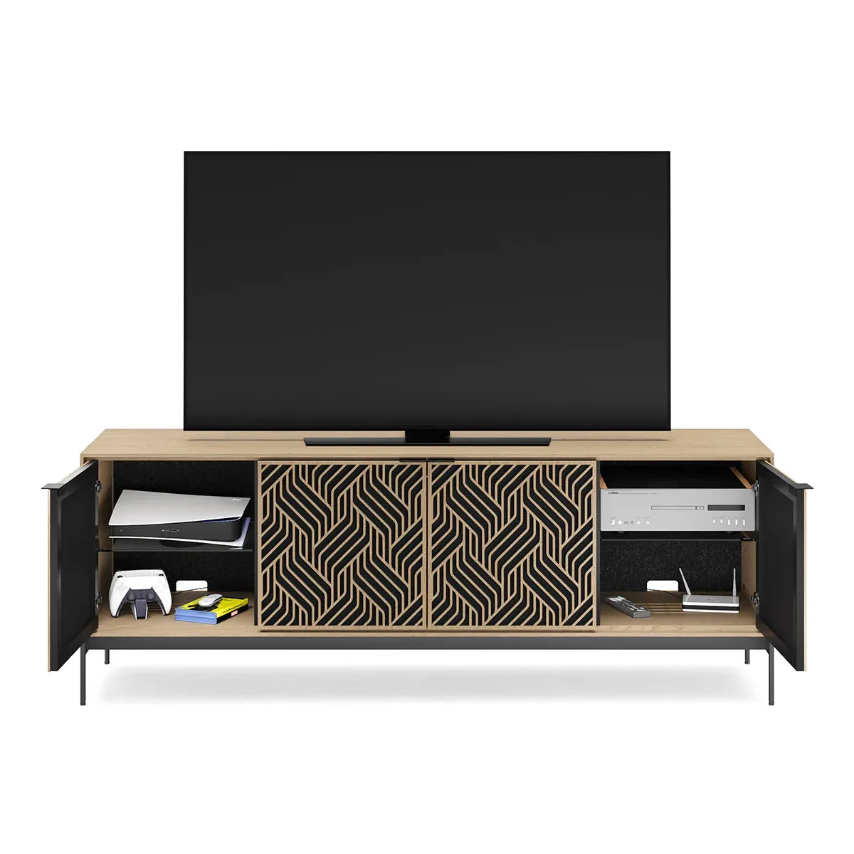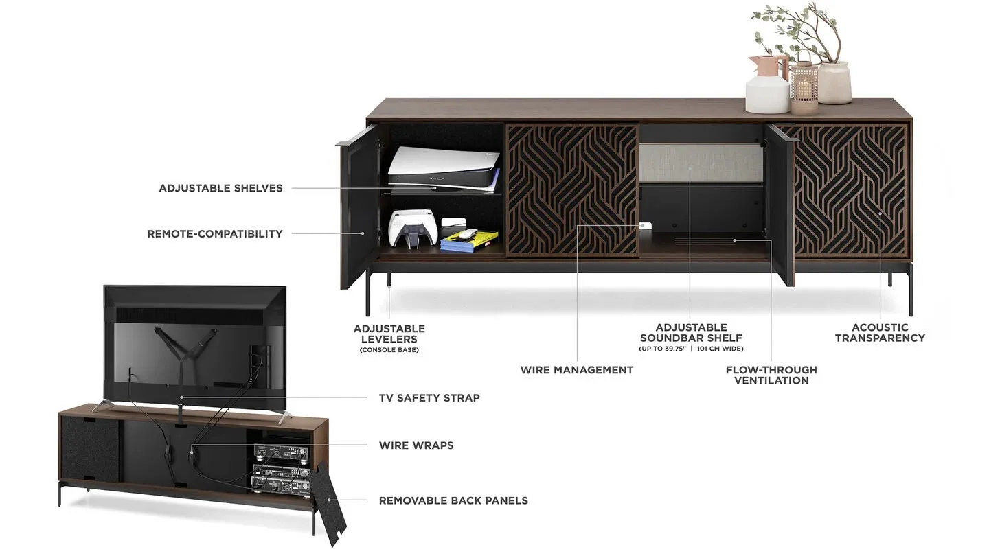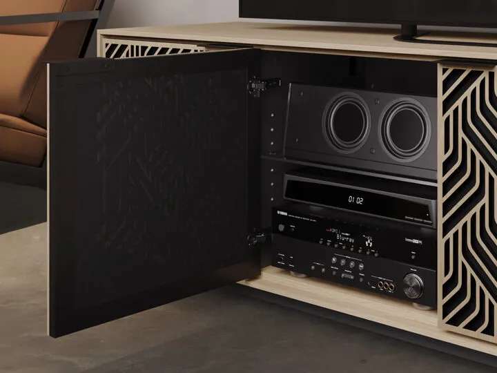 The BDI Elements 8709 Weave Media Cabinet with Console Base is a fusion of organic design and cutting-edge functionality, perfect for modern living spaces. The cabinet features the Weave door pattern, bringing a textured and natural aesthetic to any room. Designed to support larger TVs, it provides ample space for your media components, while the console base adds height and prominence to your living room. Acoustically transparent doors, hidden wheels, and adjustable shelves ensure that your tech setup remains organized and easy to manage. With soft-close doors and precision-engineered details, the Elements 8709 Weave Media Cabinet is a stylish and practical addition to your home.