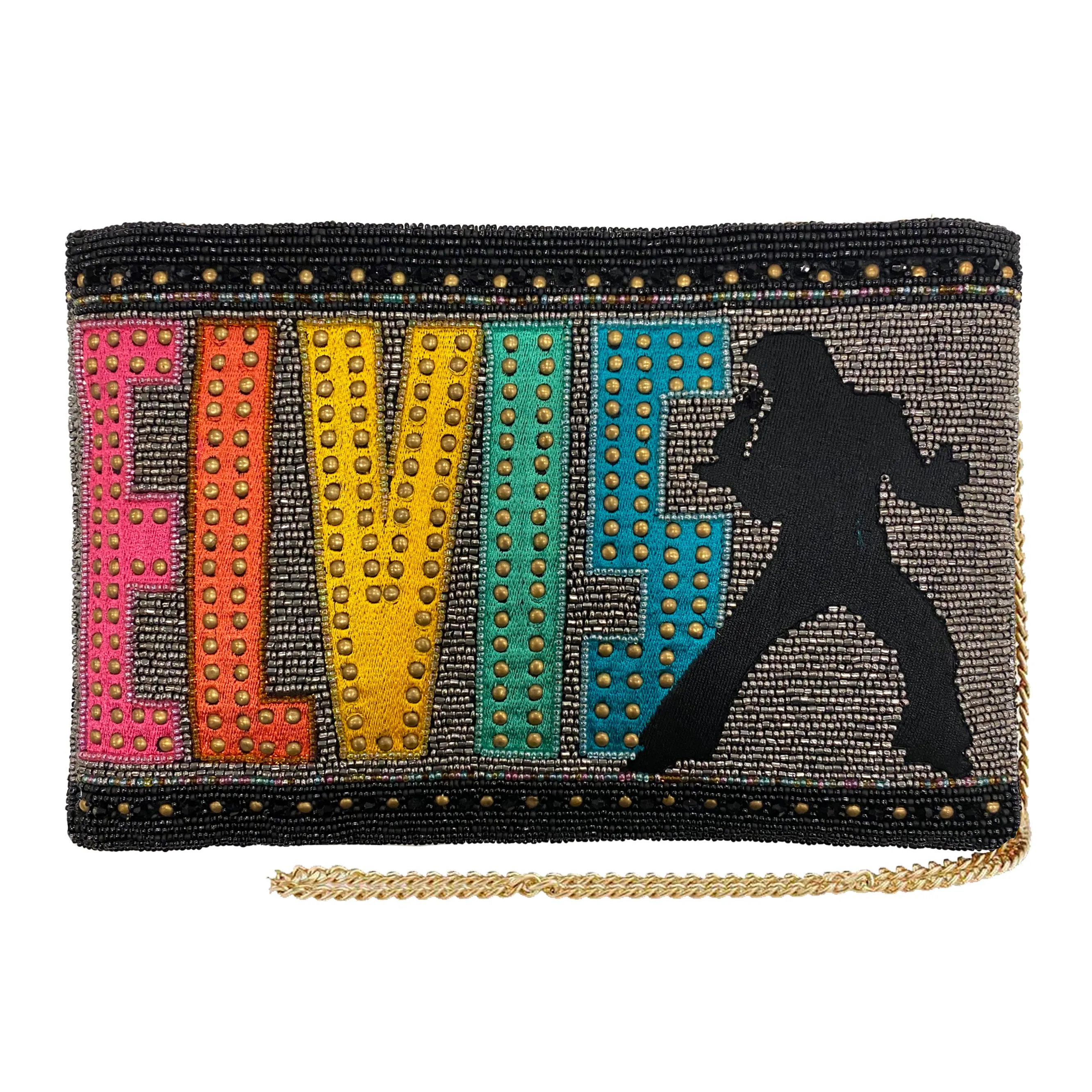 Add Elvis On The Marquee Handbag to your accessory collection! This exclusive handbag features multi colored ELVIS marquee letters and a 70's Elvis silhouette embroidered, studded on a beaded background. This bag is perfect for your phone and everyday essentials. Treat yourself or a friend today!