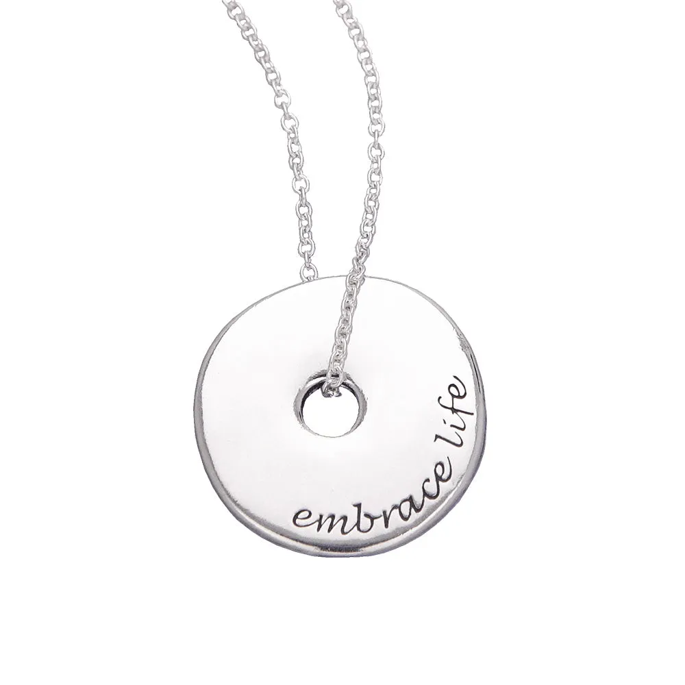 Smooth circular sterling silver disc pendant engraved with the inspirational words embrace life on the front and back. A reminder to live life to the fullest. Positive encouragement for all. Artisan designed and created with intention in NY.