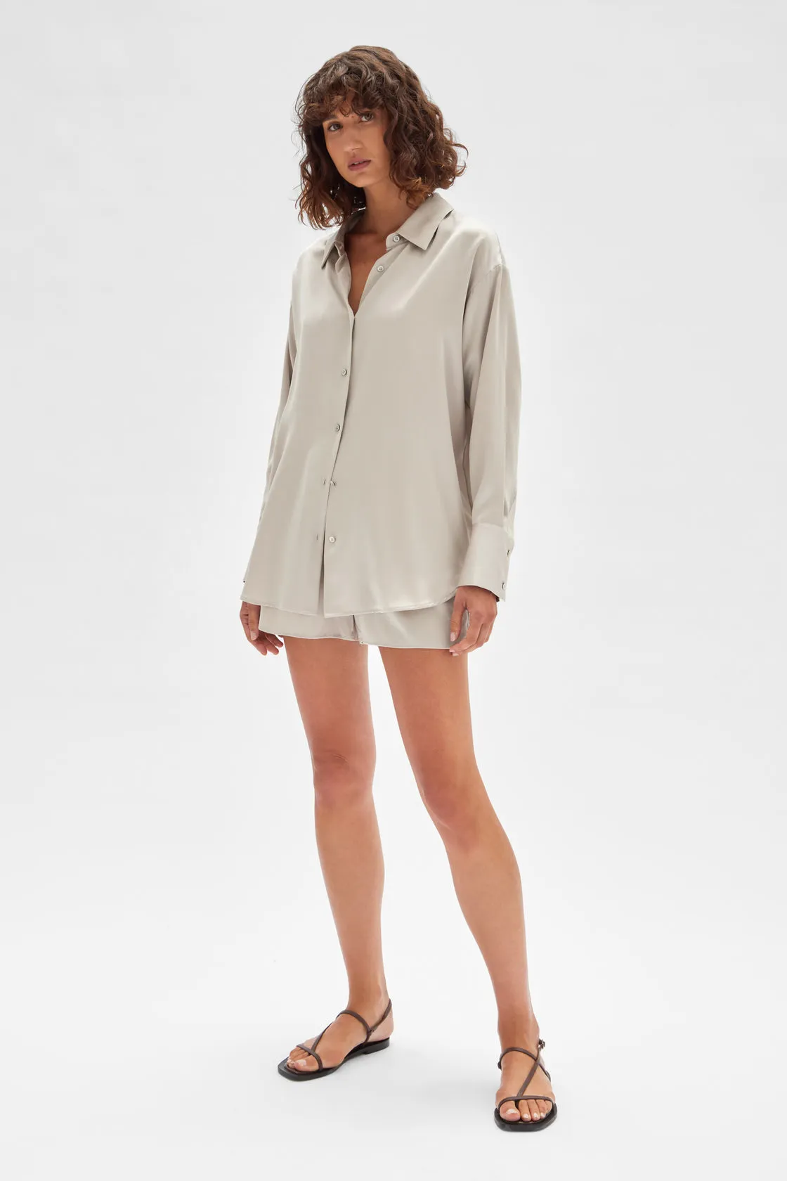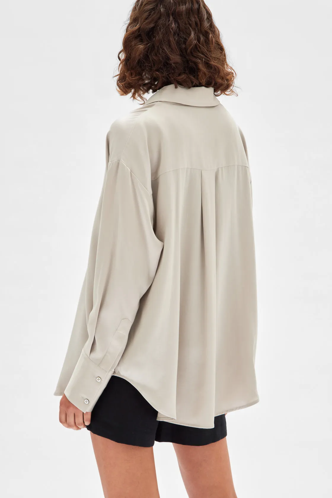 Add an element of luxury to everyday outfits with the Ena Silk Shirt. Beautifully made from sandwashed silk satin, this long sleeve shirt features a collar, box pleat and delicate buttoned details. Designed for an oversized fit, this pure silk shirt elegantly drapes over the body and exudes a sense of ease.