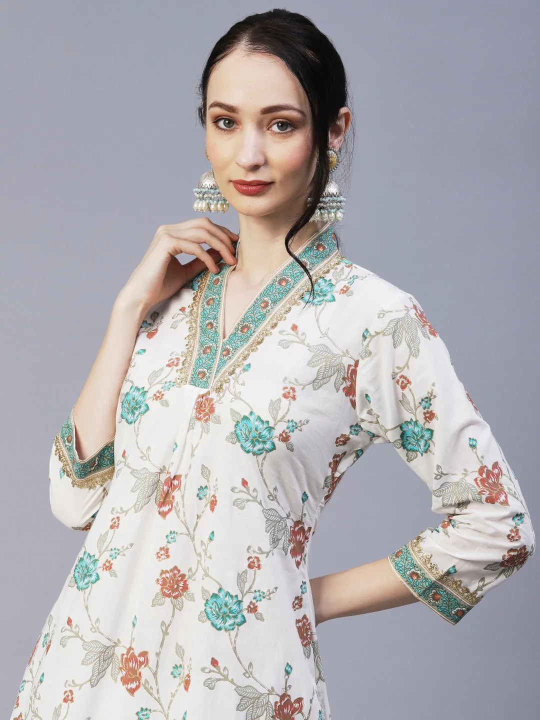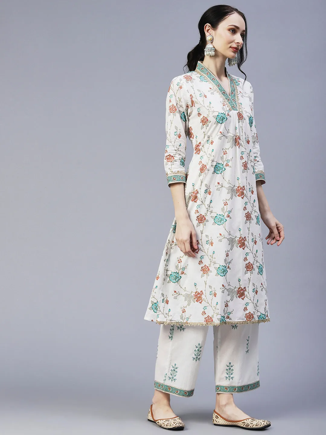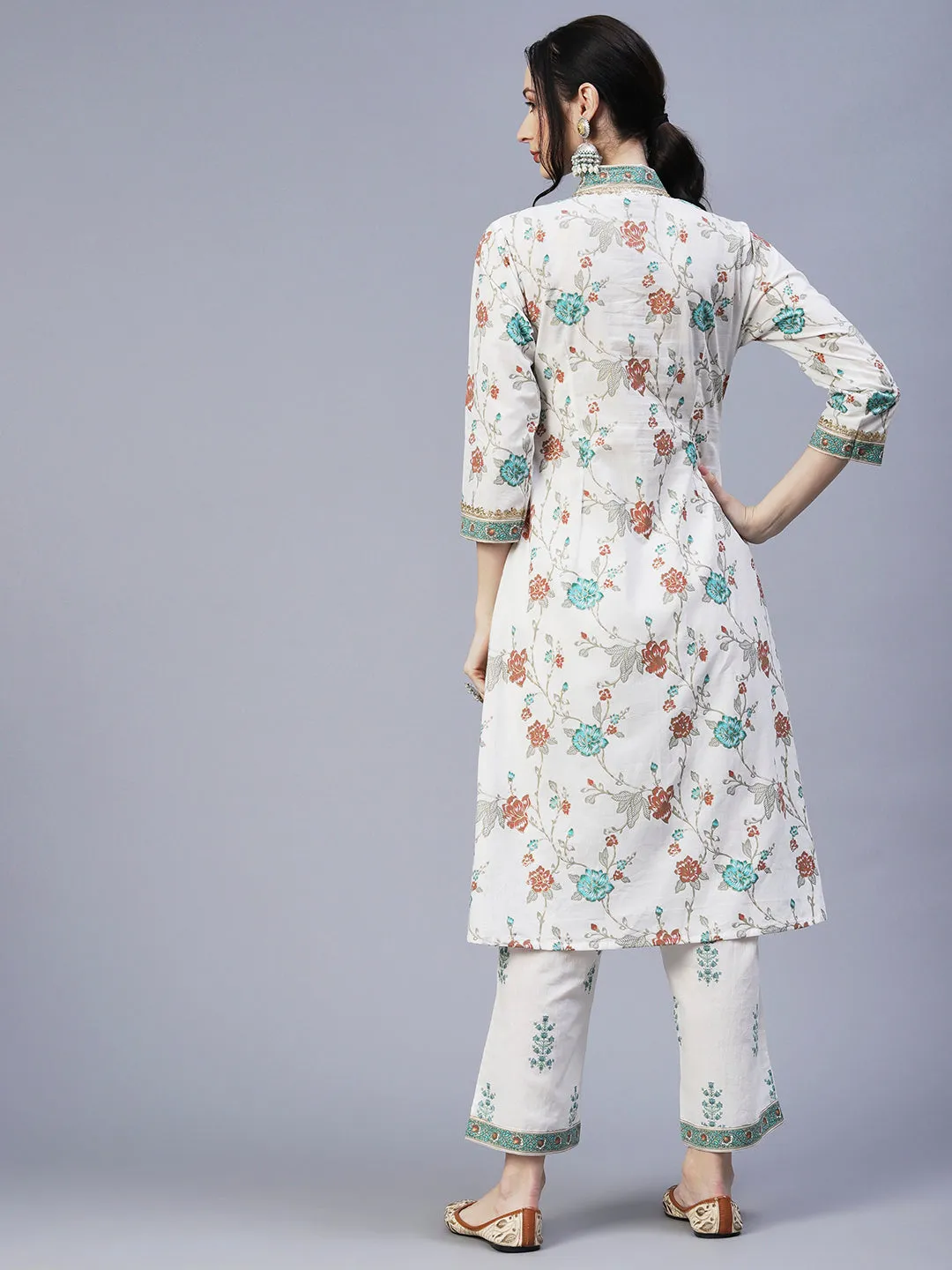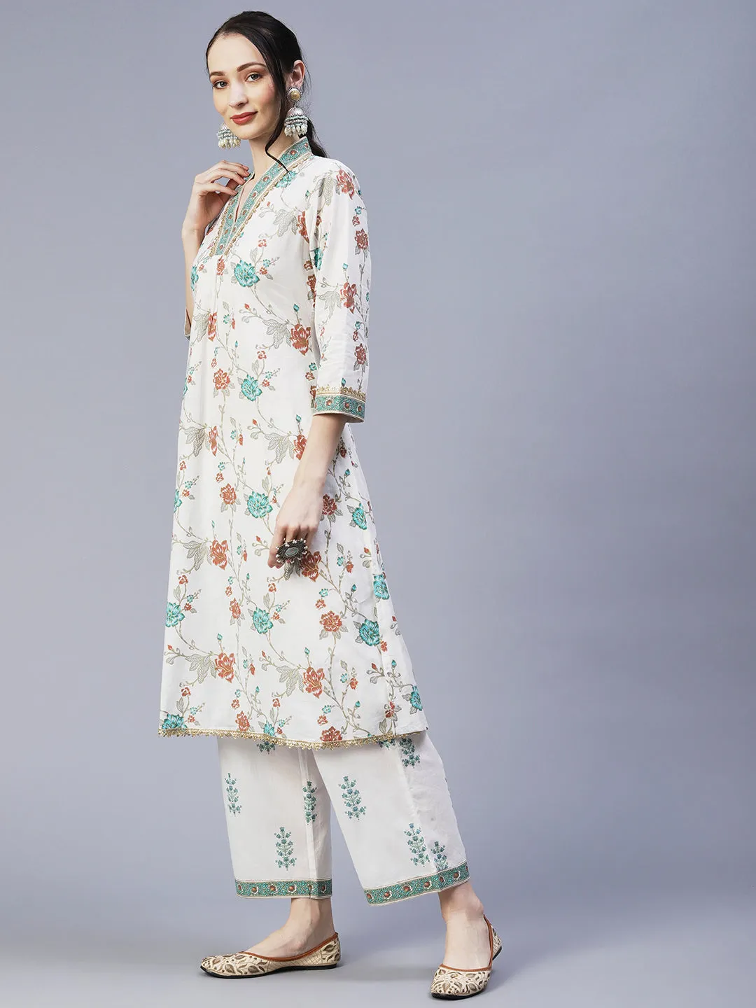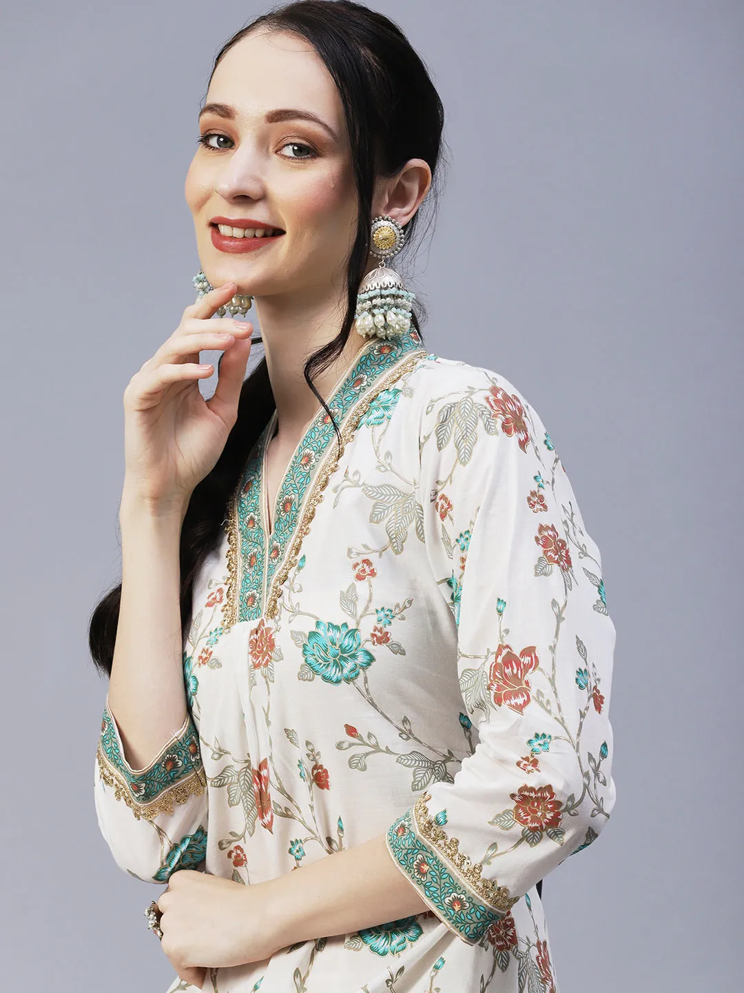 Ethnic Floral Foil Printed & Embroidered A-Line Kurta with Palazzo - Off White