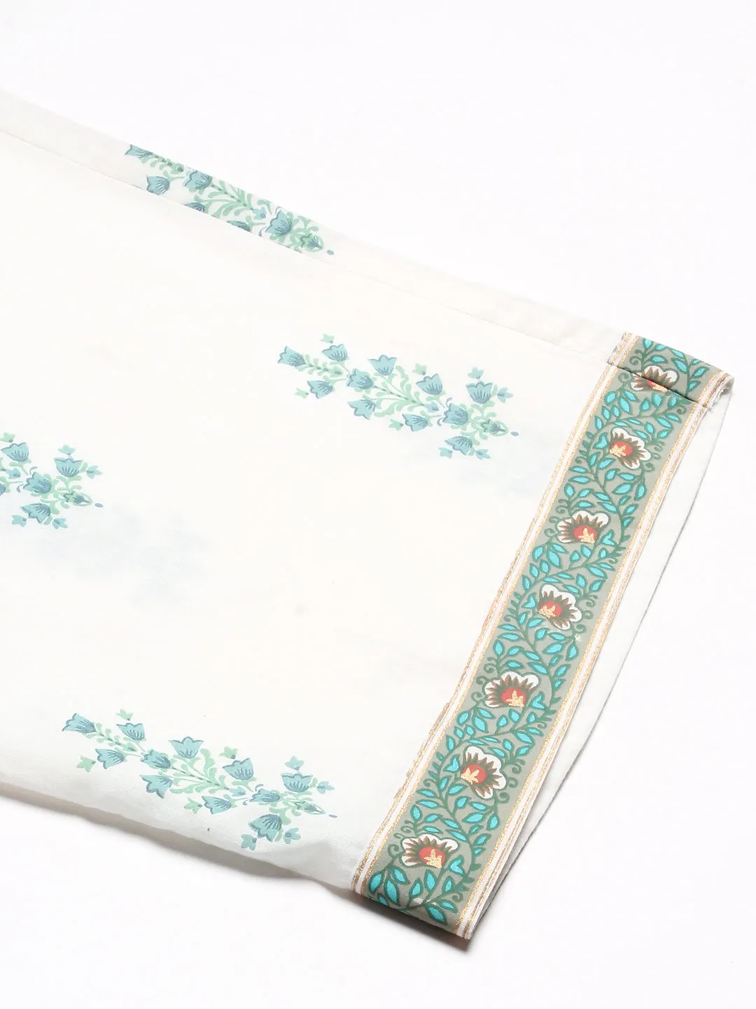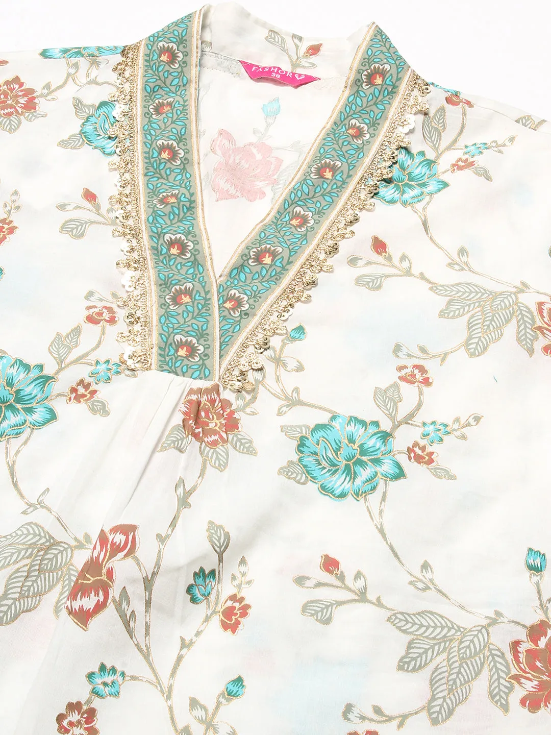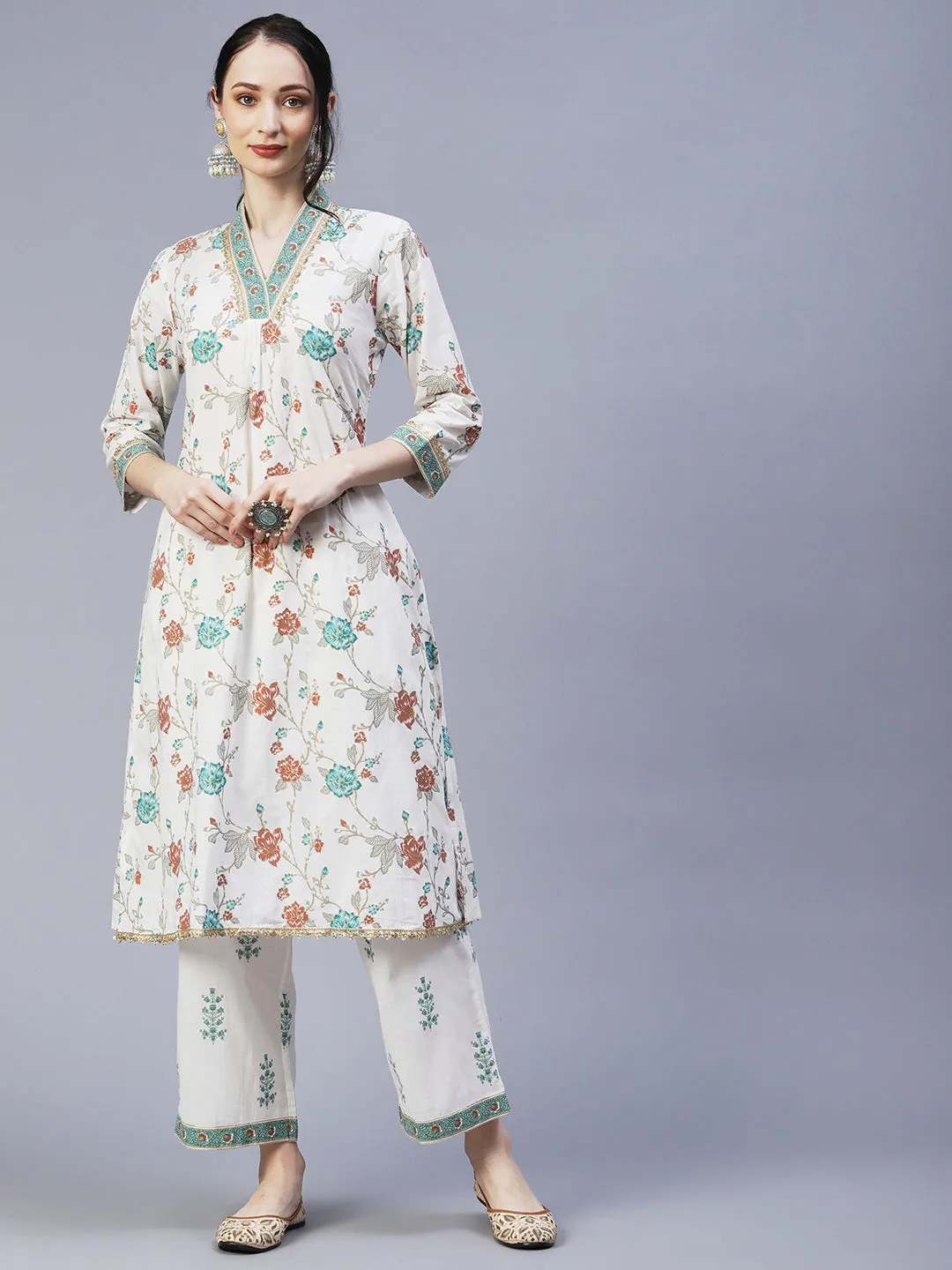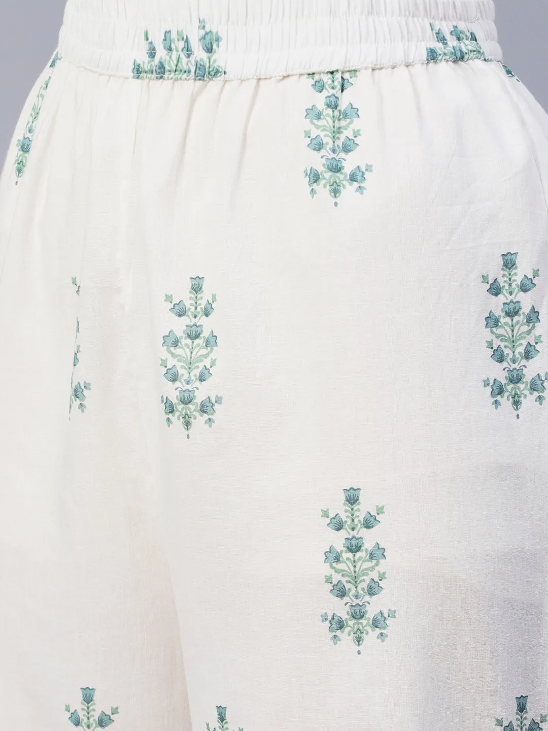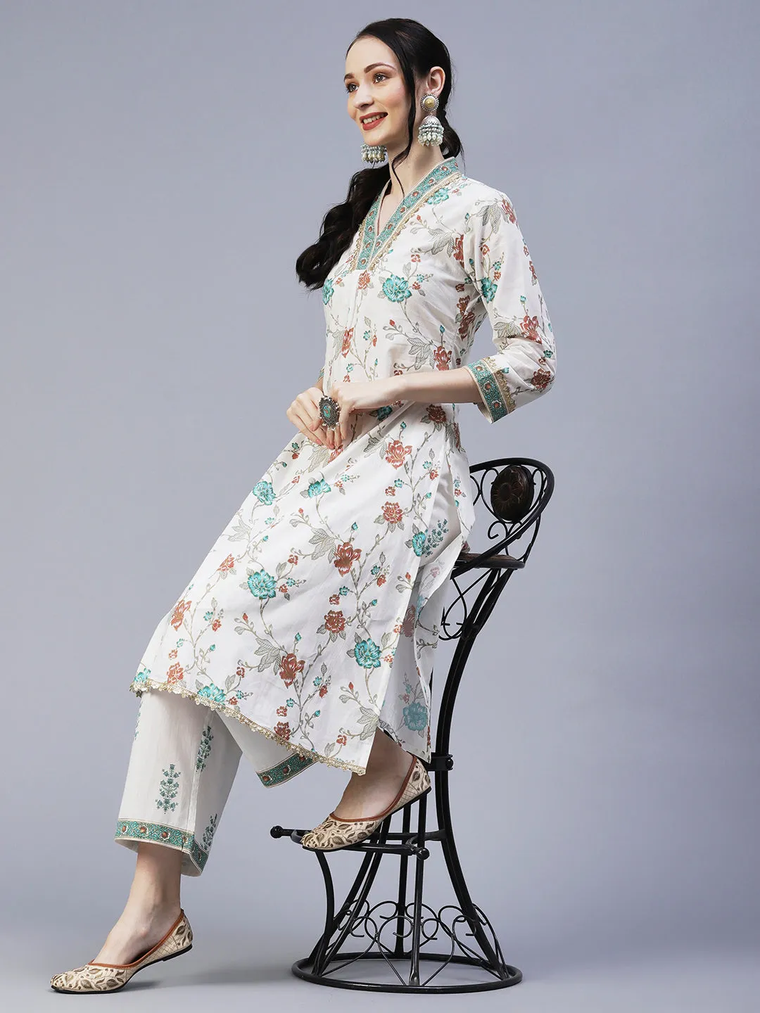 Ethnic Floral Foil Printed & Embroidered A-Line Kurta with Palazzo - Off White