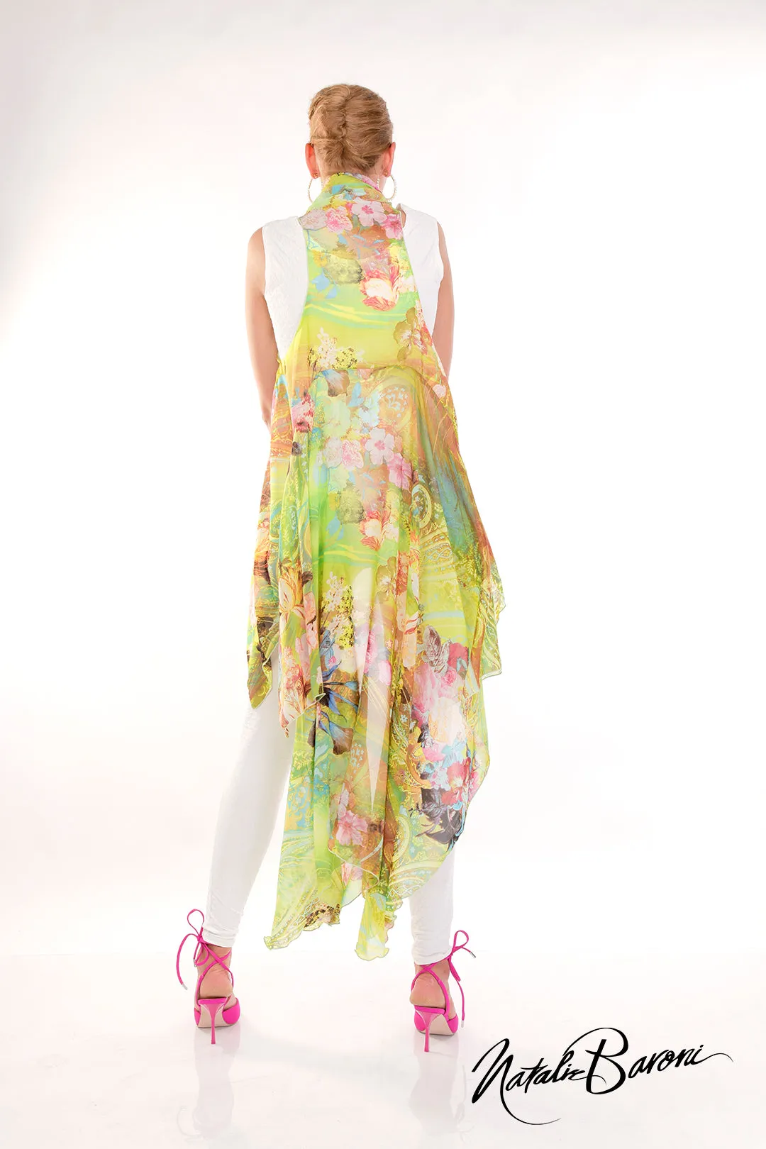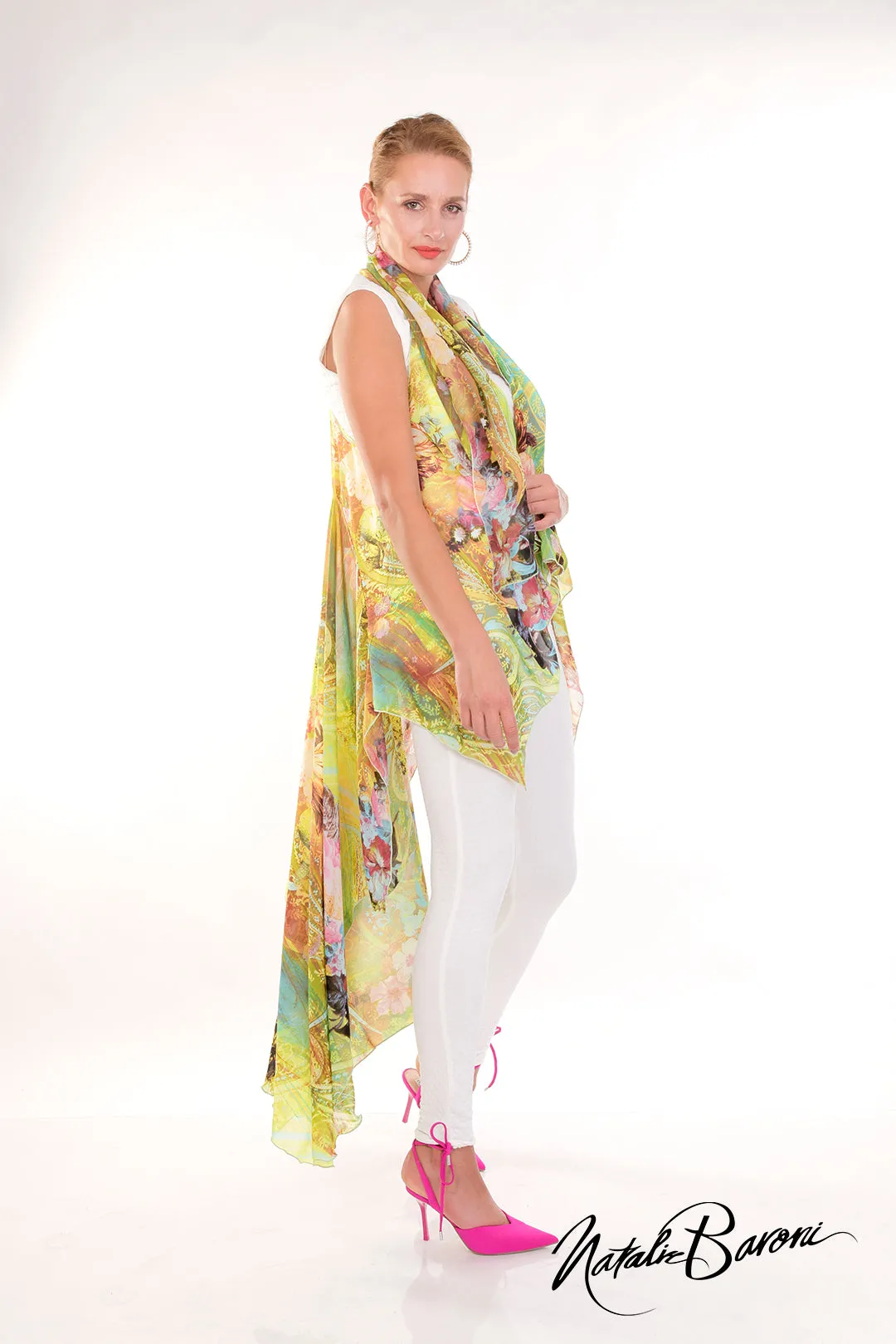 A gorgeous Chiffon Sleeveless Duster Features a Yellow and Pink Abstract Floral Pattern. Pair with white leggings and matching camisole. One Size.