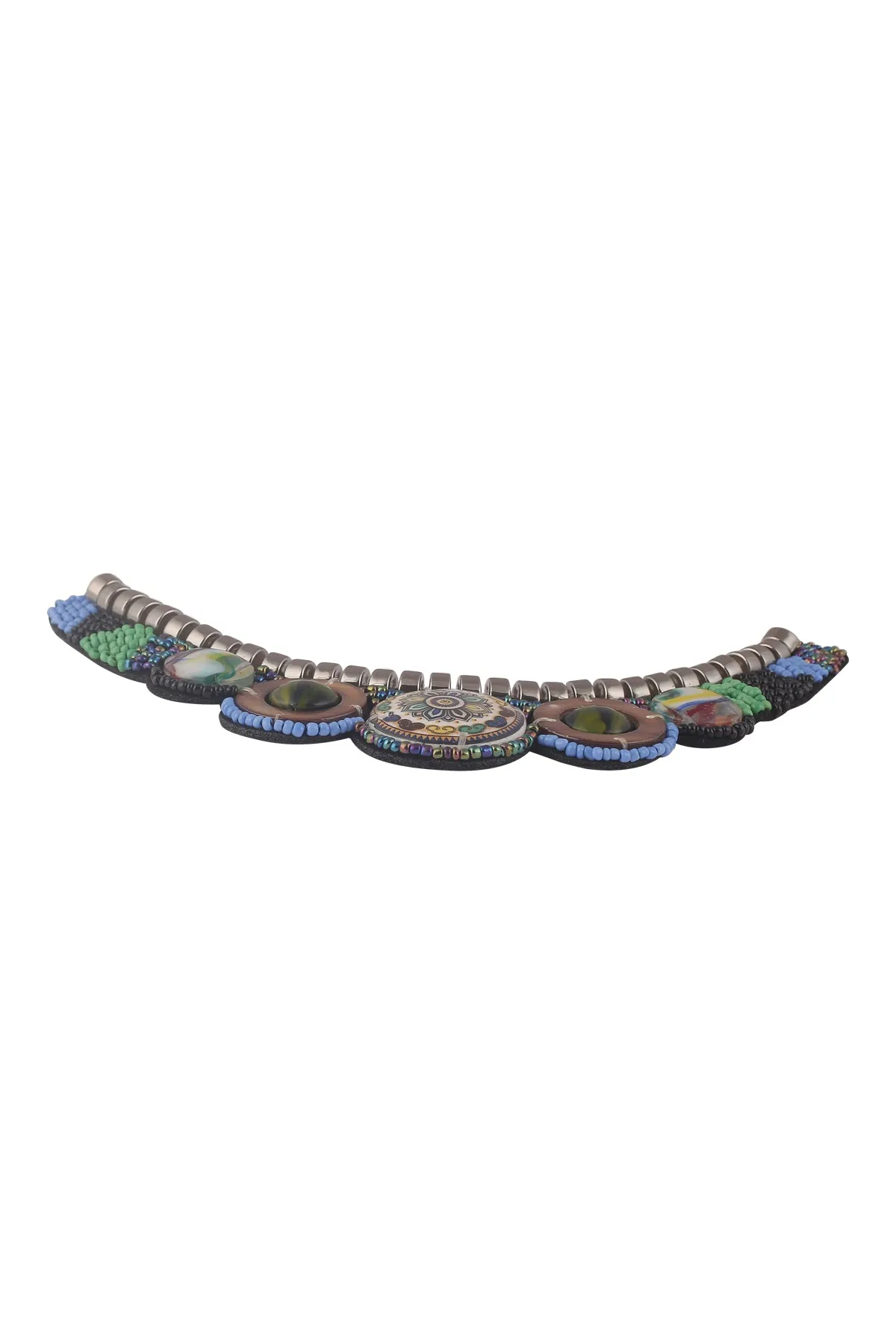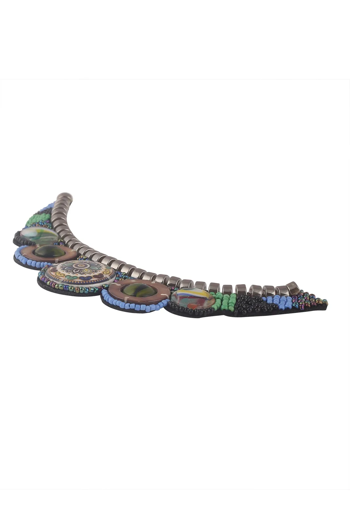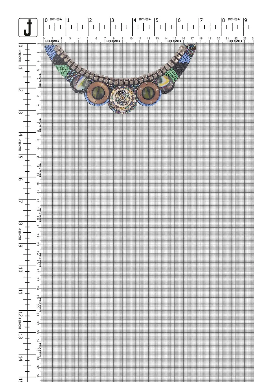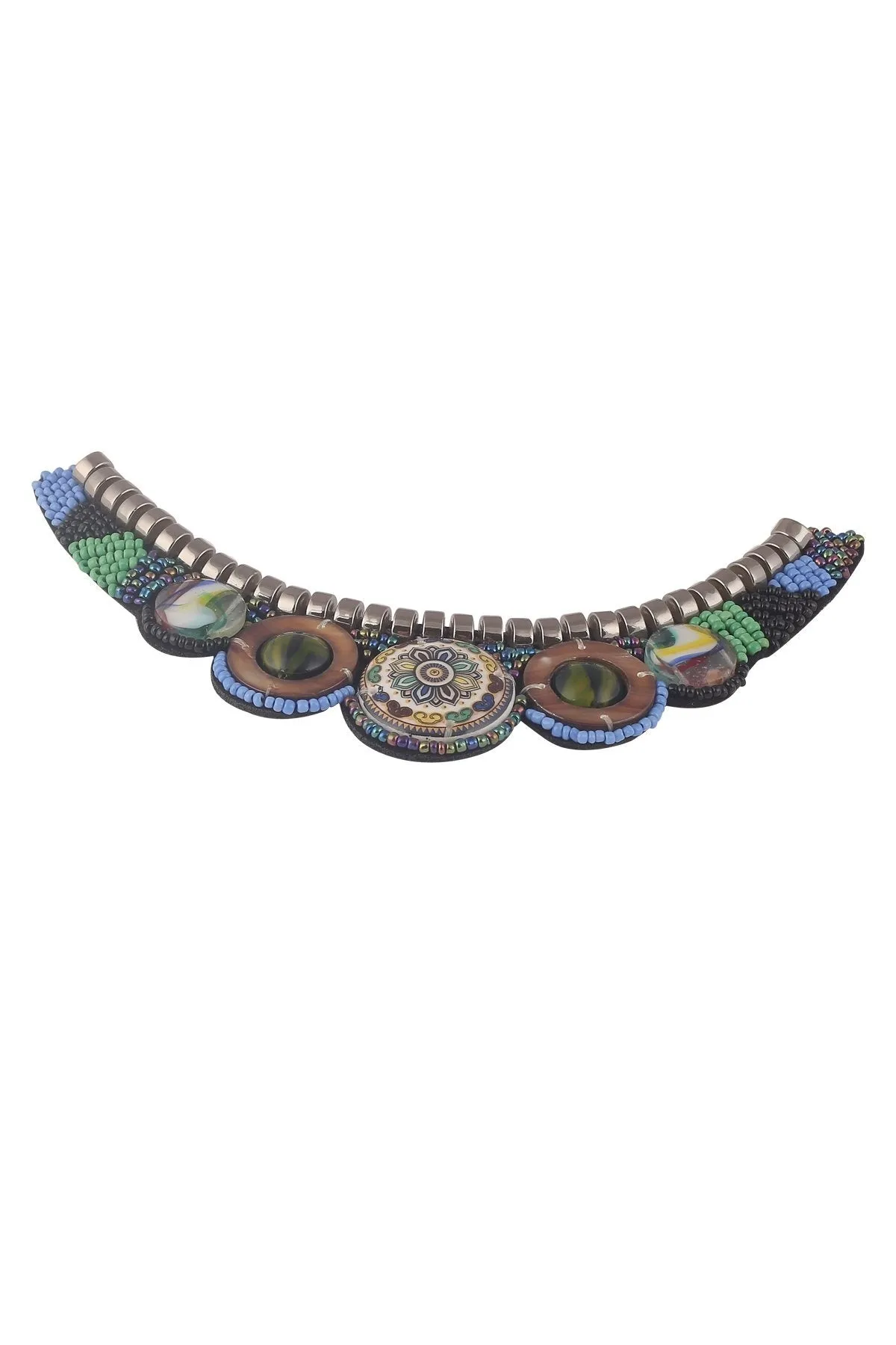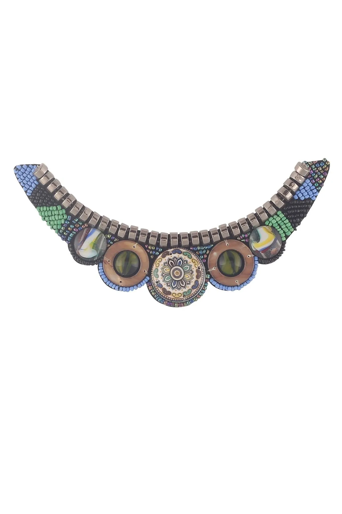 - Also used on denim jackets to give a boho look. Adds extra flair to the garment. This bohemian style neck is embellished with mix material like a ring, porcelain beads, seed beads, flat bottom marble beads & ABS lace with felt backing.