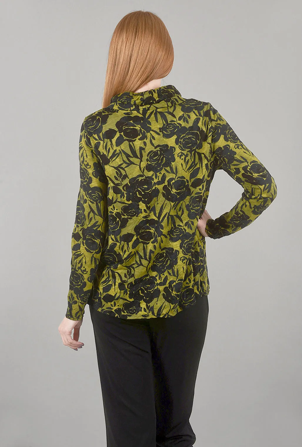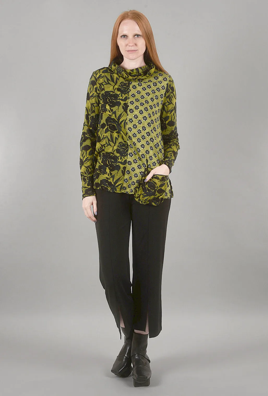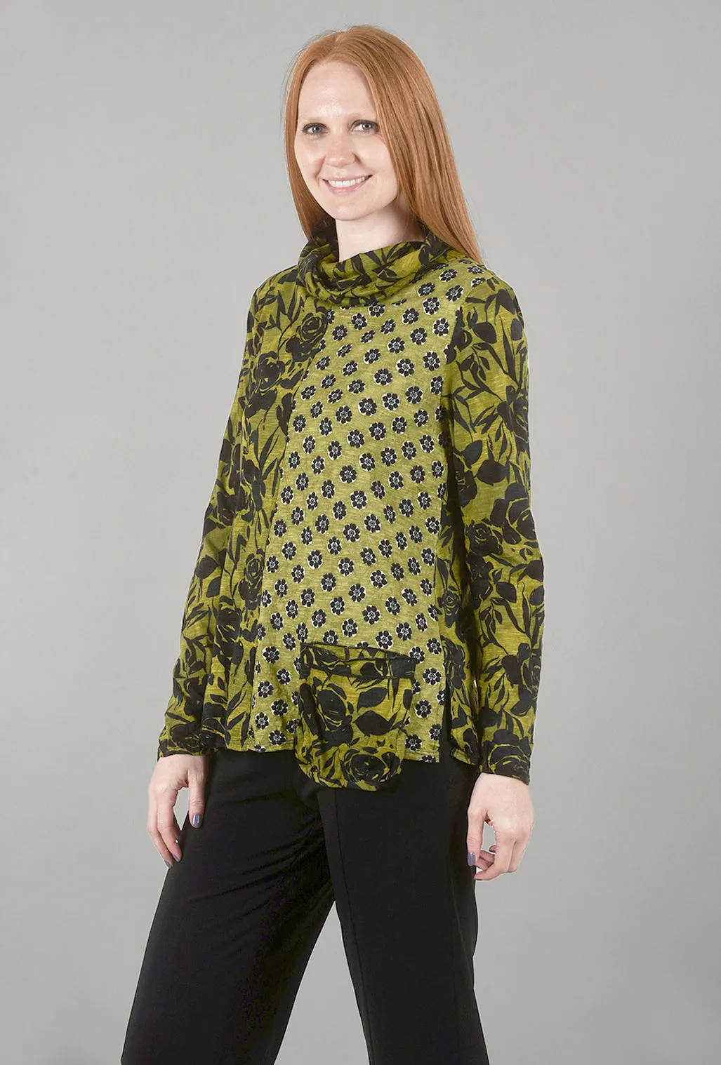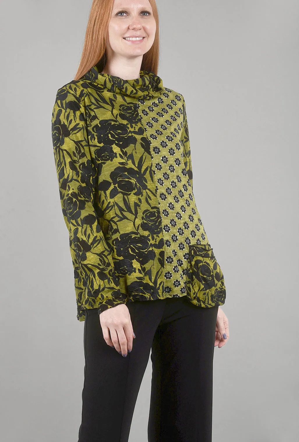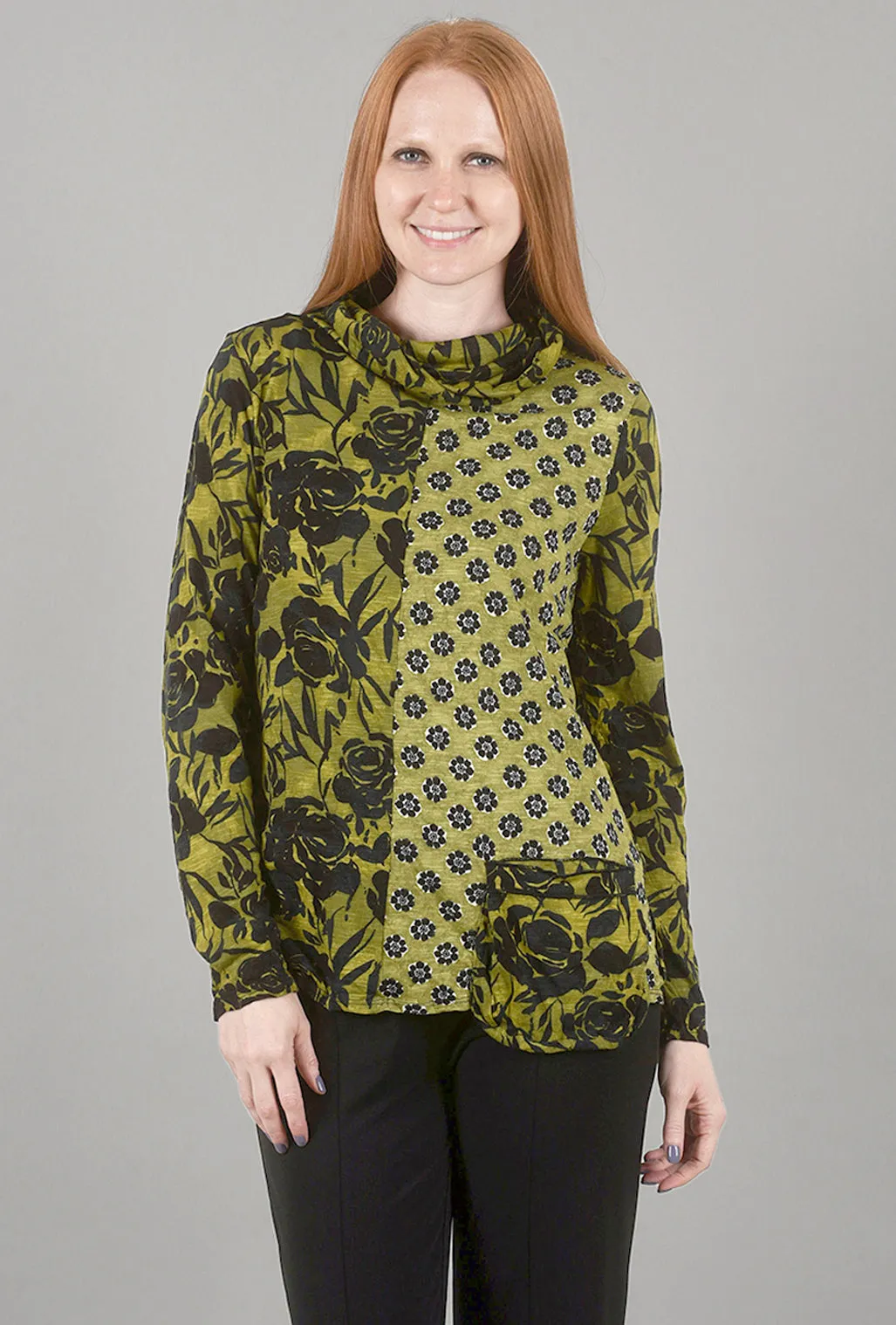 Such a fun mash-up of prints here! Floral FX has a cowl neckline and long sleeves; the silhouette is a trim A-line, hitting at the top of the hip. Done in a crinkled cotton knit blend, it is running true to size to slightly large.