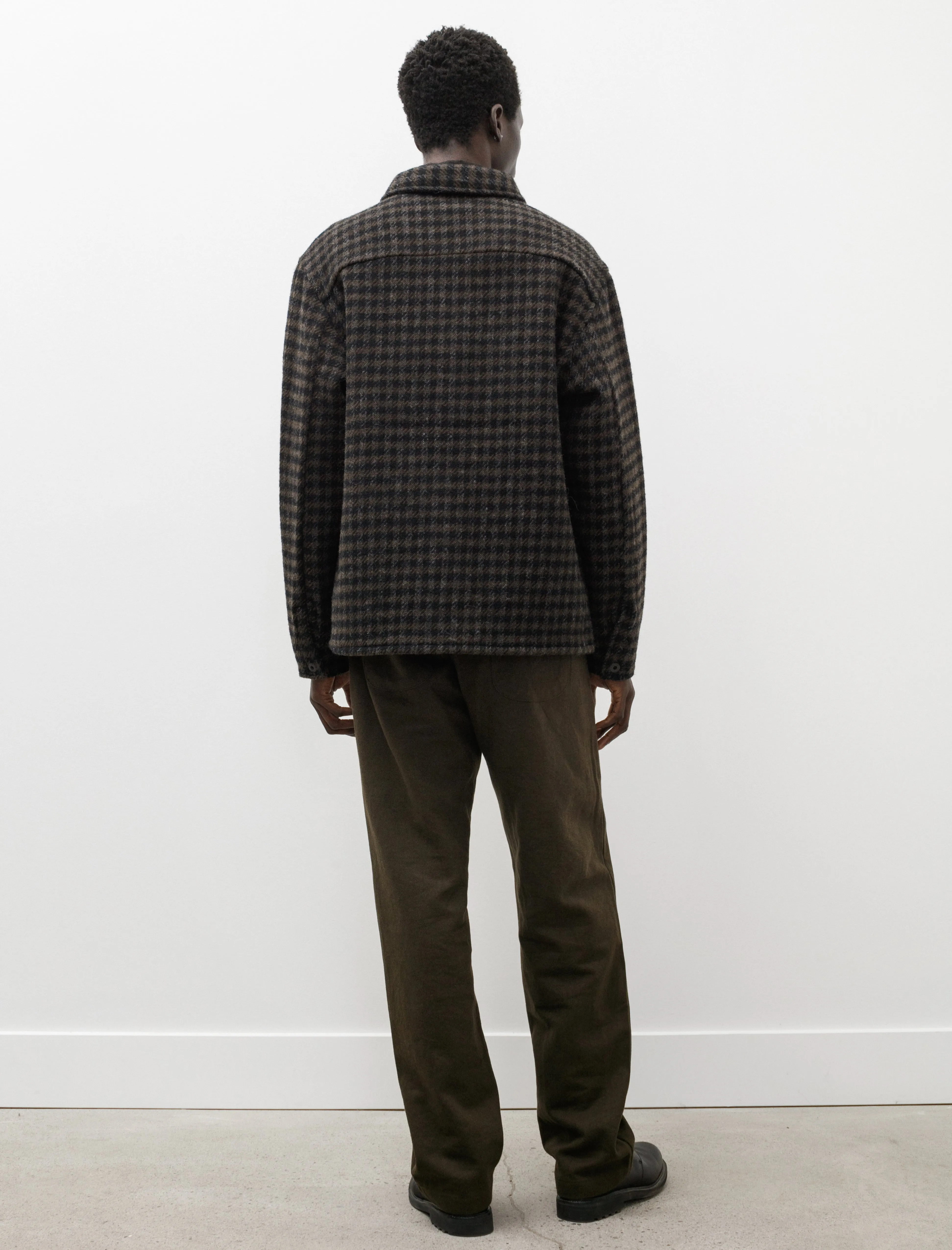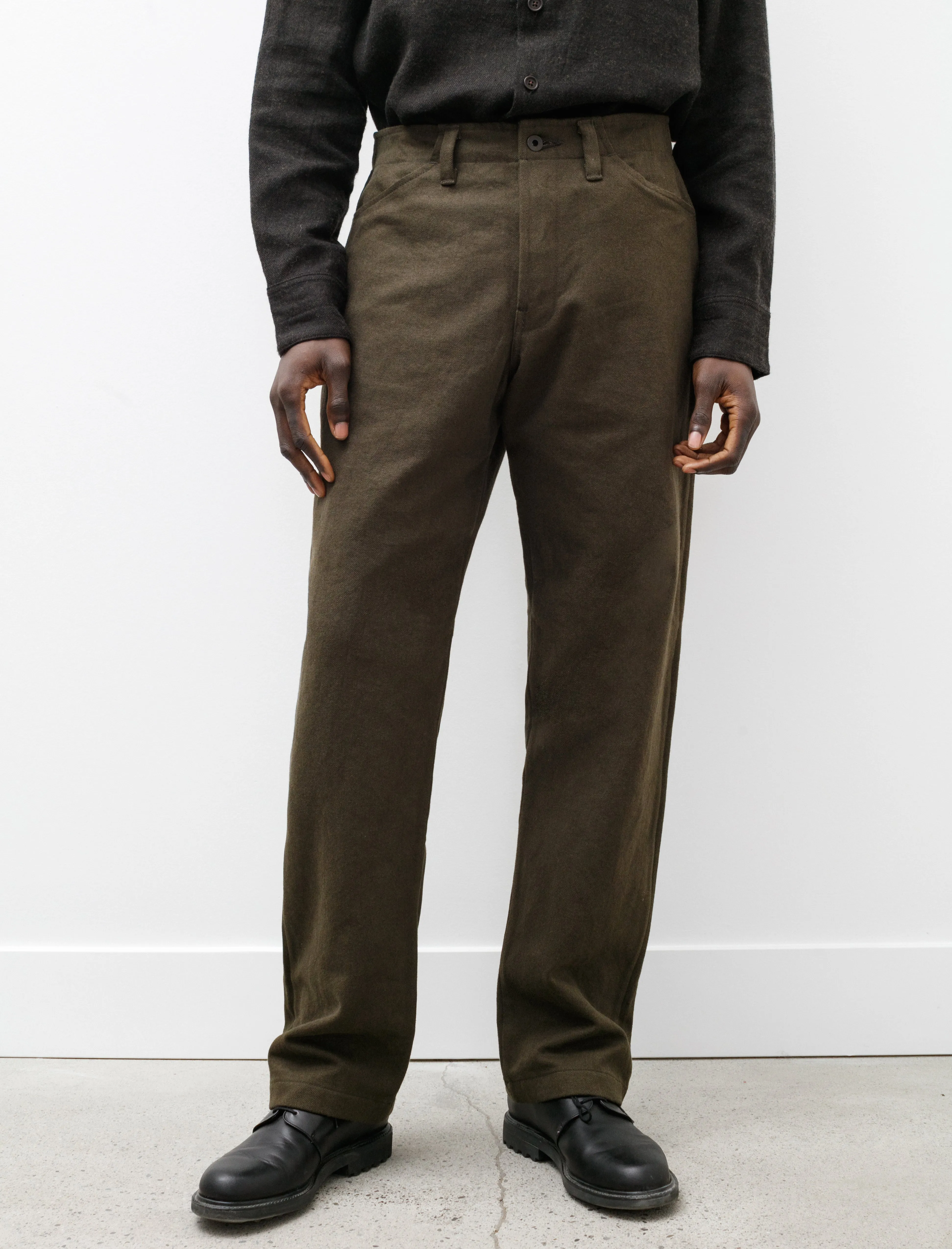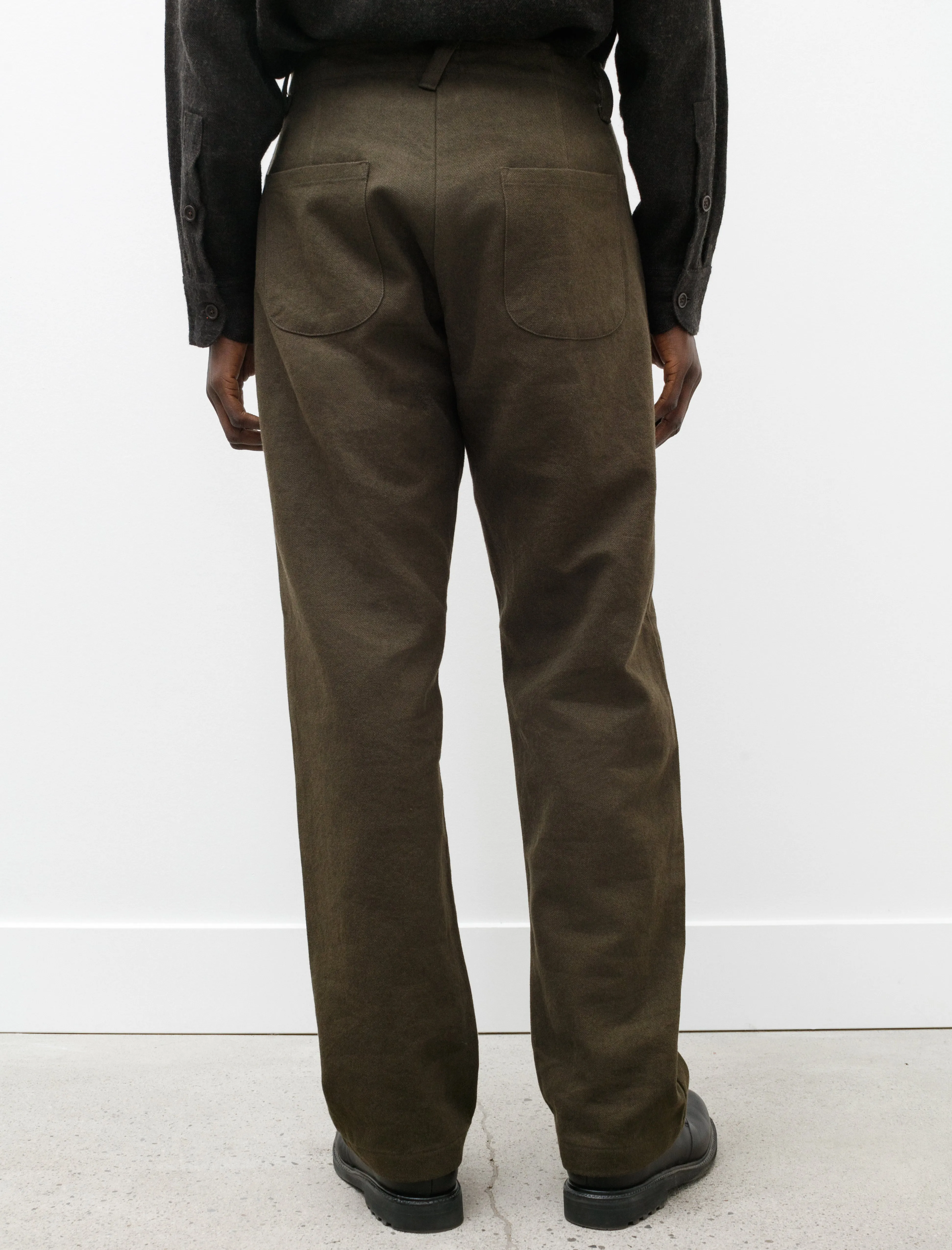 The longest running of Evan Kinori’s bottom styles, the Four Pocket offers a relaxed, straight leg reminiscent of classic denim; this edition is cut from a soft yet dense Japanese cotton/linen gabardine in a muted olive green. Feature a button fly with button closure, curved denim style front slash pockets, rounded rear patch pockets, and single needle belt loops. A straight, relaxed leg with a full length inseam offers a classic look that evokes utility while maintaining a subtle sense of elegance. Constructed with durable french seams throughout for a hard wearing finish that is built to last; leather washer backed YKK tack buttons throughout.