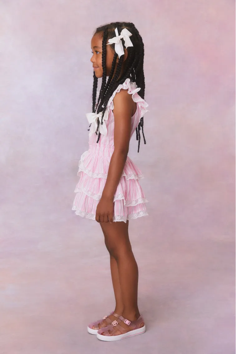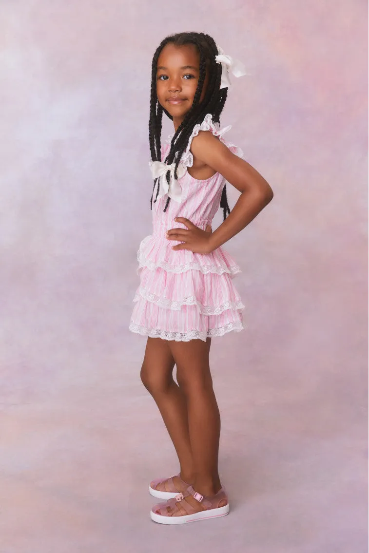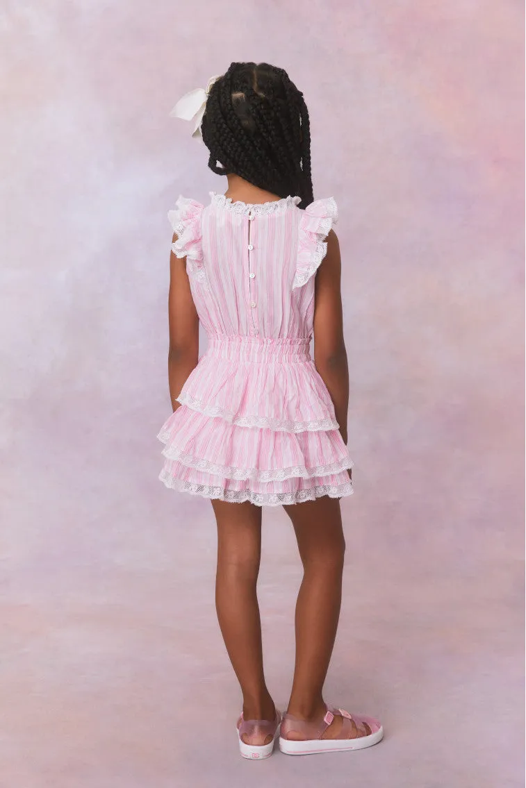 Our minis are sweet as can be in this darling Janelly Dress. Designed from a soft, organic cotton fabric, the dress features pink and white stripes all over. With a high neck, this piece stuns with short flutter sleeves, an elasticated waistband and asymmetrical ruffle tiers. Embroidered lace adorns the neckline, sleeves, and the tiers on the skirt.