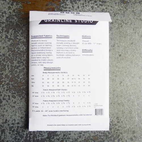 Medium to heavy weight woven coating such as melton, boiled, or felted wool. Recommended lining is rayon bemberg, kasha, or a similar lining fabric. Extra fabric is needed to match nap, plaids, stripes, or one-way design fabrics.