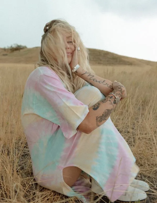 Featuring a colorful tie-dye style print.