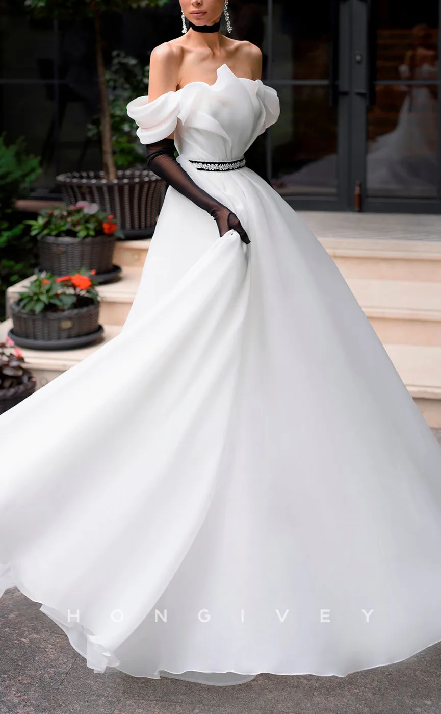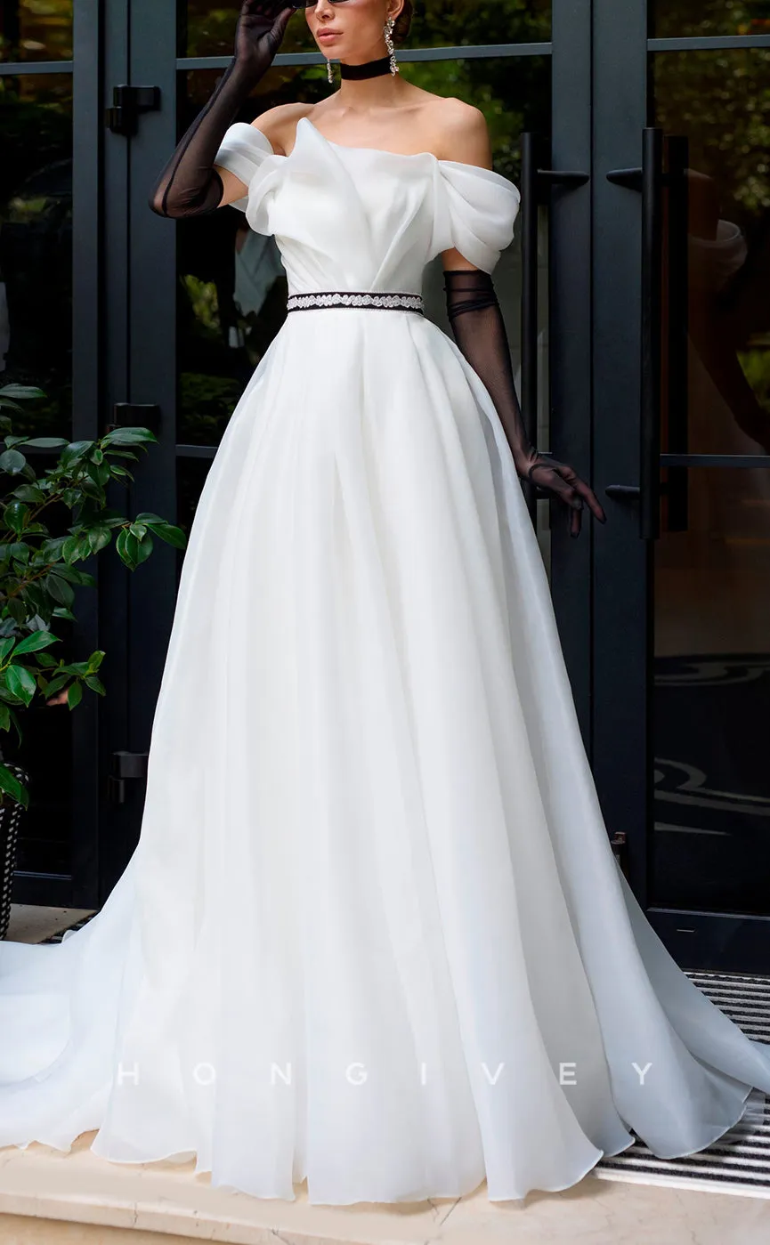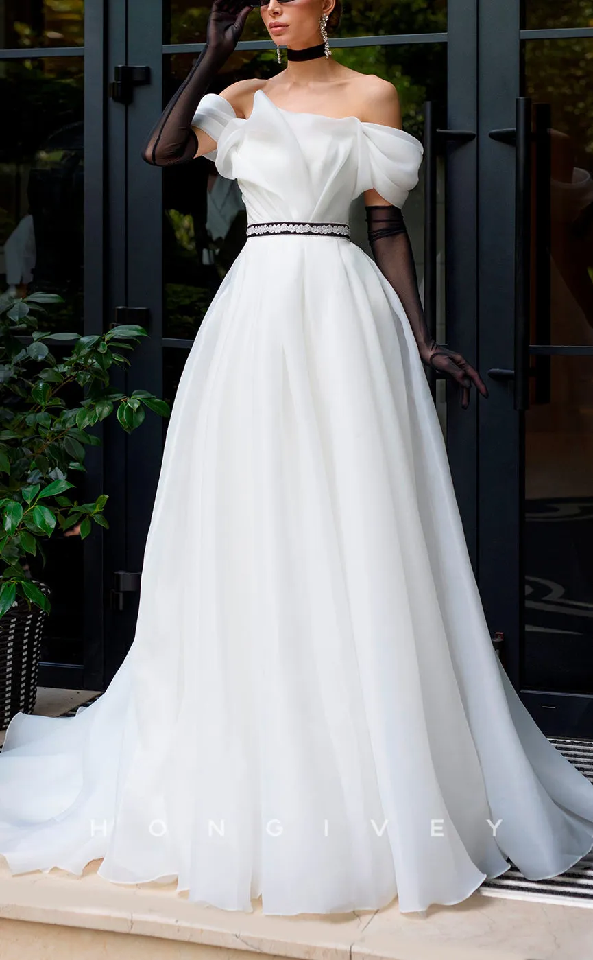 Look timelessly beautiful on your special day with this classic and timeless off-shoulder wedding dress. Featuring a ruched bodice and delicate lace sleeves, you'll be sure to make a statement. The finishing touches are the sashes that emphasize your silhouette. Perfect for a romantic and elegant wedding.