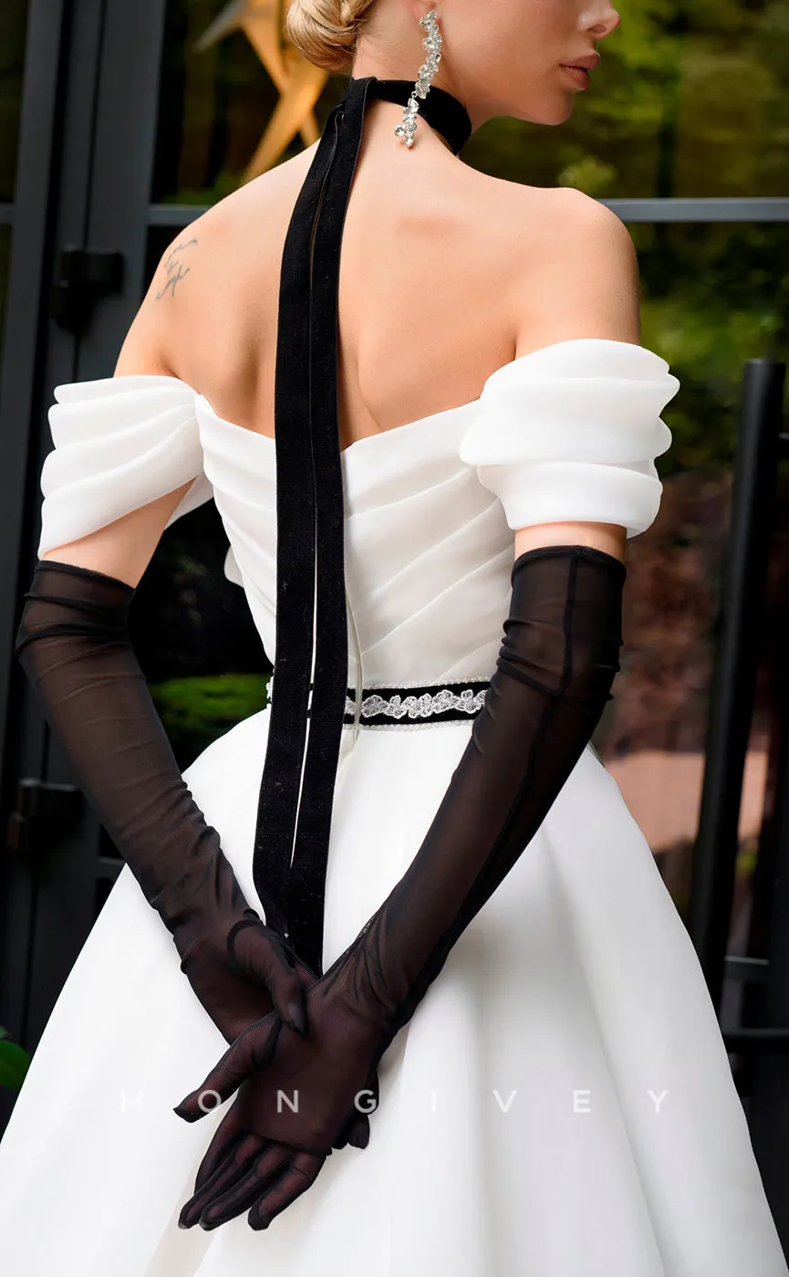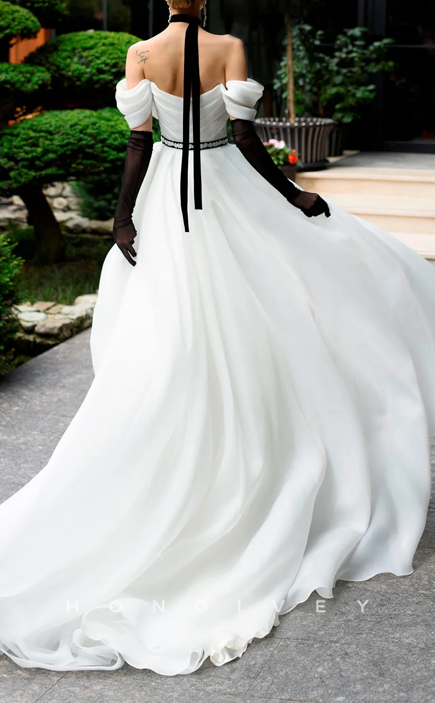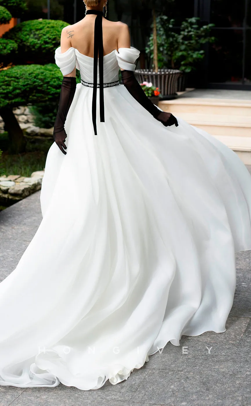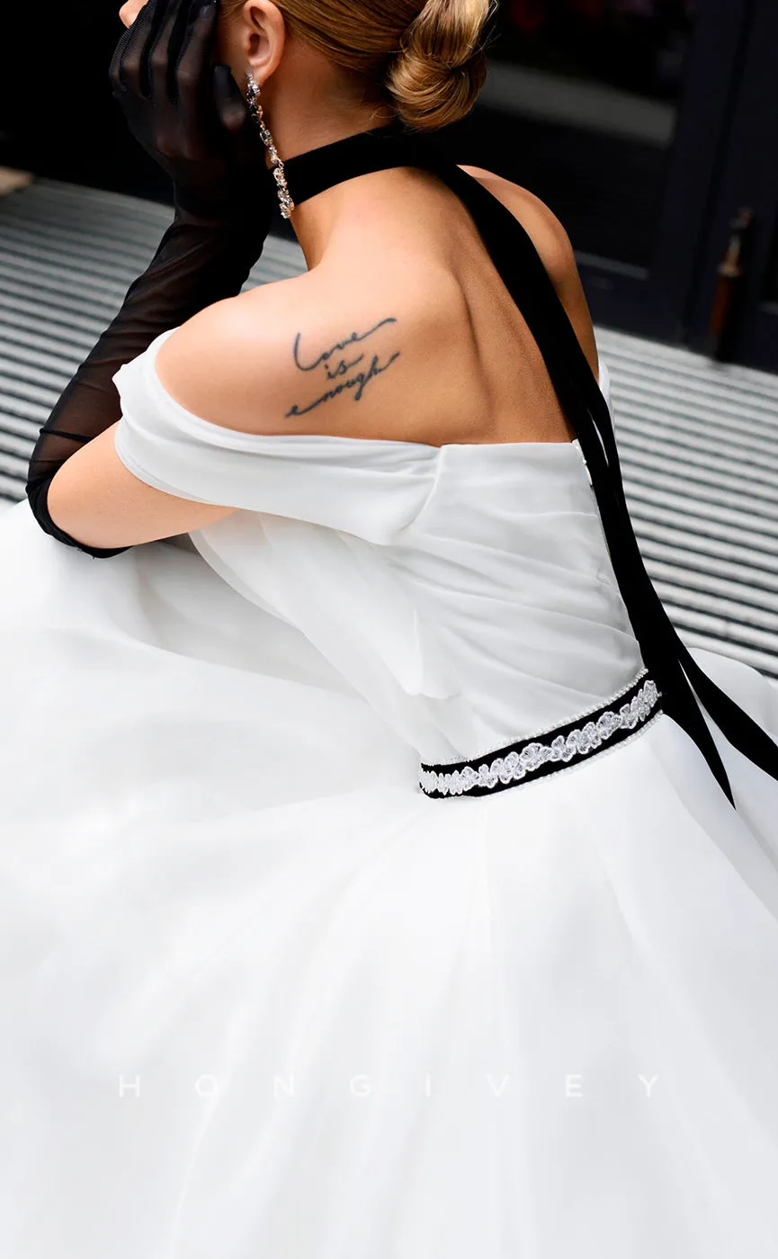 Look timelessly beautiful on your special day with this classic and timeless off-shoulder wedding dress. Featuring a ruched bodice and delicate lace sleeves, you'll be sure to make a statement. The finishing touches are the sashes that emphasize your silhouette. Perfect for a romantic and elegant wedding.