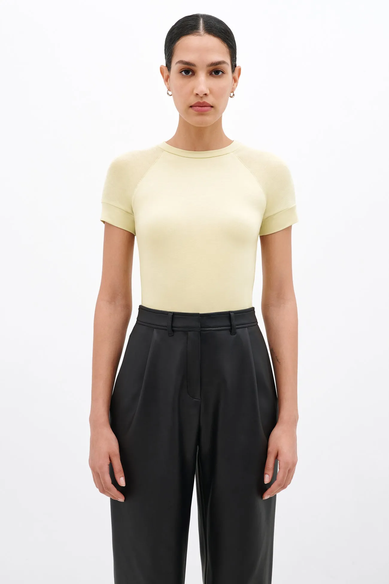 Our Harling is an elevated but still ever-so-comfy take on the baby tee. Starting with a classic fitted crewneck silhouette in opaque, sustainable European jersey, she adds raglan sleeves in sheer European jersey that are cuffed by more of our opaque jersey. Ready for day or night, Harling will provide a touch of luxe to any of your outfits.[SPLIT]
