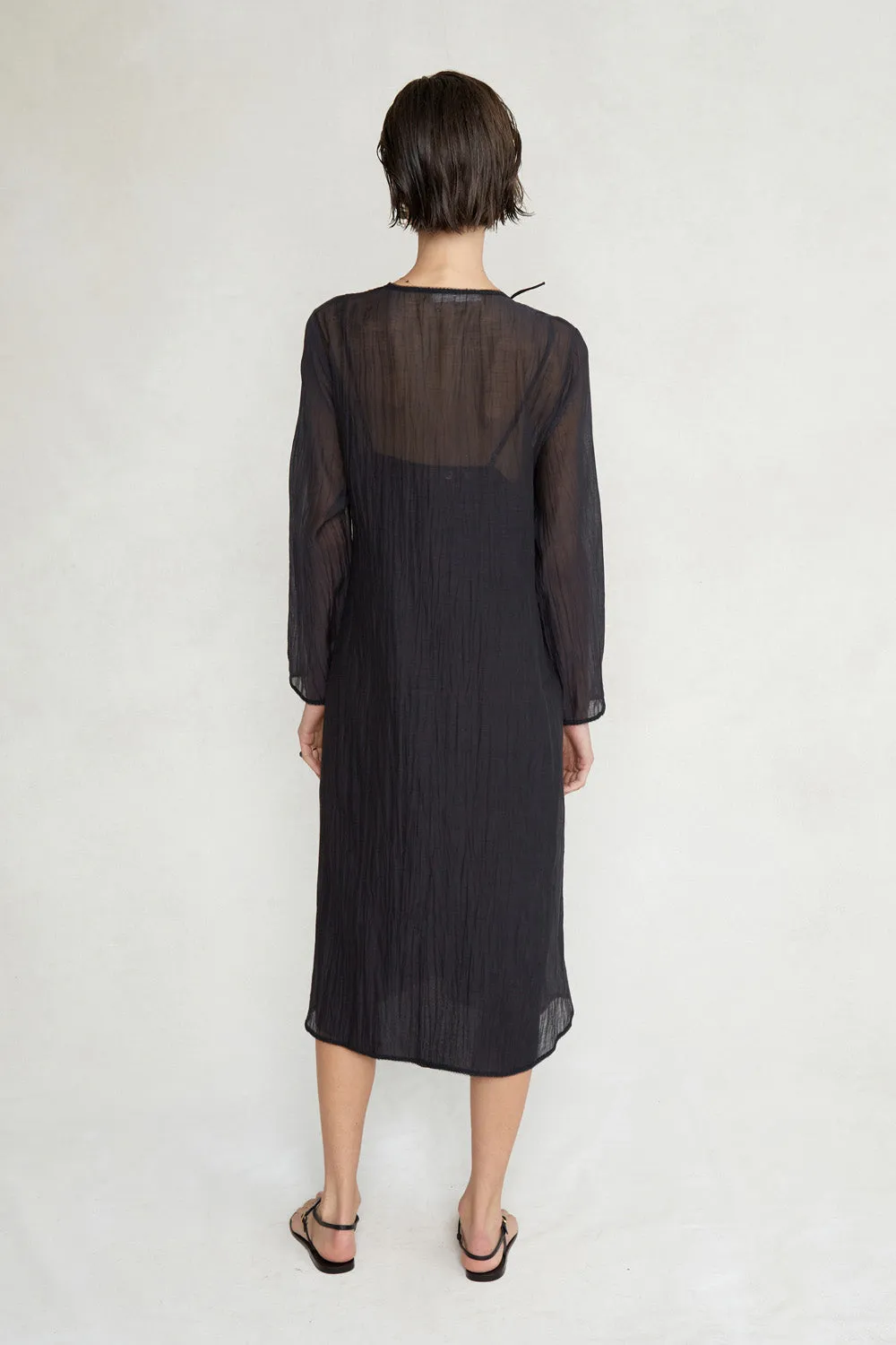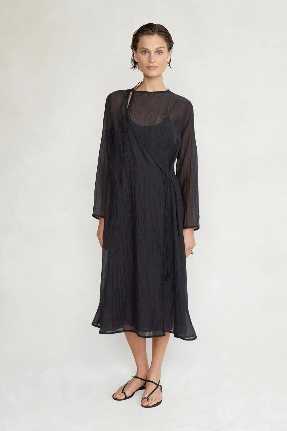 Our Heather Wrap Dress features an elegantly draped cut and fastens with asymmetrical ties in the front with beaded details.