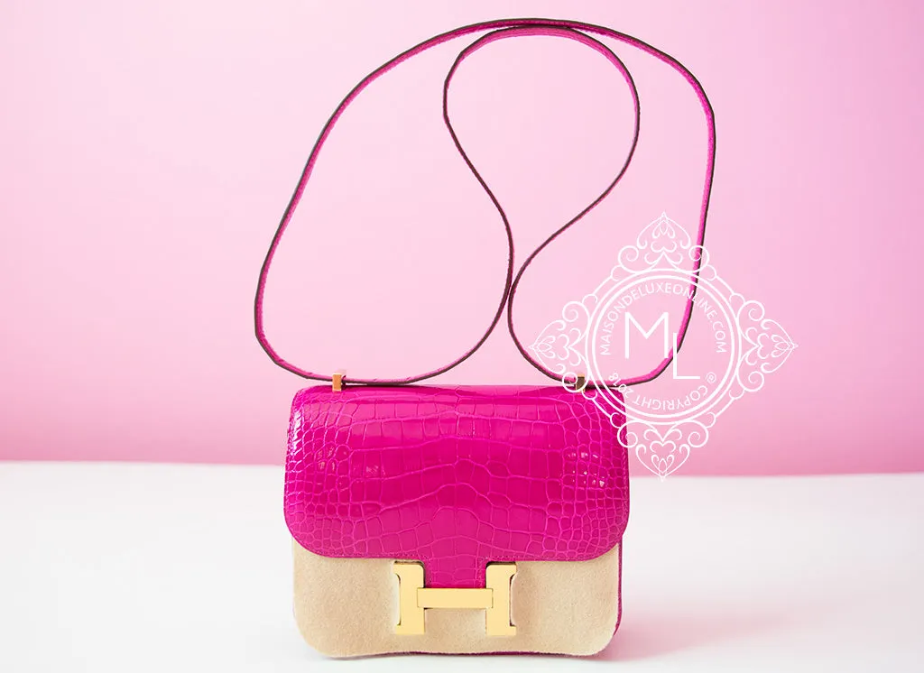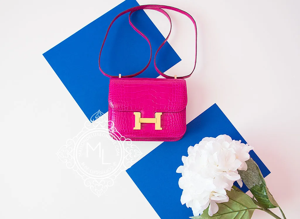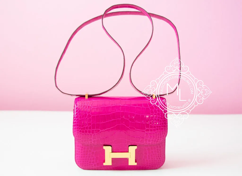 A classic Hermes bag that can be as hard to find as the Birkin or Kelly bag. This authentic Hermes Constance in Rose Scheherazade, made of alligator leather, exudes luxury. The rose gold hardware compliments the various hues that emerge. The Constance bag is a comfortable and chic shoulder bag that can be worn casually or as a centerpiece. The Constance bag is a must have addition to any Hermes collection.