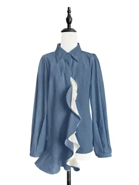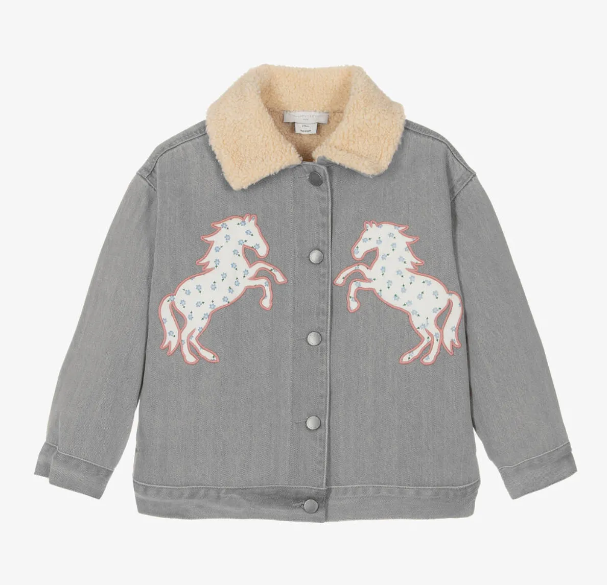 Cosy grey denim jacket for girls by British brand Stella McCartney Kids, with rearing horse appliqués on the front in white, pink and blue. It has a warm, ivory fleece collar with a matching lining, and fastens with grey logo buttons on the front and cuffs. There are useful, concealed pockets on the side seams. The Stella McCartney fit can be quite small so choose a size up if you want room to grow.