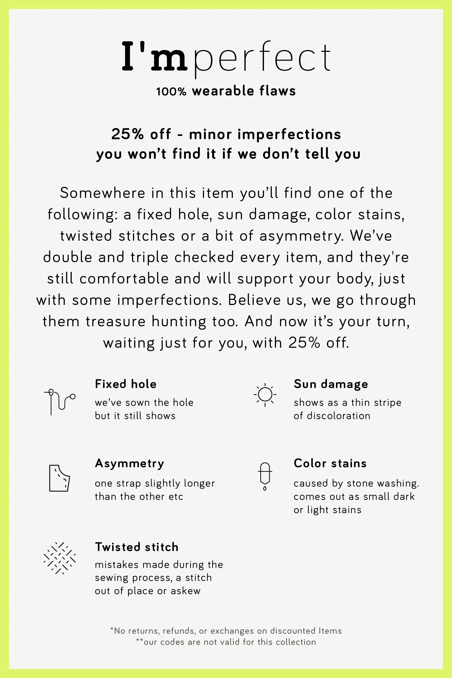 Somewhere in this item, you’ll find one of the following: a fixed hole, sun damage, color stains, twisted stitches, or a bit of asymmetry.