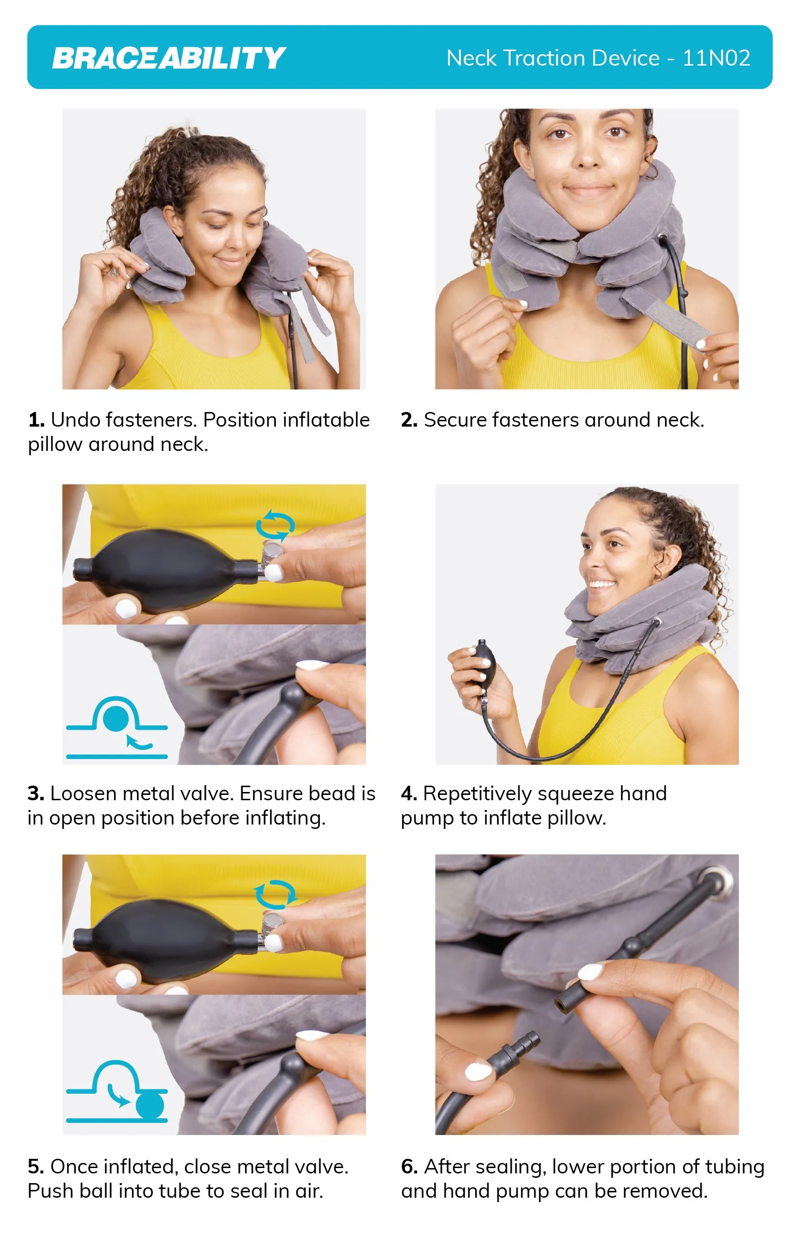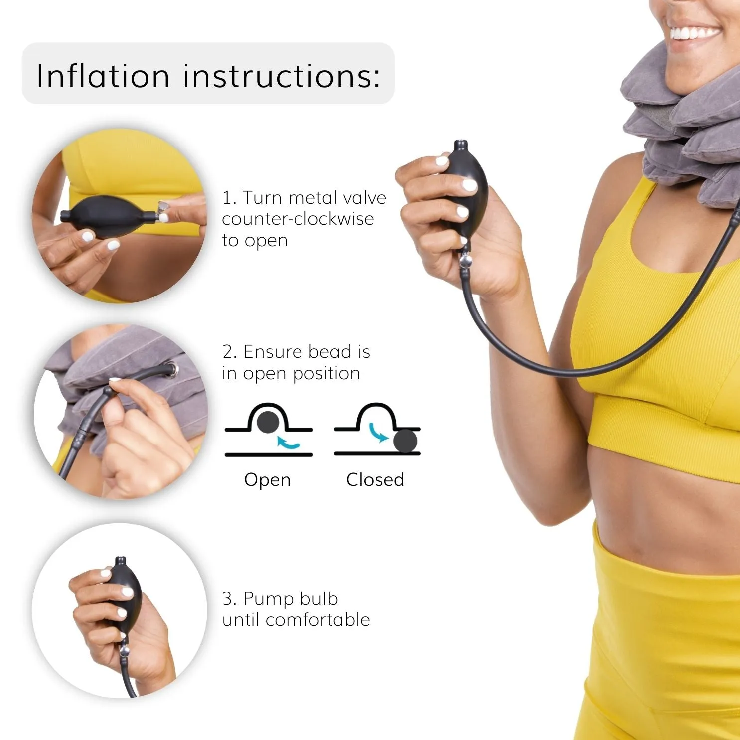 Control the amount of stretch you receive using the attached pressure pump for personalized neck pain relief. Inflate the neck pillow easily, close the metal valve, and ensure the bead is pushed into the tube to seal in the air. After sealing the air, remove the lower portion of the tubing and hand pump to avoid carrying anything extra while using the inflated neck brace.