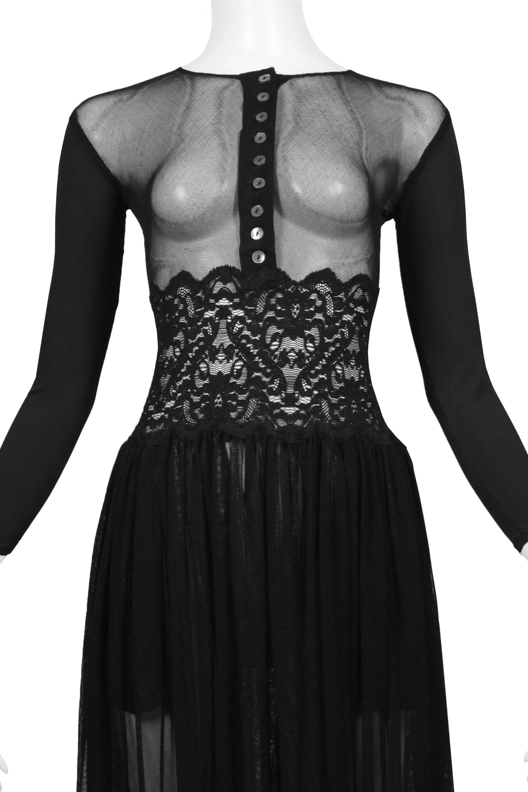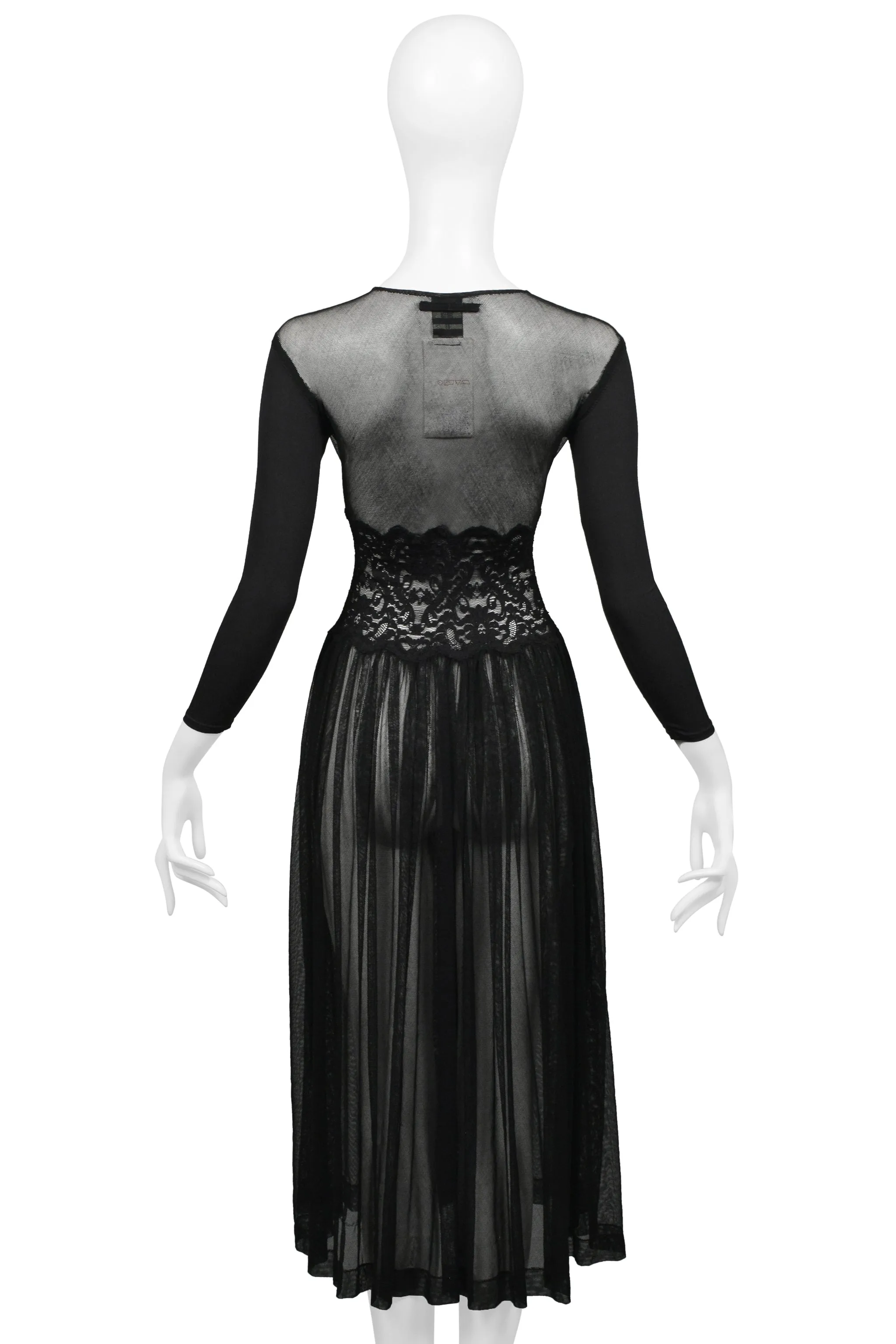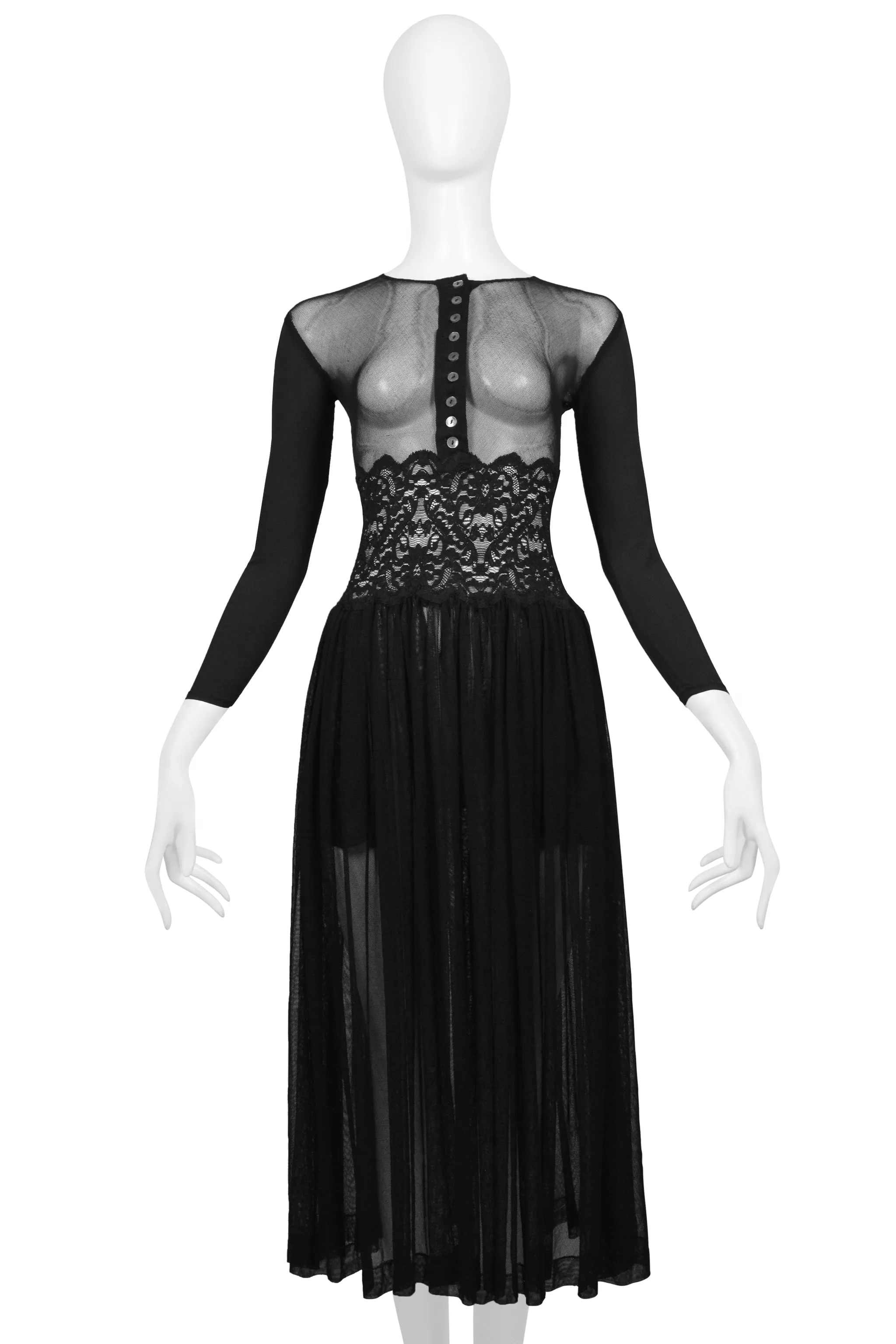 Resurrection Vintage is excited to offer a vintage Jean Paul Gaultier black mesh dress featuring solid sleeves, a sheer bodice with button front, lace waist detail, and gathered skirt.