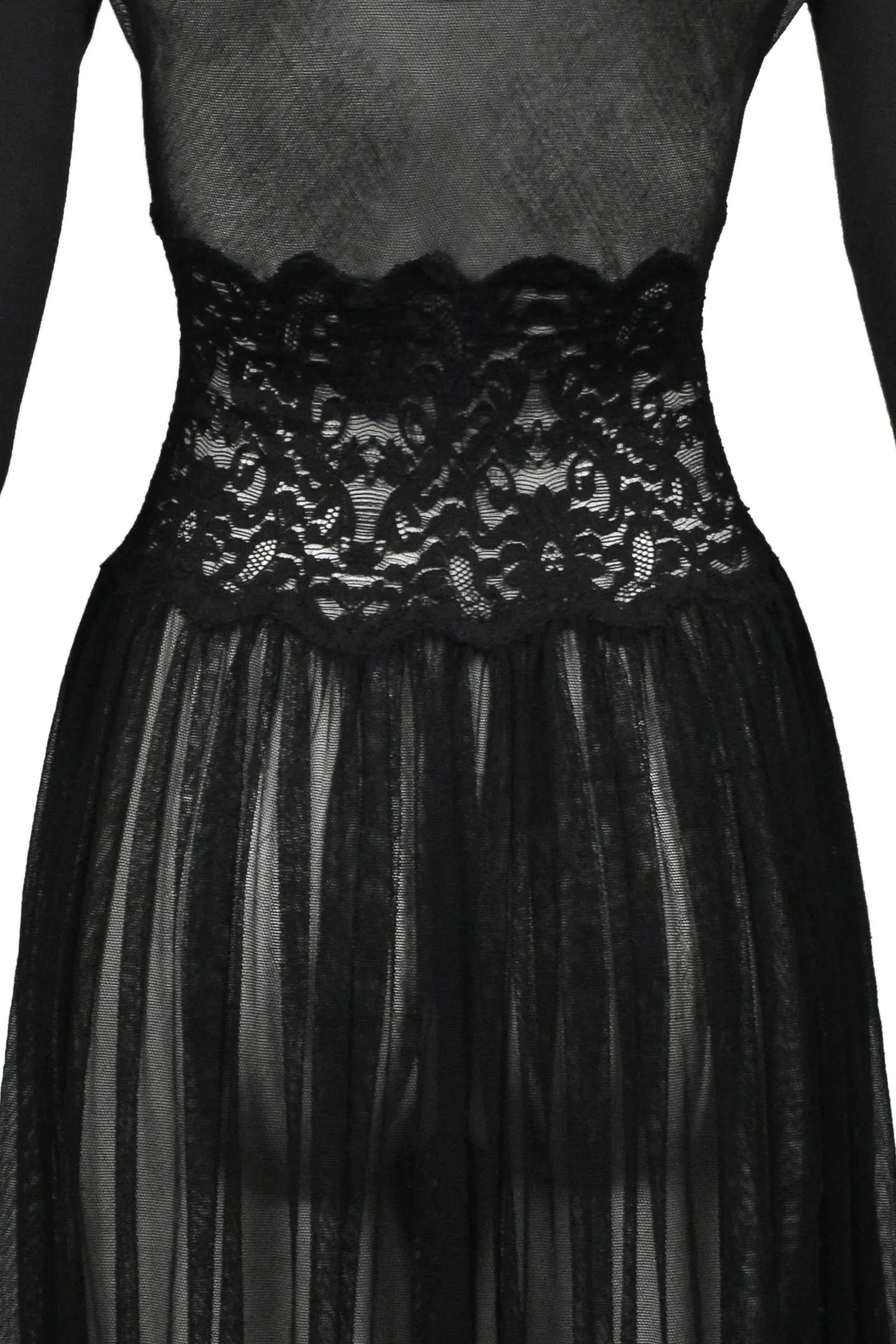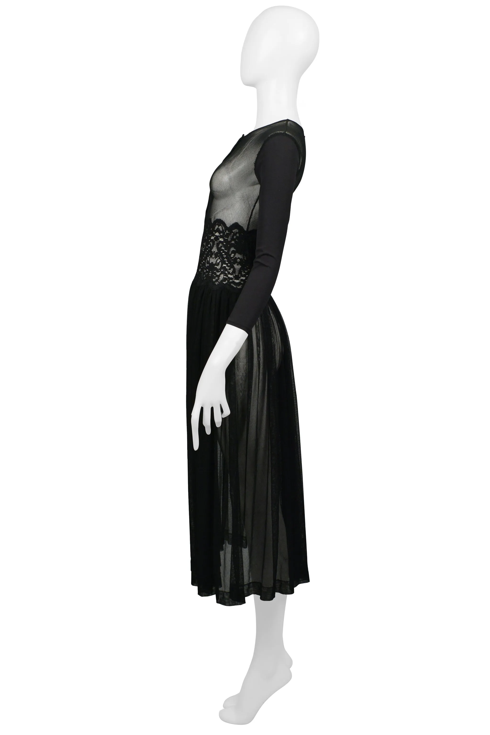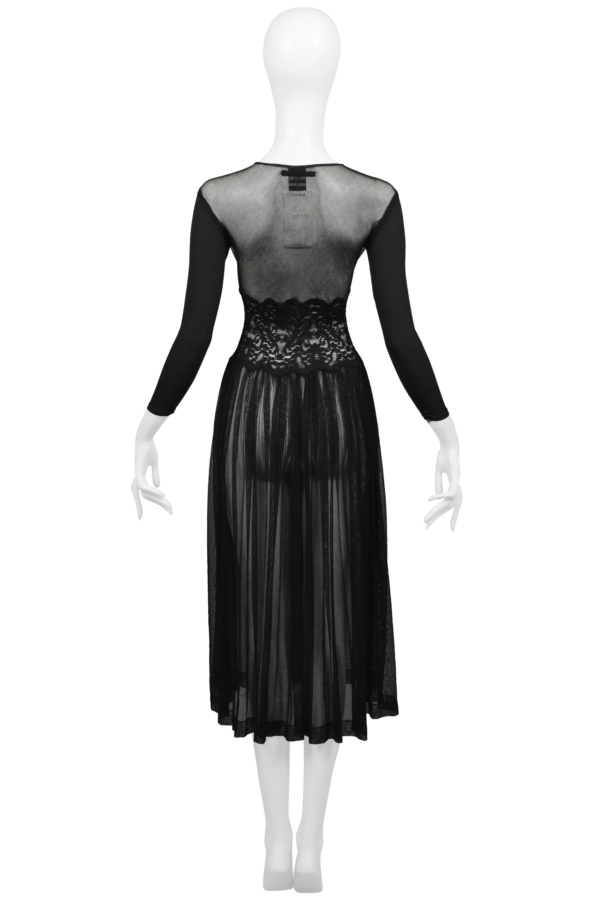 Resurrection Vintage is excited to offer a vintage Jean Paul Gaultier black mesh dress featuring solid sleeves, a sheer bodice with button front, lace waist detail, and gathered skirt.