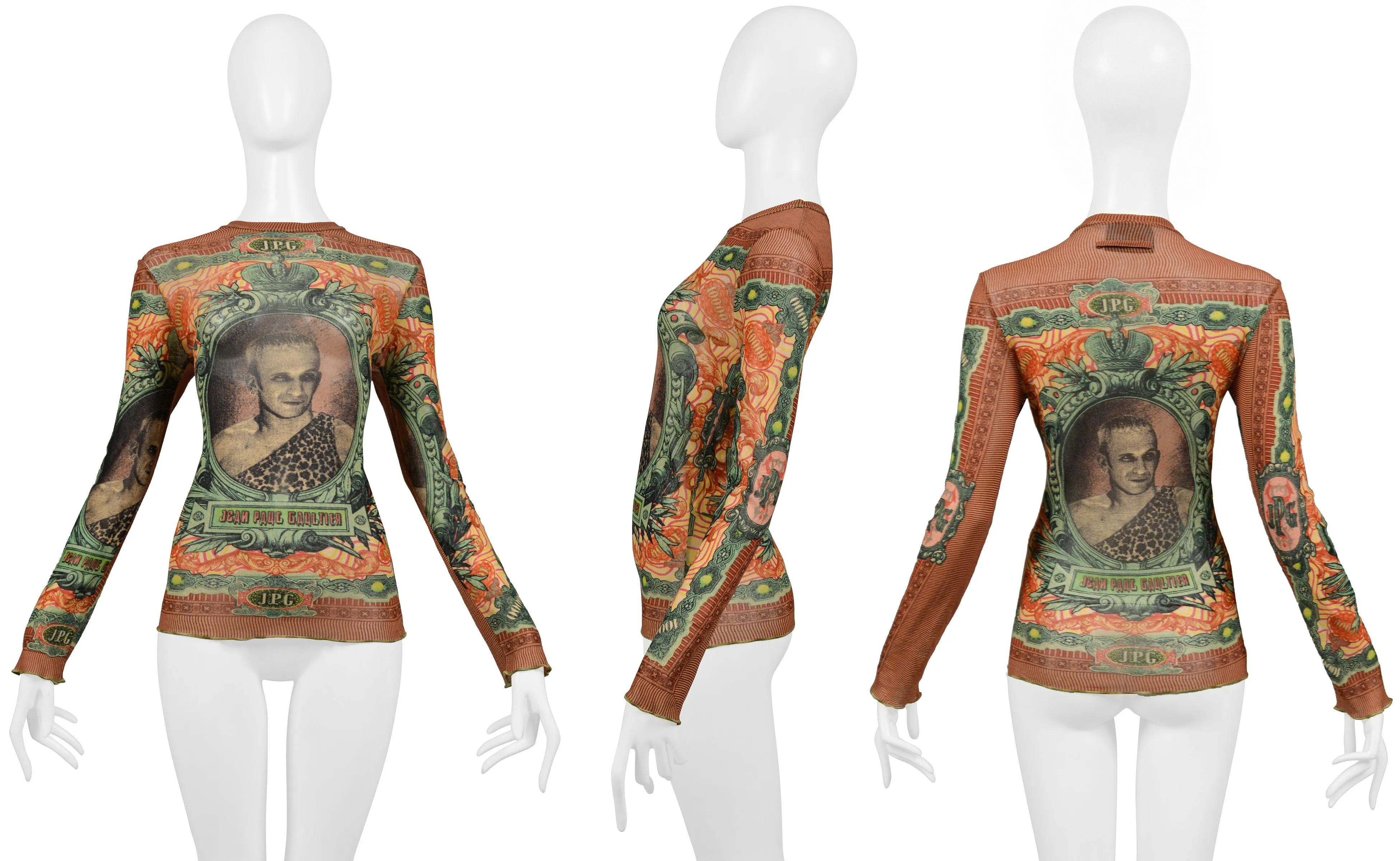 Resurrection Vintage is excited to offer a vintage Jean Paul Gaultier 1994 multicolor print stretch mesh top featuring a portrait of Gaultier, long sleeves, and fitted body.