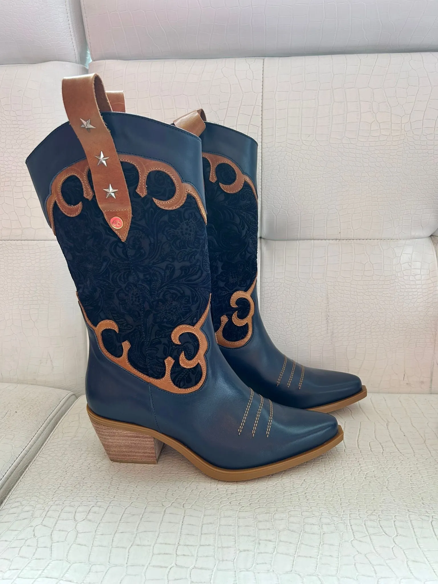 Discover the exquisite blend of navy and tan in our Jewel boot. This 3/4 length cowboy boot is the perfect addition to your wardrobe, effortlessly complementing all your outfits. Made with a soft leather upper and lining, and featuring a rubber sole and zipper opening, this boot is both stylish and comfortable.