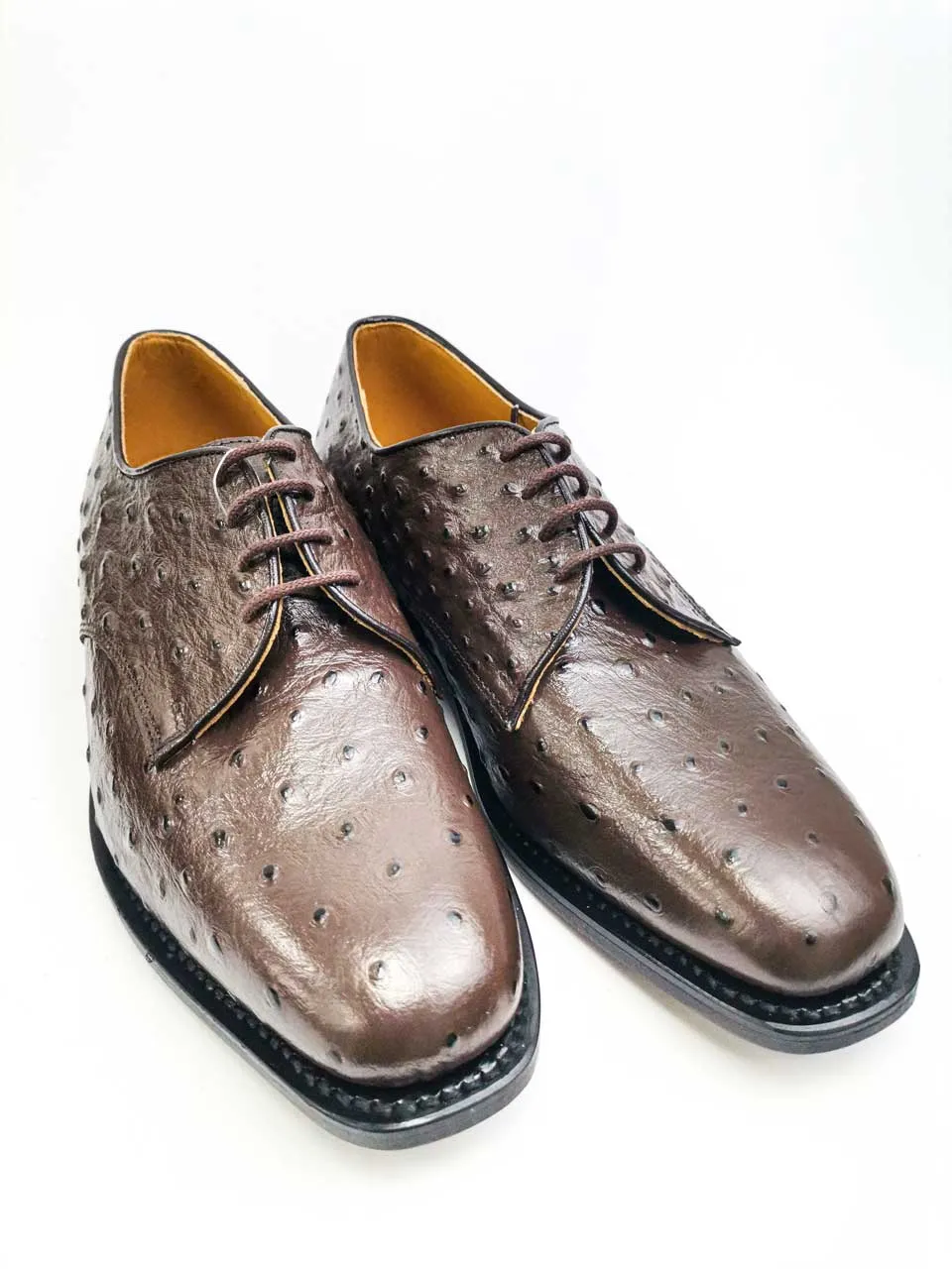 The JOHNSTON & MURPHY OSTRICH LEATHER CHOC dress shoe combines luxury with timeless style, making it a standout choice for formal occasions. Crafted from genuine ostrich leather, these shoes feature a unique texture and pattern that exudes sophistication and exclusivity. The rich chocolate brown color adds warmth and versatility, complementing a range of formal attire from suits to dress trousers.