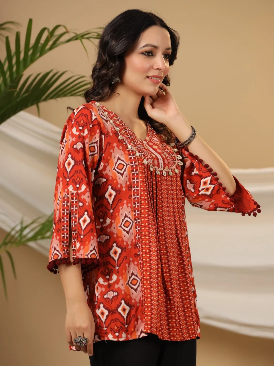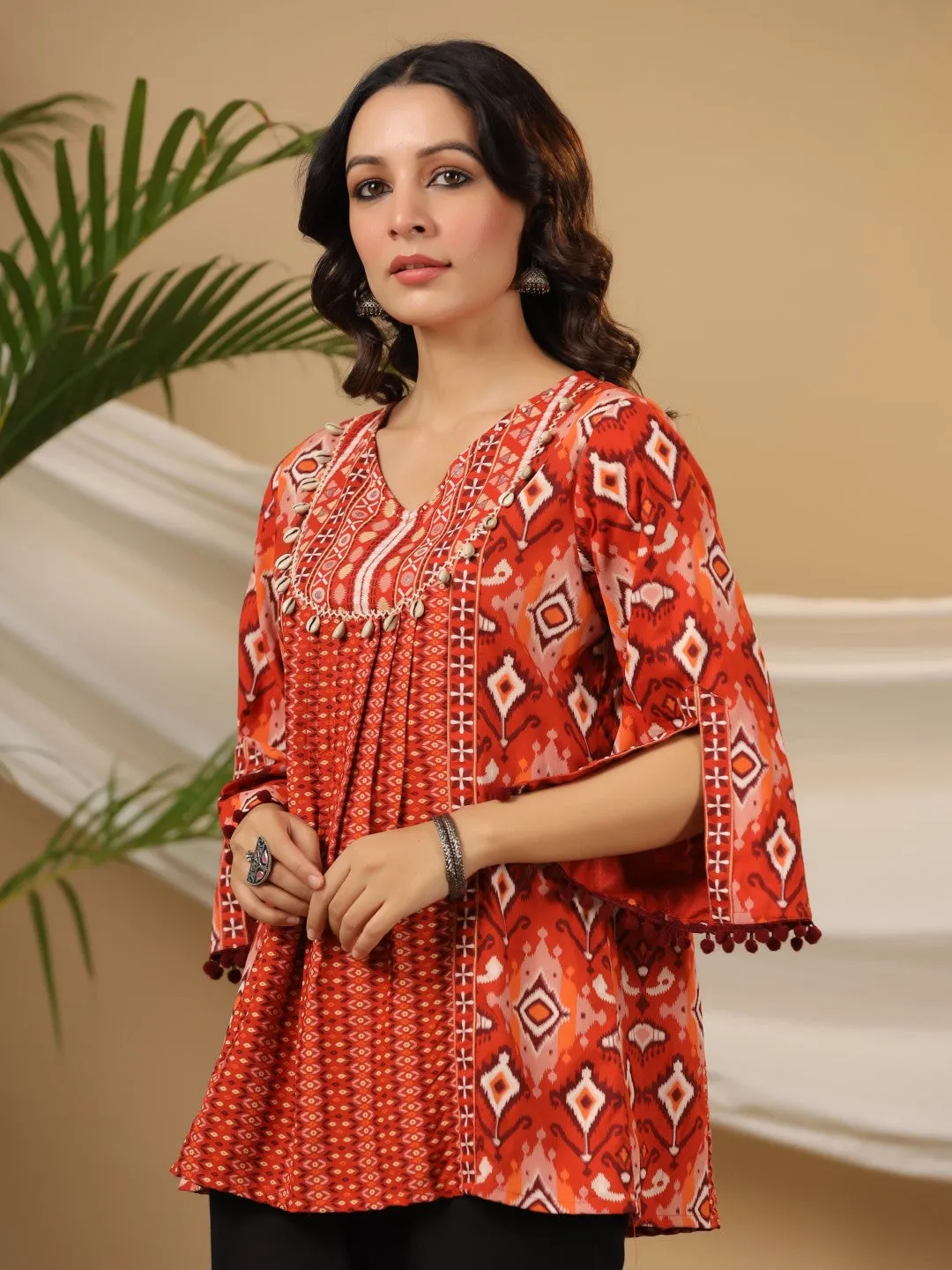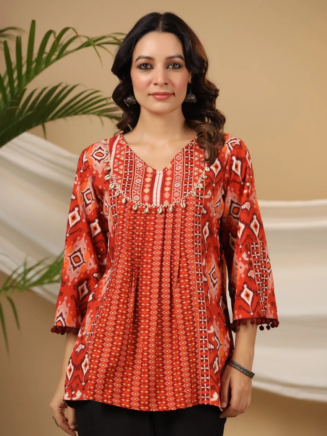 The Crafted Geometrics Rust Ikat Printed Rayon A-Line Tunic. Featuring A V Neckline And Three-Quarter Slit Sleeves, It Exudes Elegance. The A-Line Silhouette And Lace Detailing Add Charm, While Pin Tucks And Beadwork Enhance Its Appeal. Perfect For Adding A Touch Of Sophistication To Any Outfit.