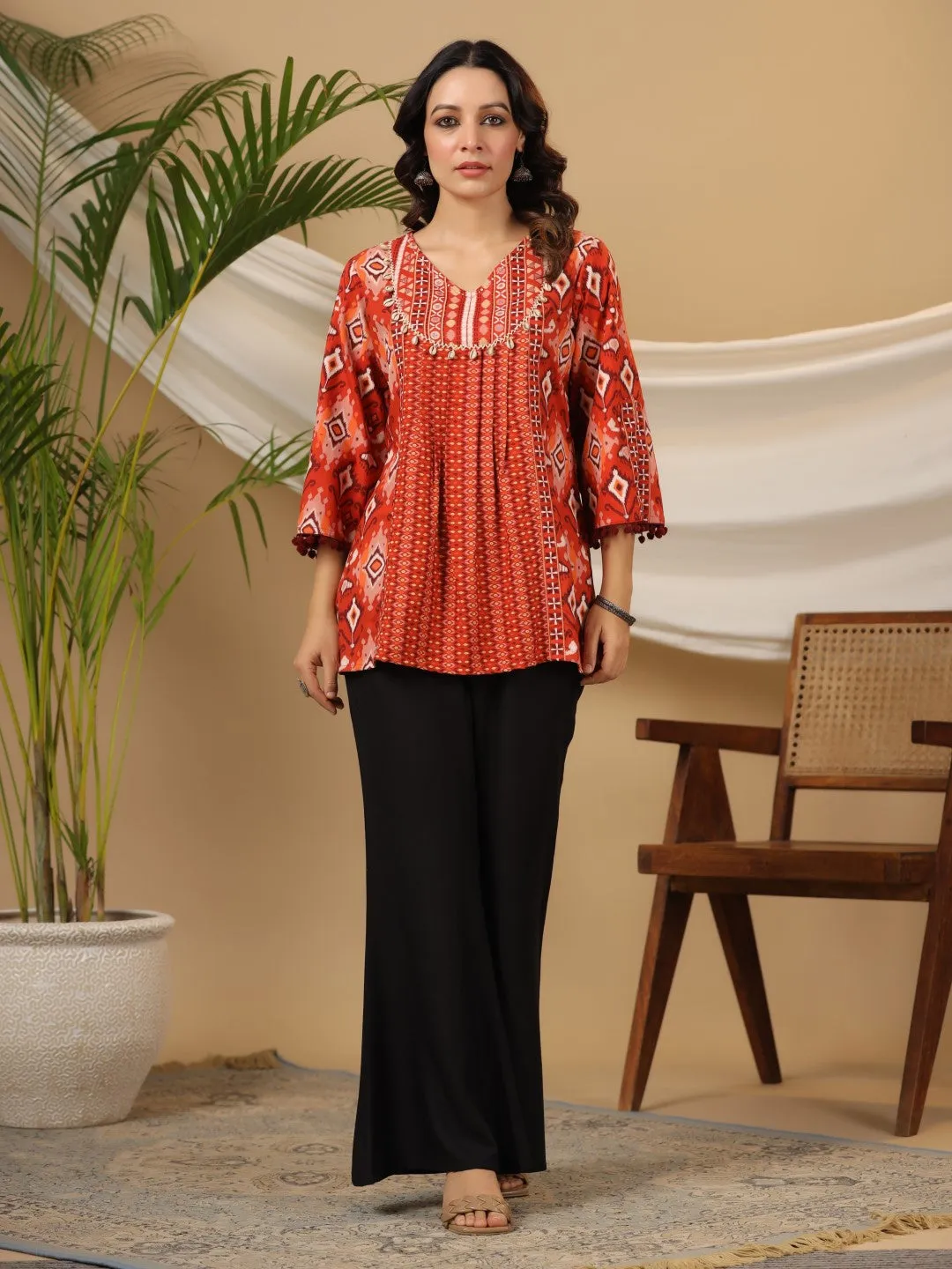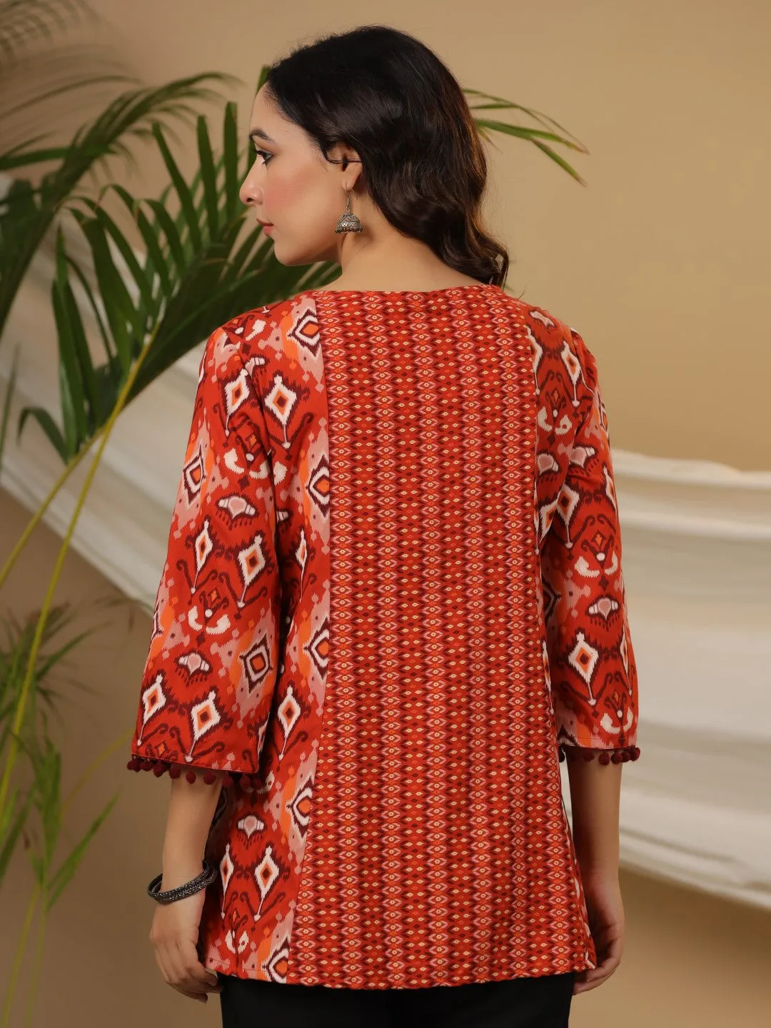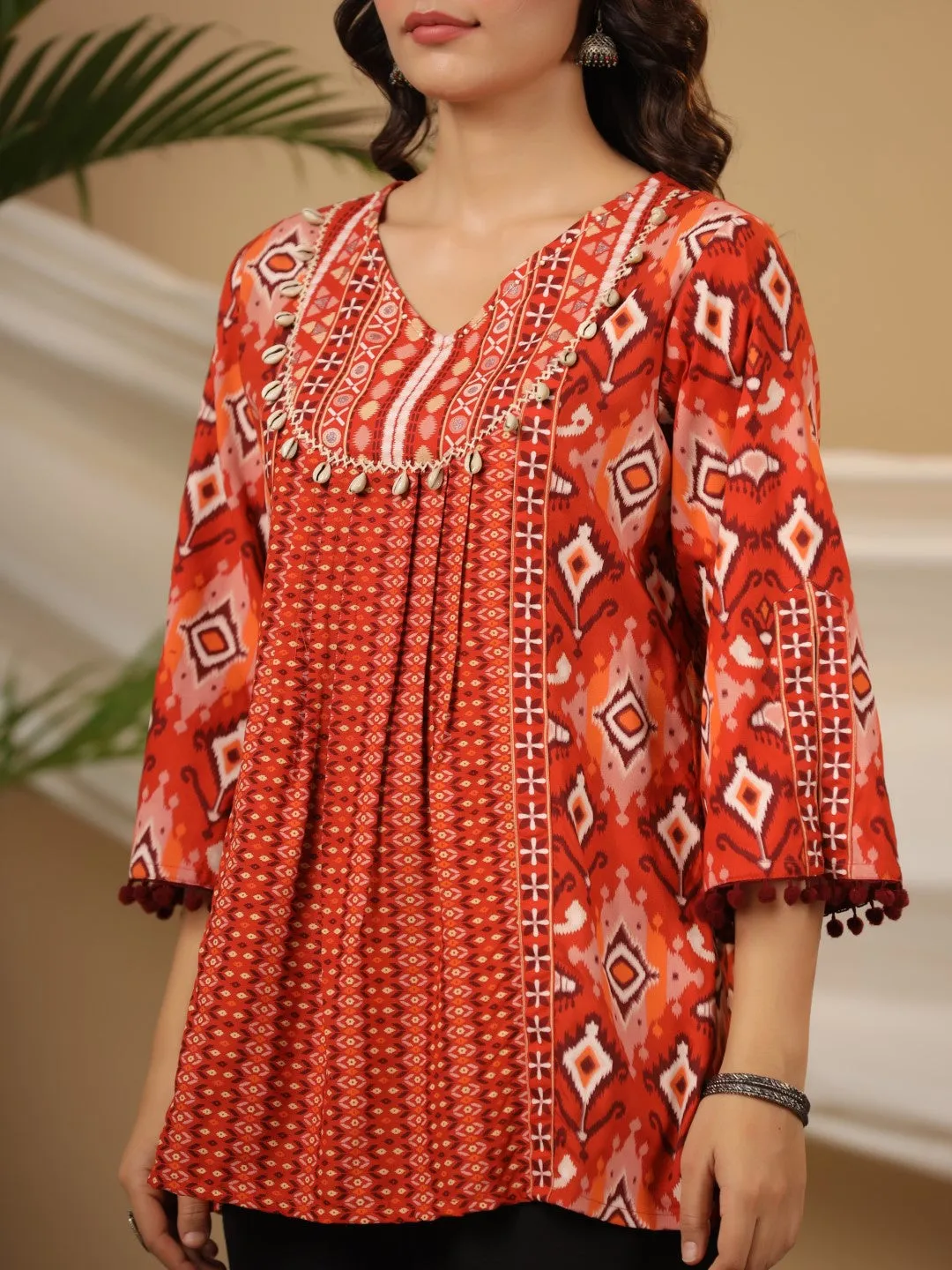 The Crafted Geometrics Rust Ikat Printed Rayon A-Line Tunic. Featuring A V Neckline And Three-Quarter Slit Sleeves, It Exudes Elegance. The A-Line Silhouette And Lace Detailing Add Charm, While Pin Tucks And Beadwork Enhance Its Appeal. Perfect For Adding A Touch Of Sophistication To Any Outfit.