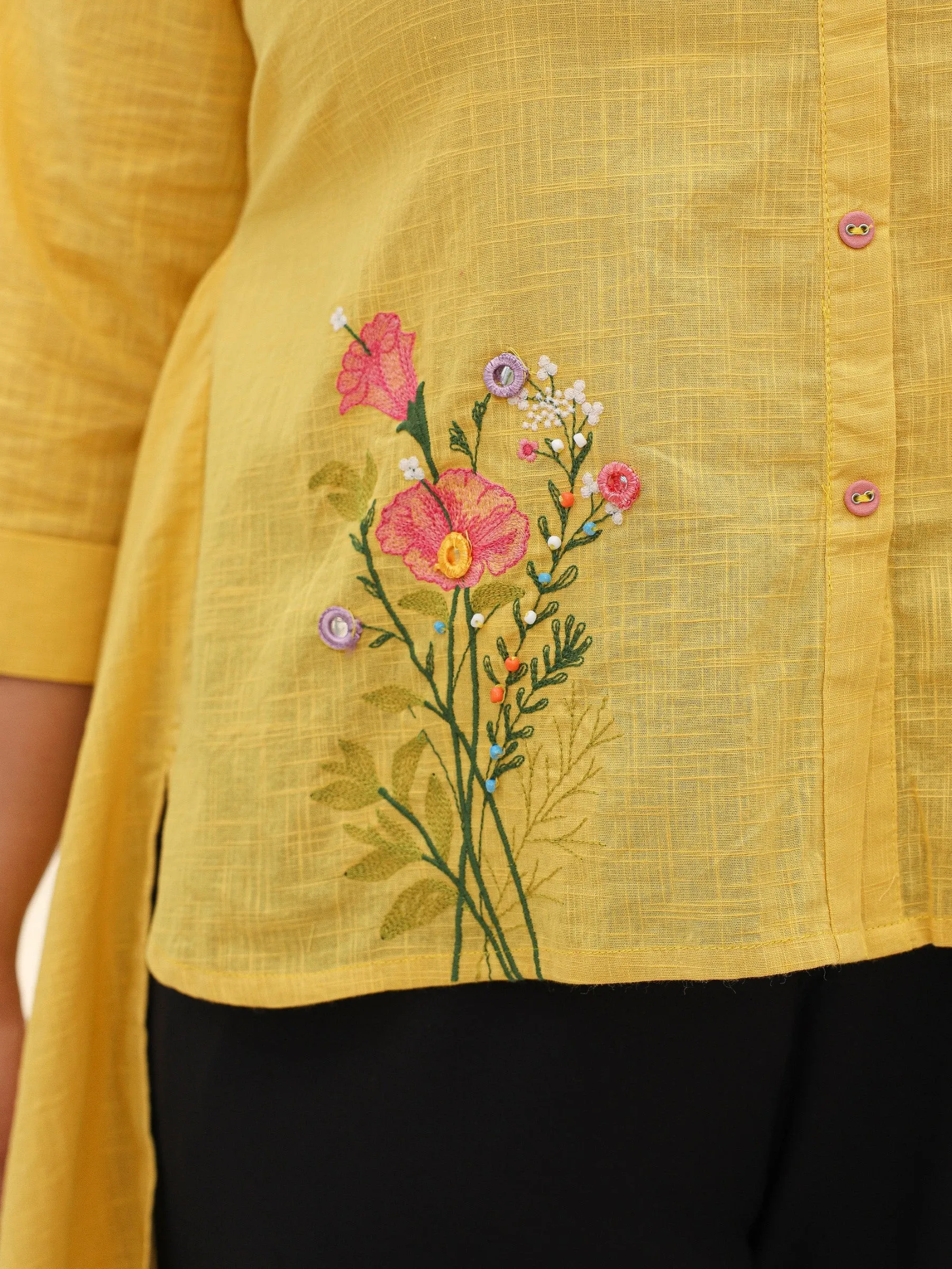 The Wonderland Yellow Cotton Slub High-Low Plus Size Tunic With Embroidery. Features A Shirt Collar And Three-Quarter Roll-Up Sleeves For A Stylish Yet Comfortable Look.