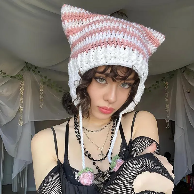 Stay warm and cute with this kawaii cat ear beanie, featuring a fun striped design. It's a delightful accessory for winter, adding a playful and funny touch to your cold-weather outfits.