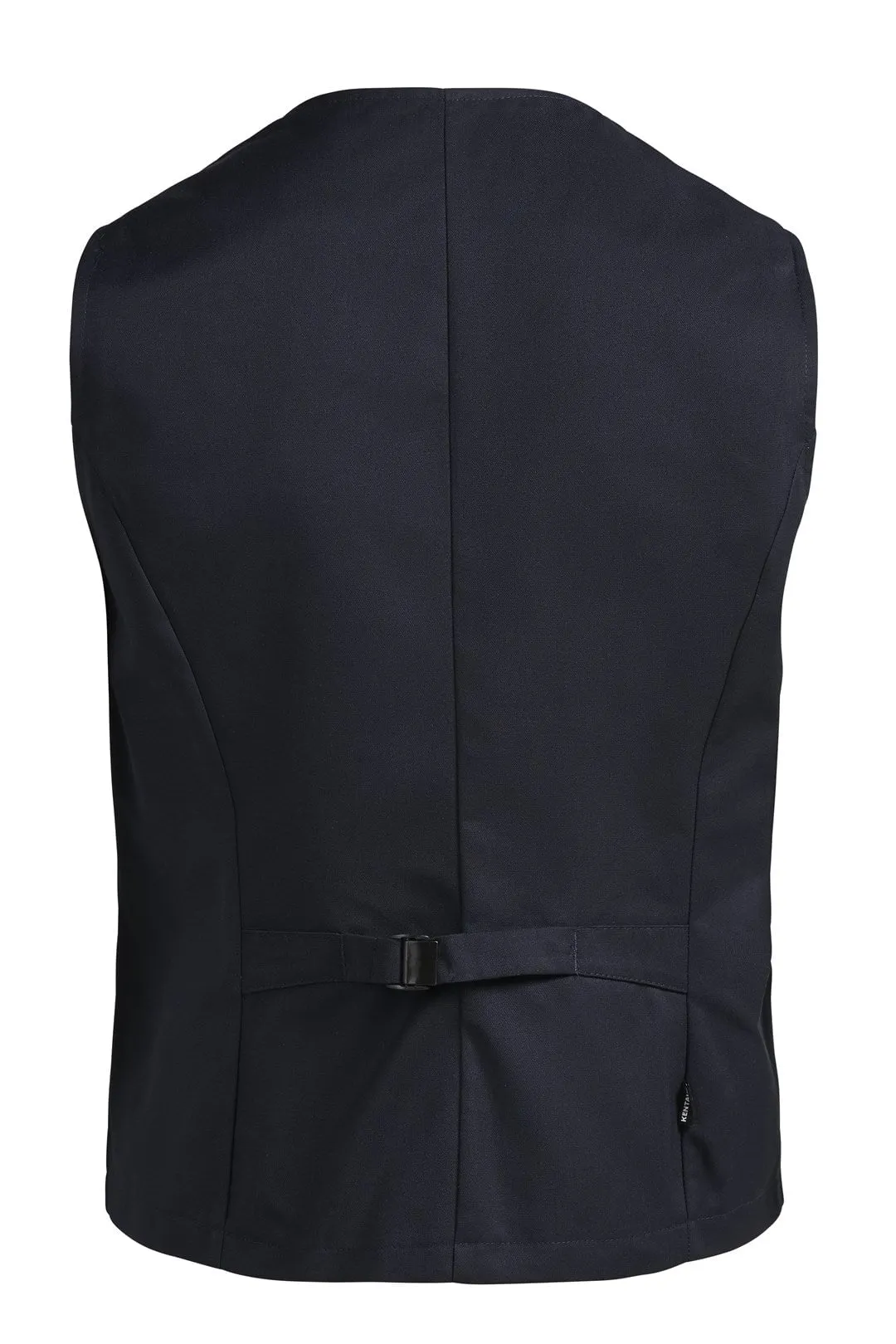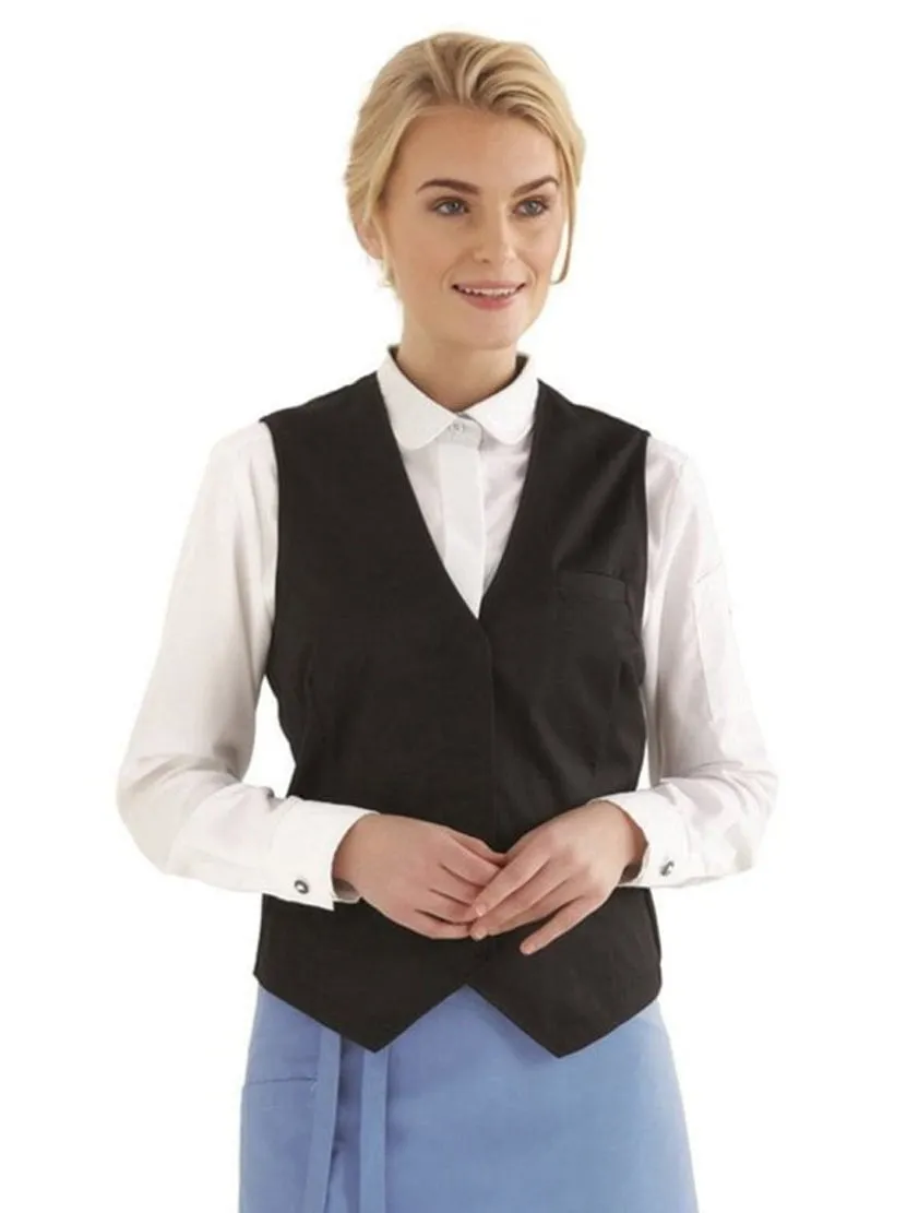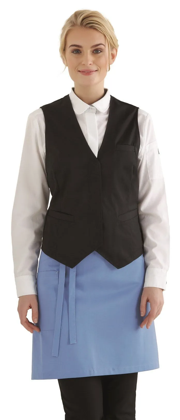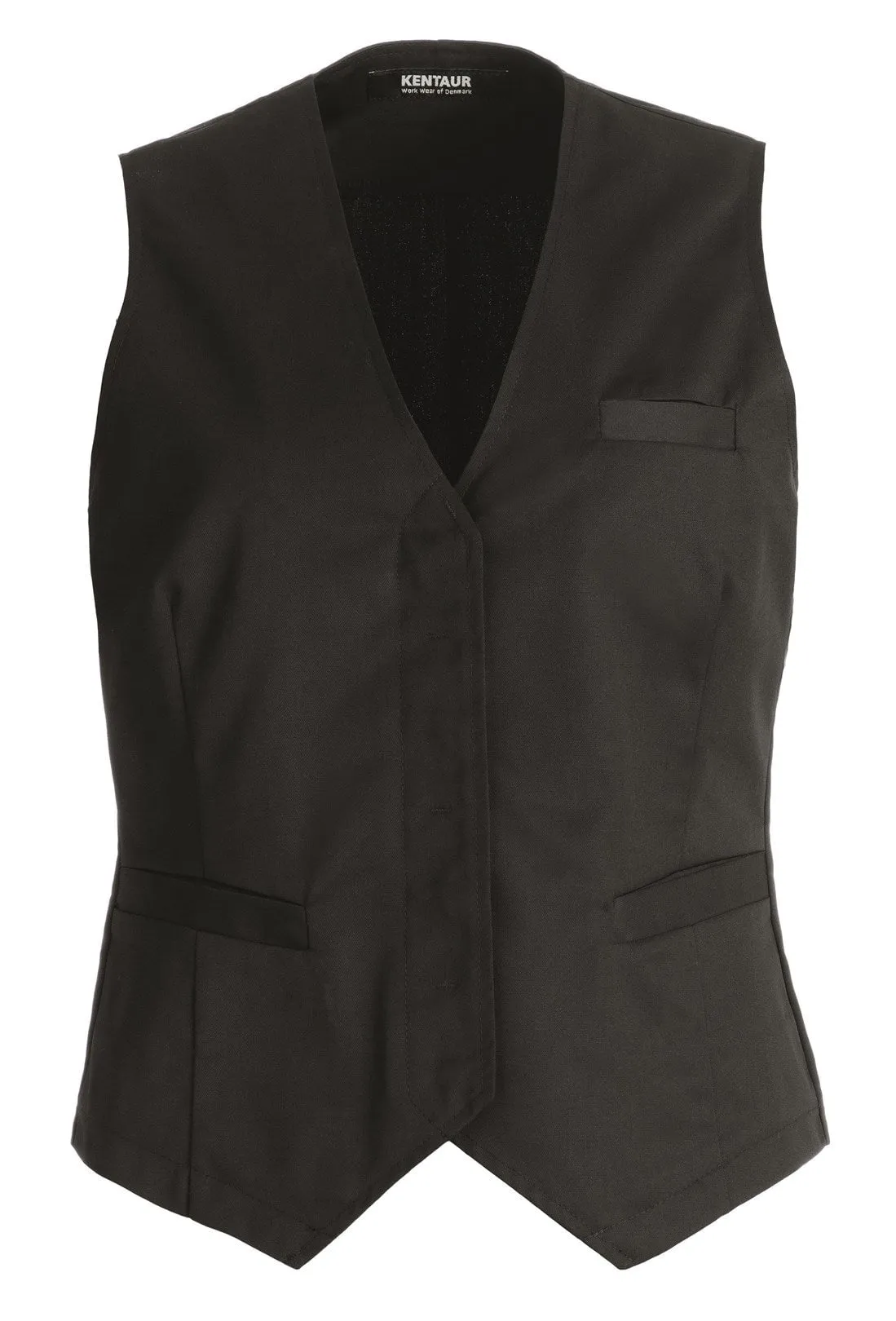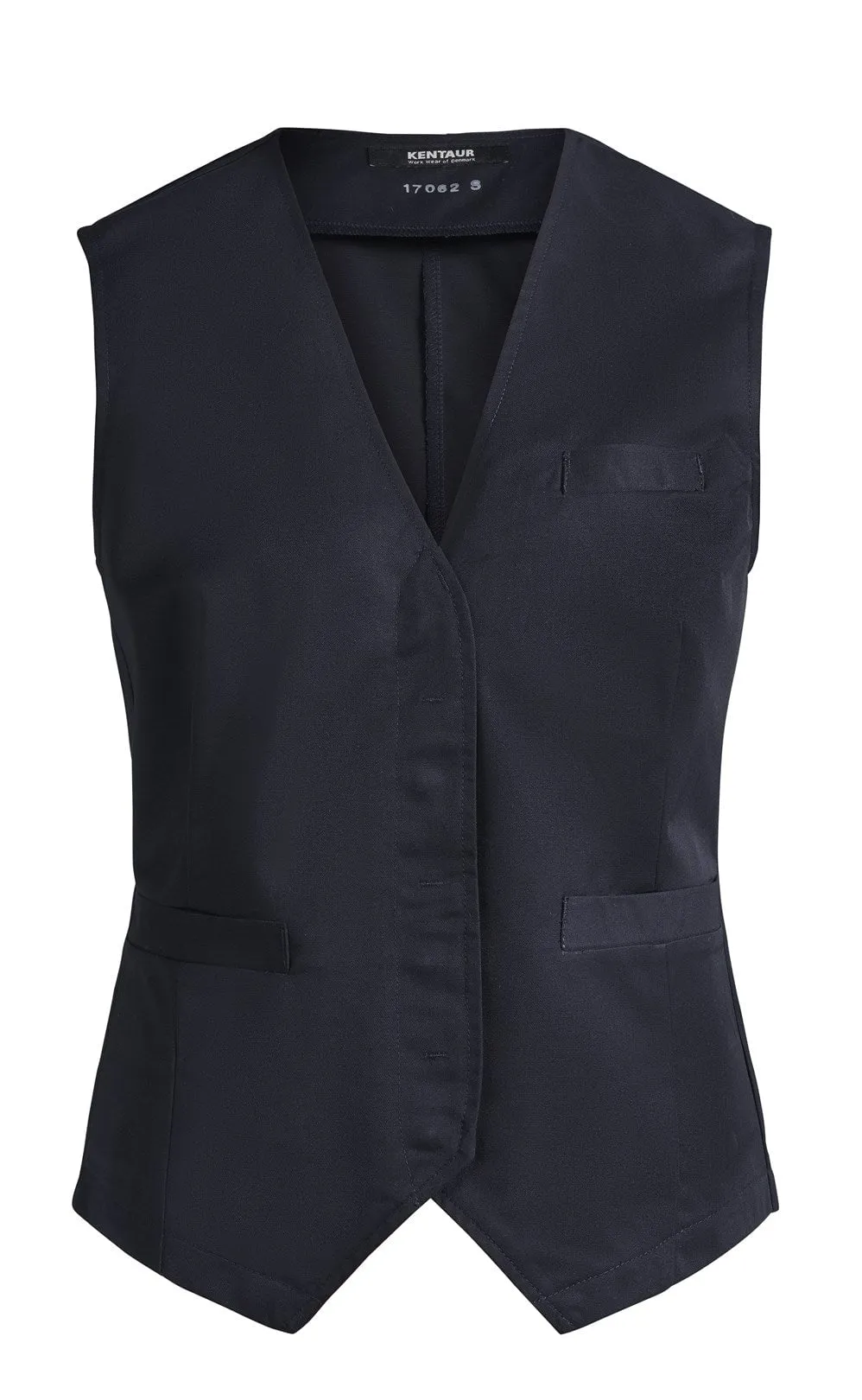 Dress the part of a knowledgeable and capable culinary professional with this Ladies Waistcoat from Kentaur. The fashion-forward manufacturer makes sustainable garments such as this out of recycled PET bottles. The cotton and recycled polyester blend is stretchy and comfortable, deeming it perfect for the demanding environment of a kitchen or culinary classroom. It's available in a range of sizes, making it possible for everyone to wear the same waistcoat to work. The sleeveless garment has an adjustable back, giving it a snug yet comfy fit.