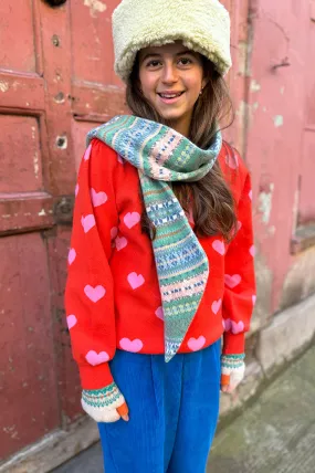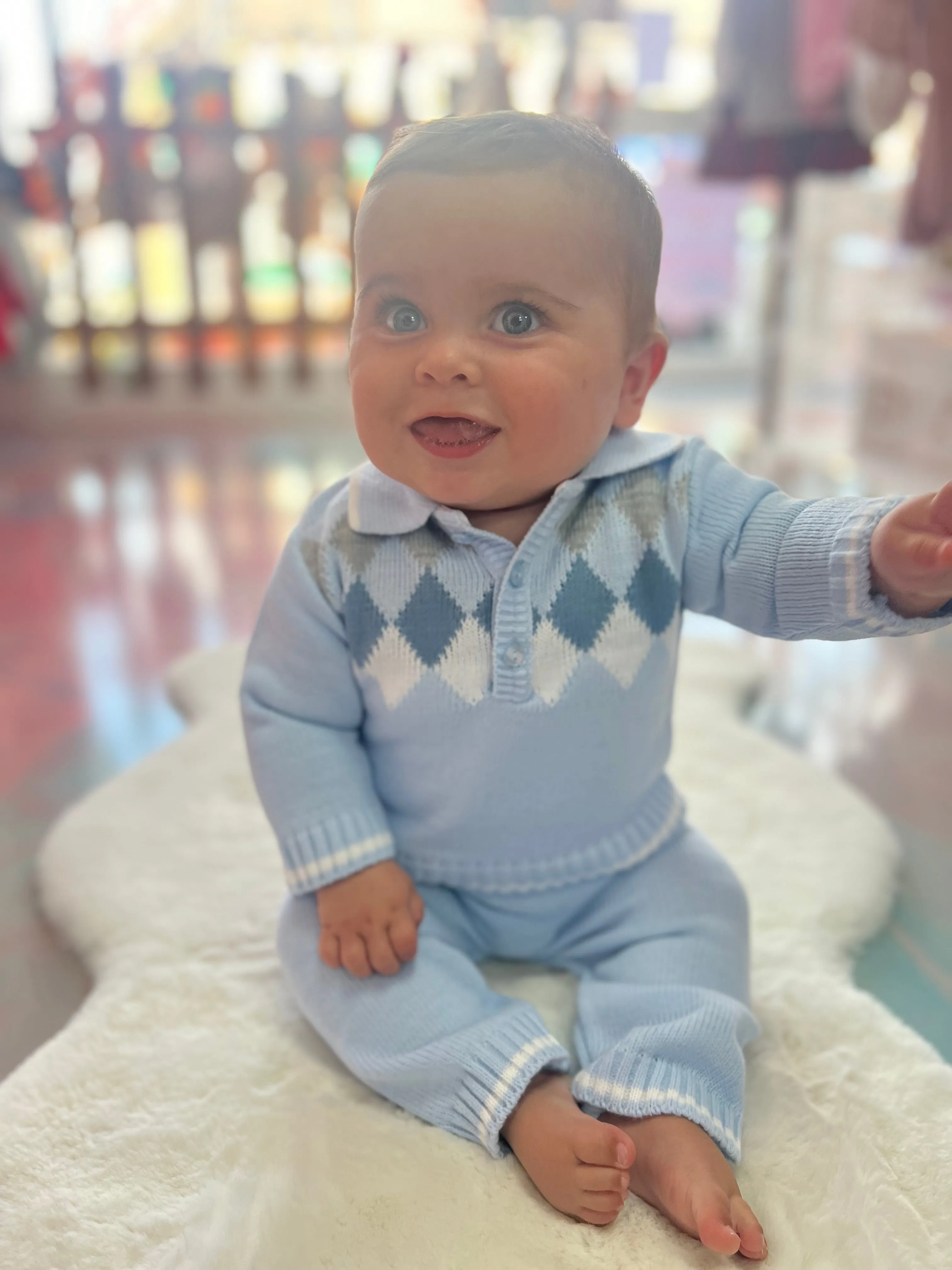 Cute boys, two piece knitted set in a lovely soft wool with a Pringle type pattern on the jumper and elasticated waist on the trousers.