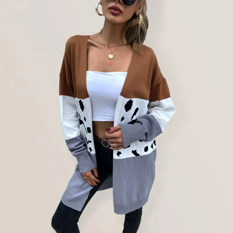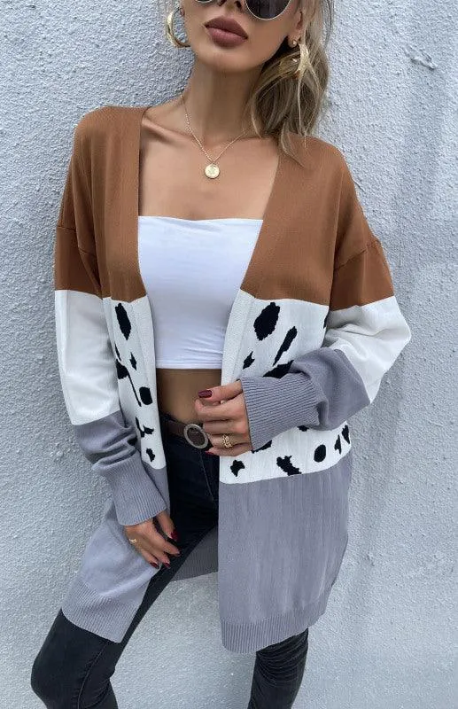 This sweater cardigan is the perfect addition to your autumn-winter wardrobe. Made of 100% polyester, it features a stylish leopard print stitching pattern that adds a touch of retro charm. The regular long sleeves make it a comfortable and fashionable choice for any occasion.