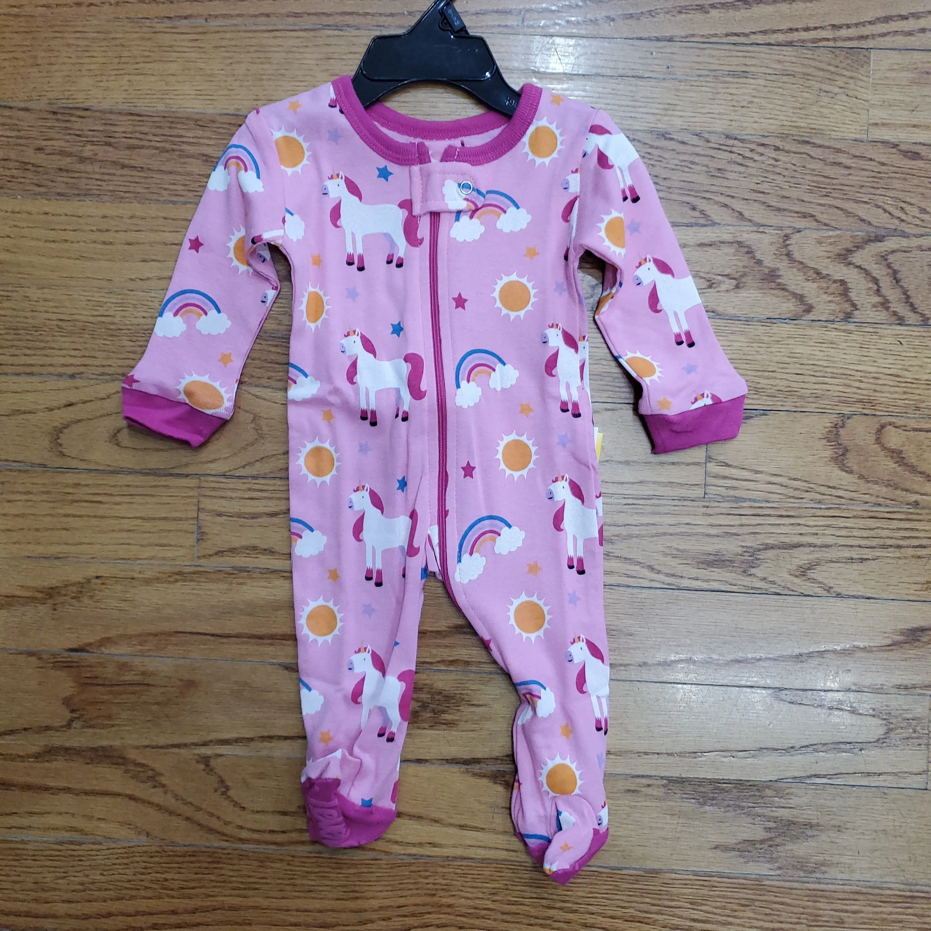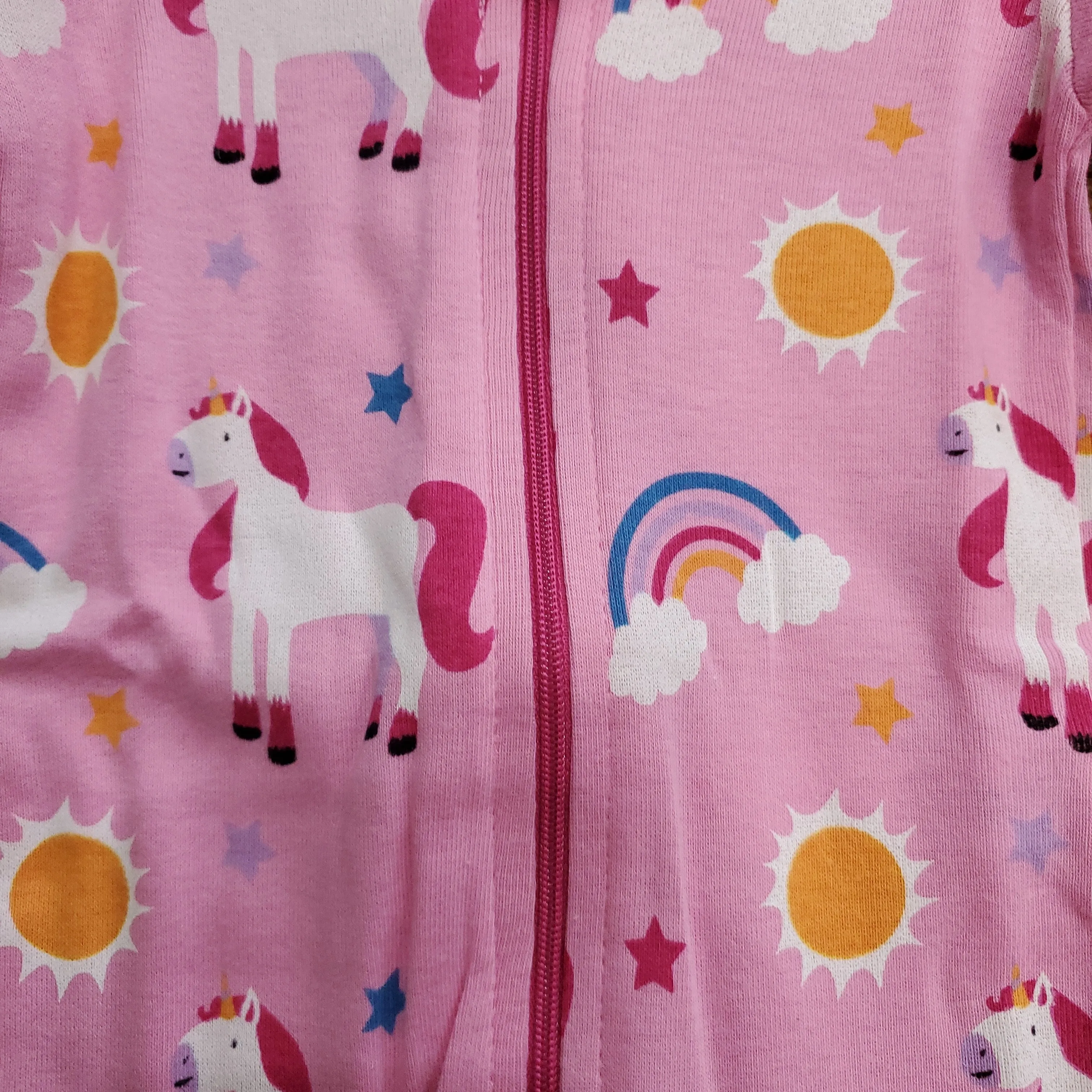 • Pink footie sleeper with unicorns, sun, stars and rainbows