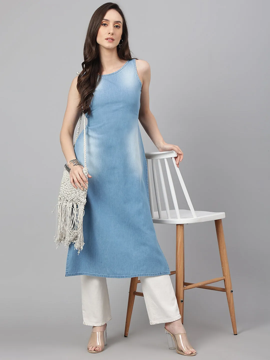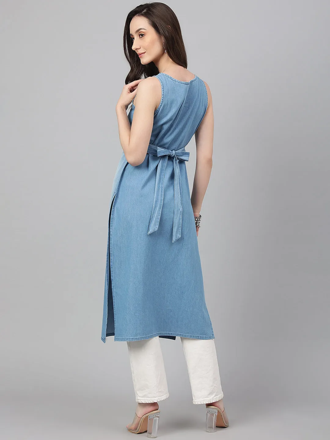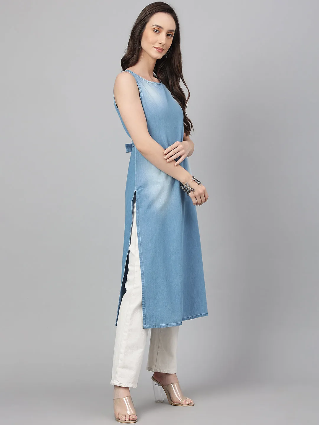 - Embrace effortless style with the beautifully crafted light blue solid sleeveless denim kurta. It features round neck, belt at the waist, side slit with straight fit.