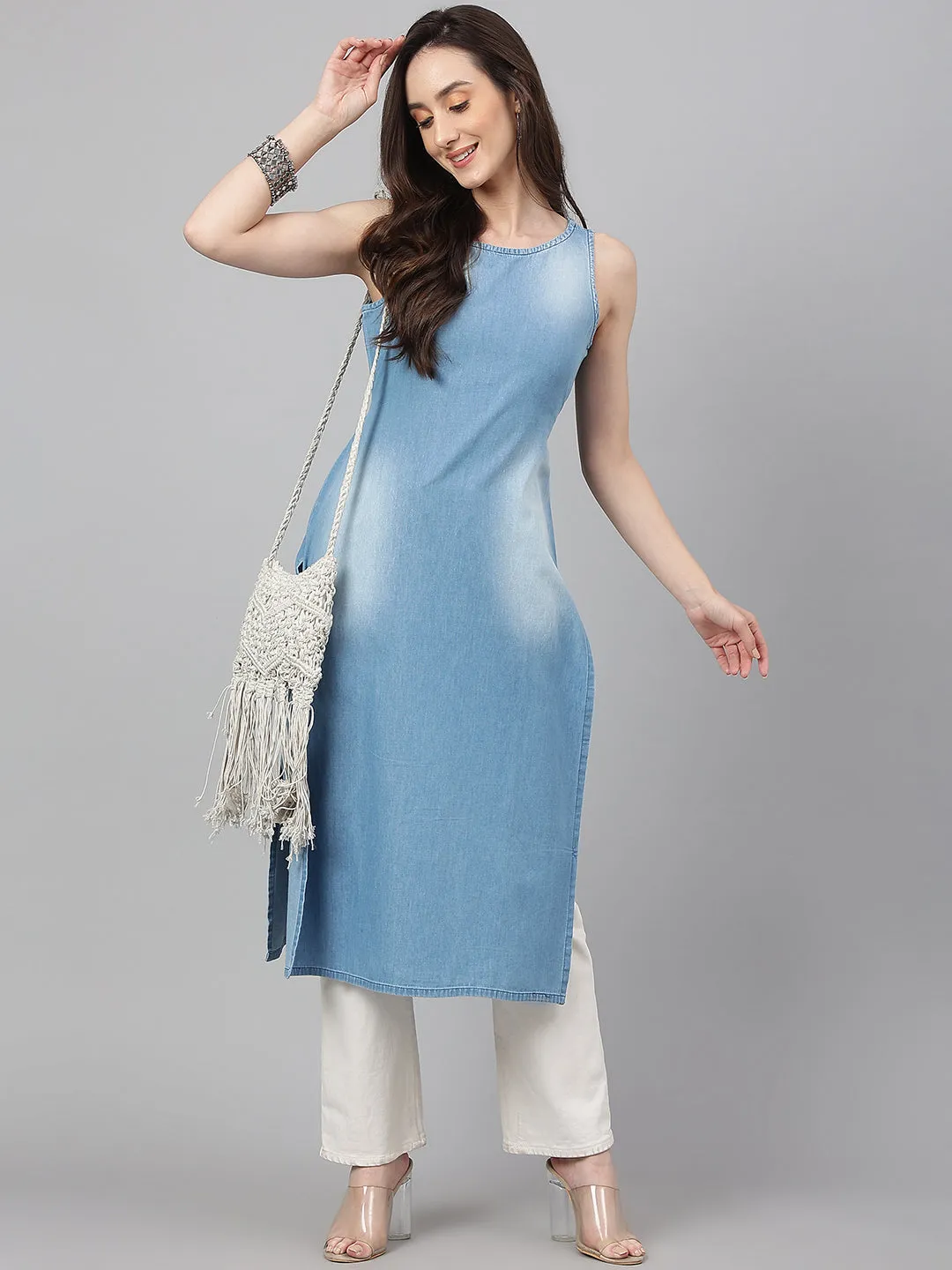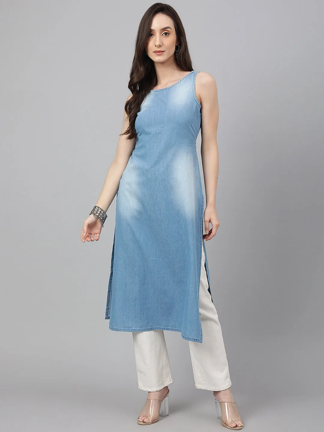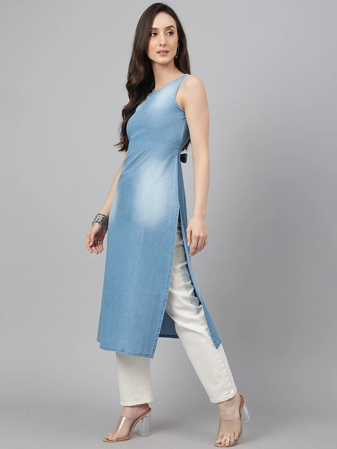 - Embrace effortless style with the beautifully crafted light blue solid sleeveless denim kurta. It features round neck, belt at the waist, side slit with straight fit.