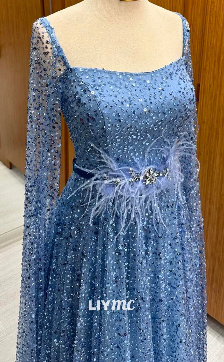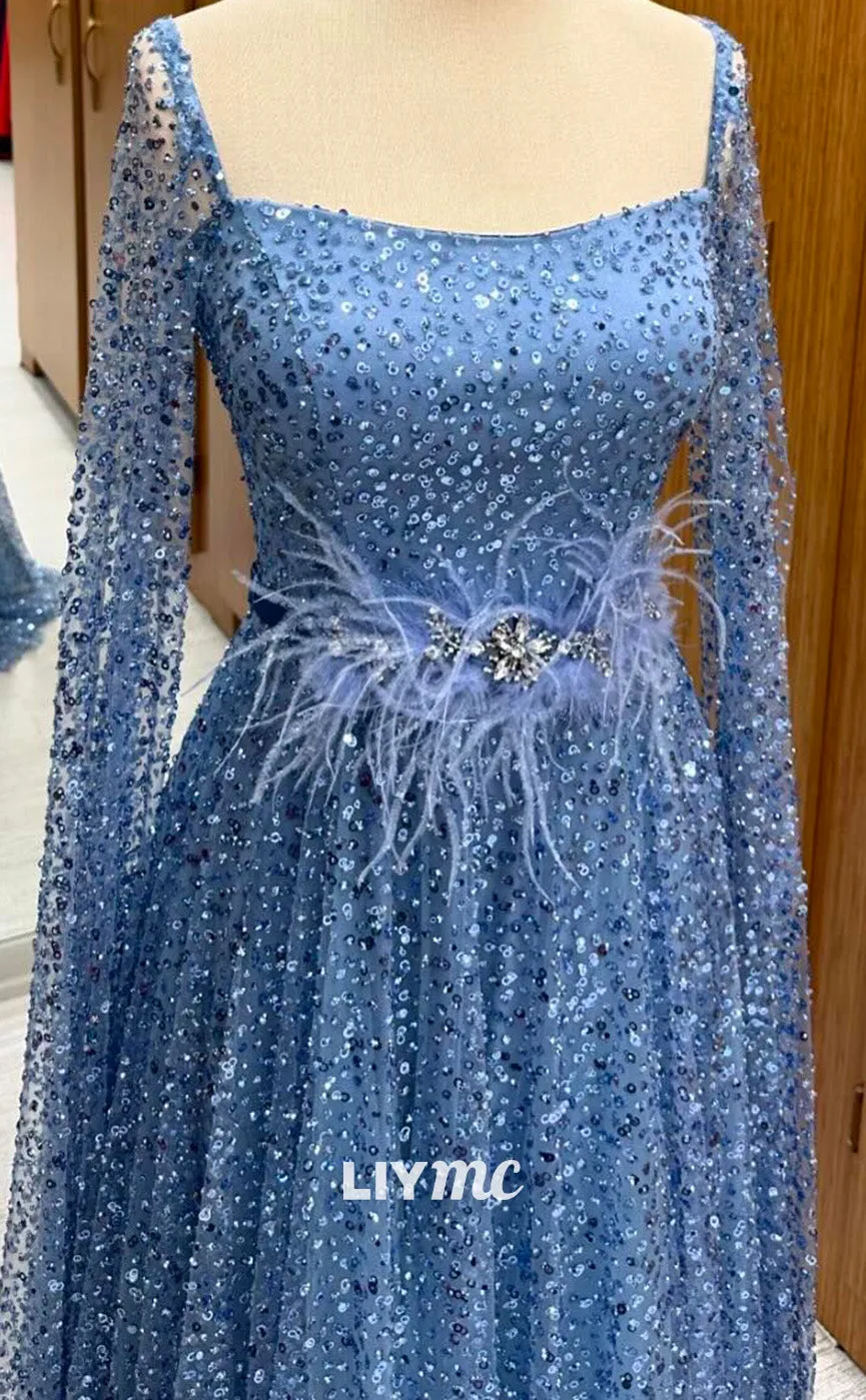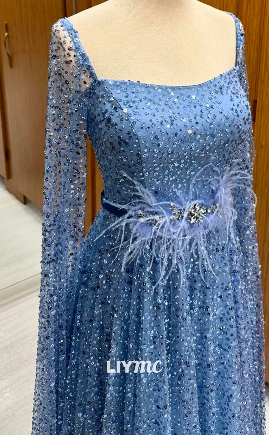 Elevate your style with our LP2249 Square Long Sleeves Beaded Sequins Feathered A-Line Cocktail Dress Prom Dress. This stunning dress features intricate beading and sequins, along with delicate feathered details, to create a timeless and elegant look. The square long sleeves add a touch of sophistication, making it perfect for any formal event. Make a statement and turn heads with this gorgeous dress.