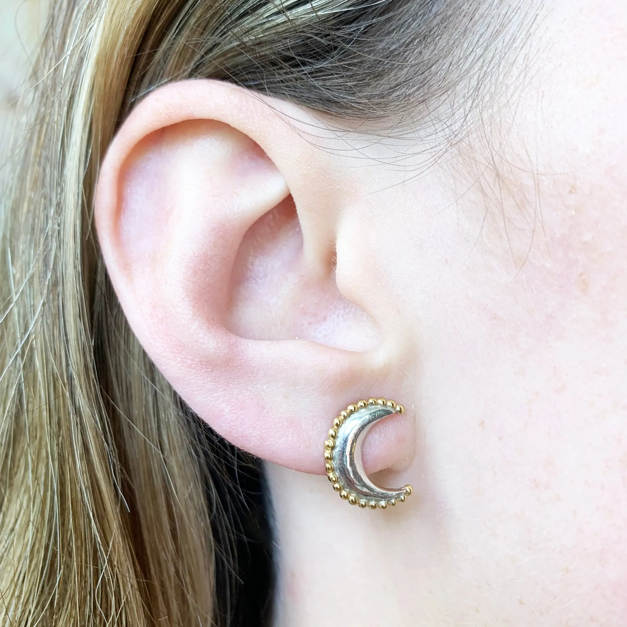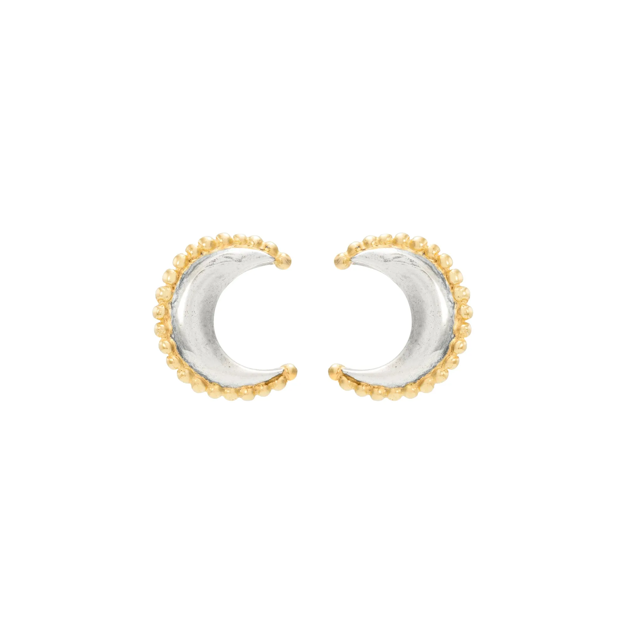 These lovely stud earrings are made in sterling silver with gold plated beaded detail. The dimensions are 12x15mm.