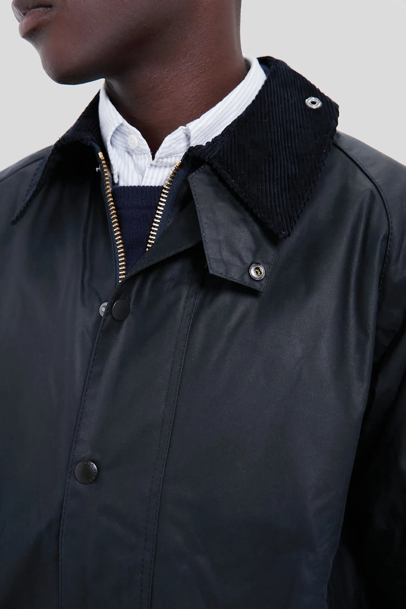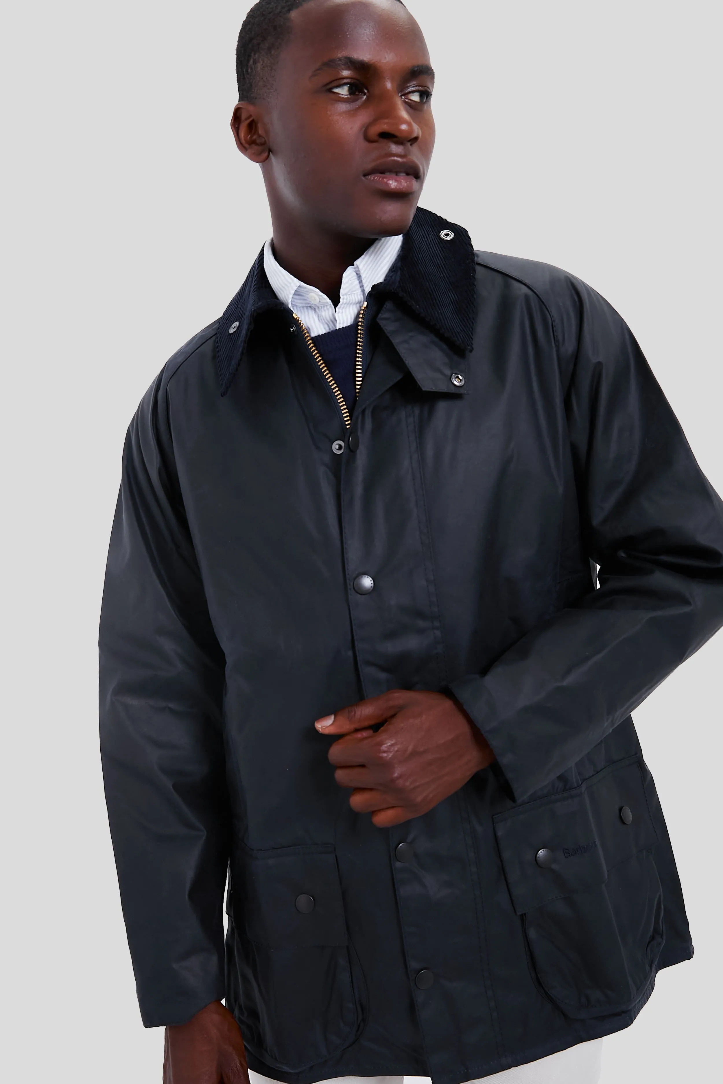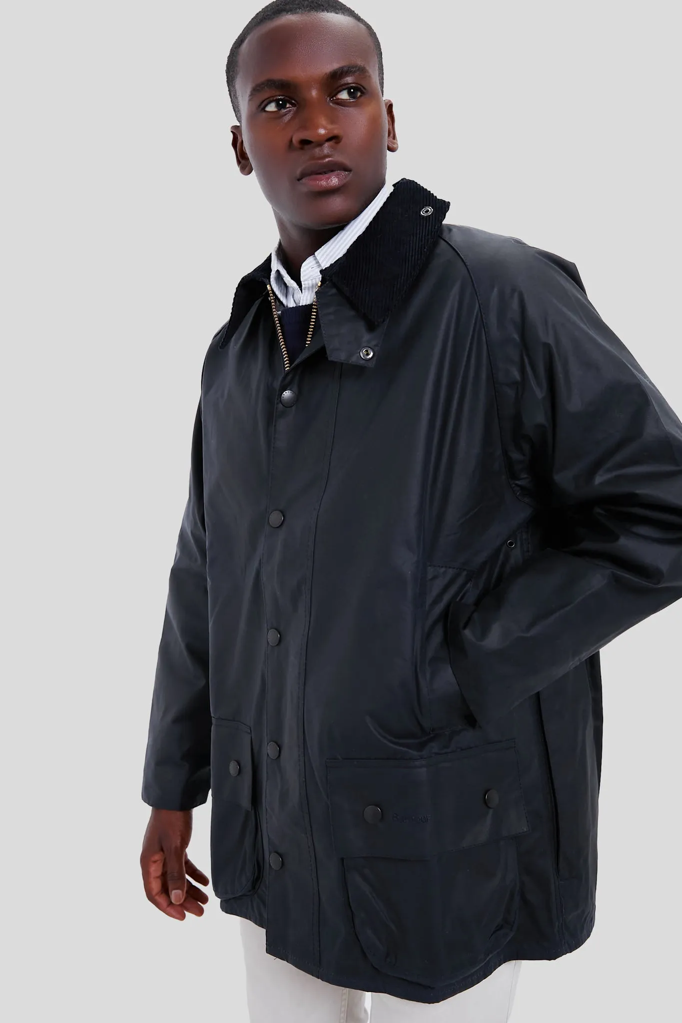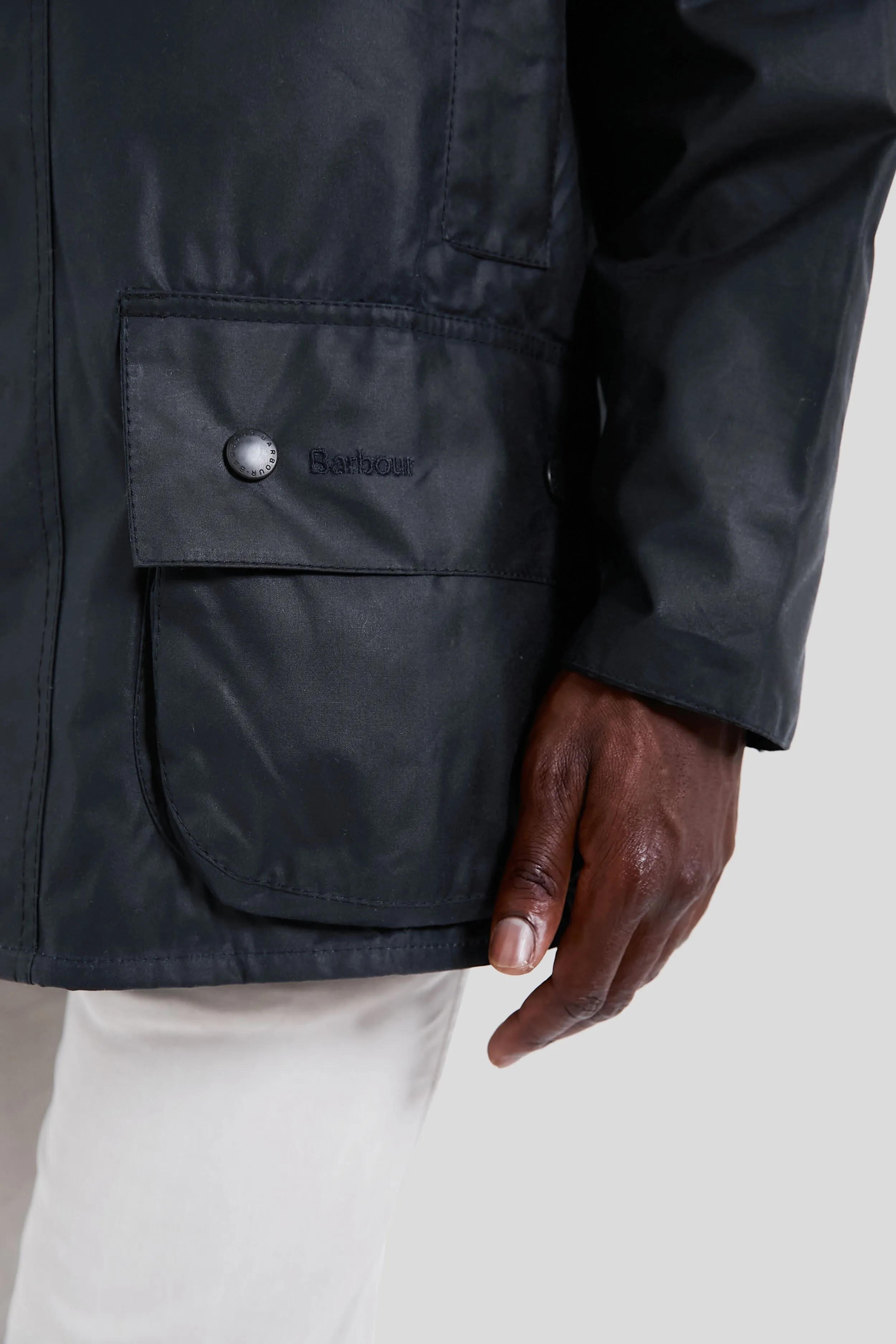 The Navy Beaufort Wax Jacket is a stylish yet practical piece with timeless country looks and a waxed outer shell that's perfect for year-round wear. The smart corduroy collar feels luxuriously soft and is studded to give you the option of adding a separate hood, while the two-way zip, studded storm fly front and velcro-fastening windcuffs seal out drafts. Two lower bellows pockets offer plenty of room for essentials, and moleskin-lined hand warming pockets provide welcome warmth on cold days.