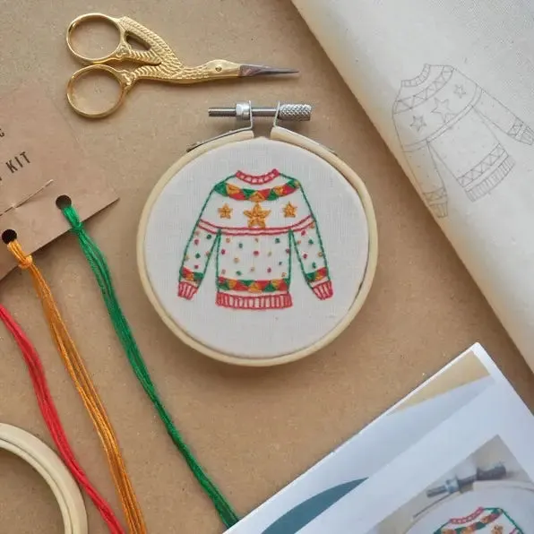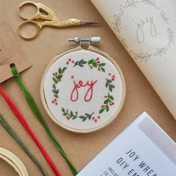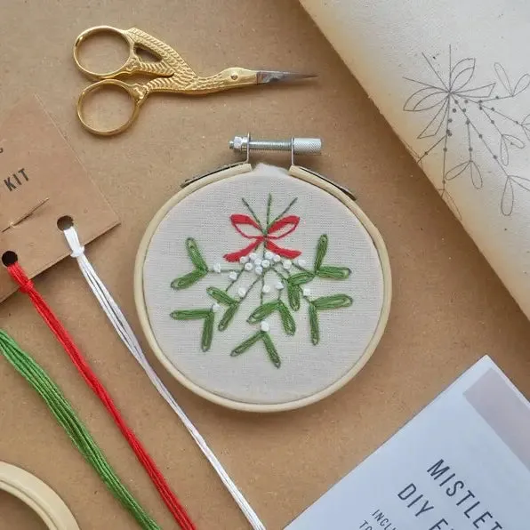 Each kit contains: Printed illustrated instruction guide. Design printed onto cotton fabric 3-inch (7.5cm) wooden embroidery hoop. Ample thread to complete the design. Embroidery needle