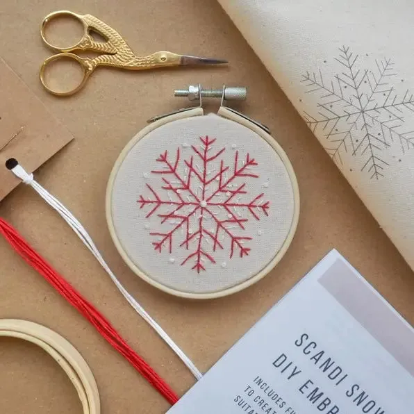 This festive craft kit contains everything you'll need to create your own hand embroidered snowflake Christmas decoration. A lovely gift either as a kit, or stitched as a completed item. Perfect for hanging on the Christmas tree. Ideal for beginners with full instructions to try 2 different embroidery stitches, or a lovely relaxing project for someone with more sewing experience.