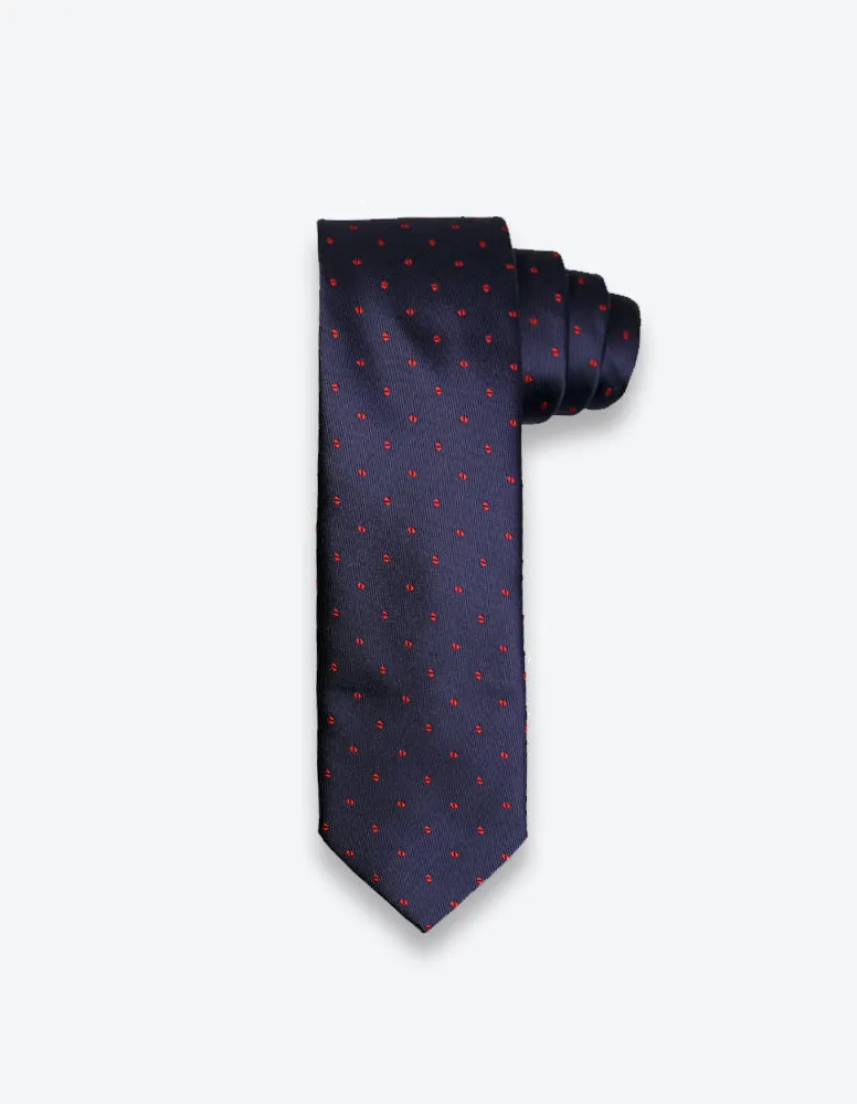 Modern yet classic, this Peyman Umay tie features mini red dots on a midnight navy solid background, making it a perfect tie for any dressy look.