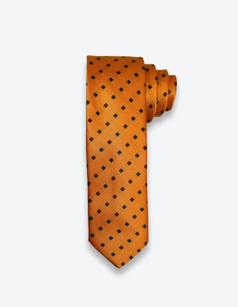 Crafted from a micro-silk fabric, this handsome tie features mini slanted navy tiles on a vibrant orange background with a refined texture.