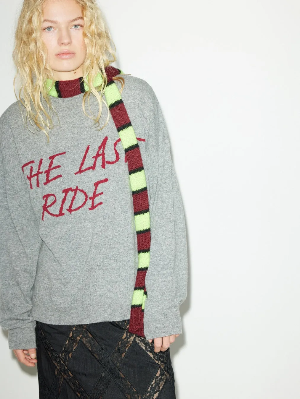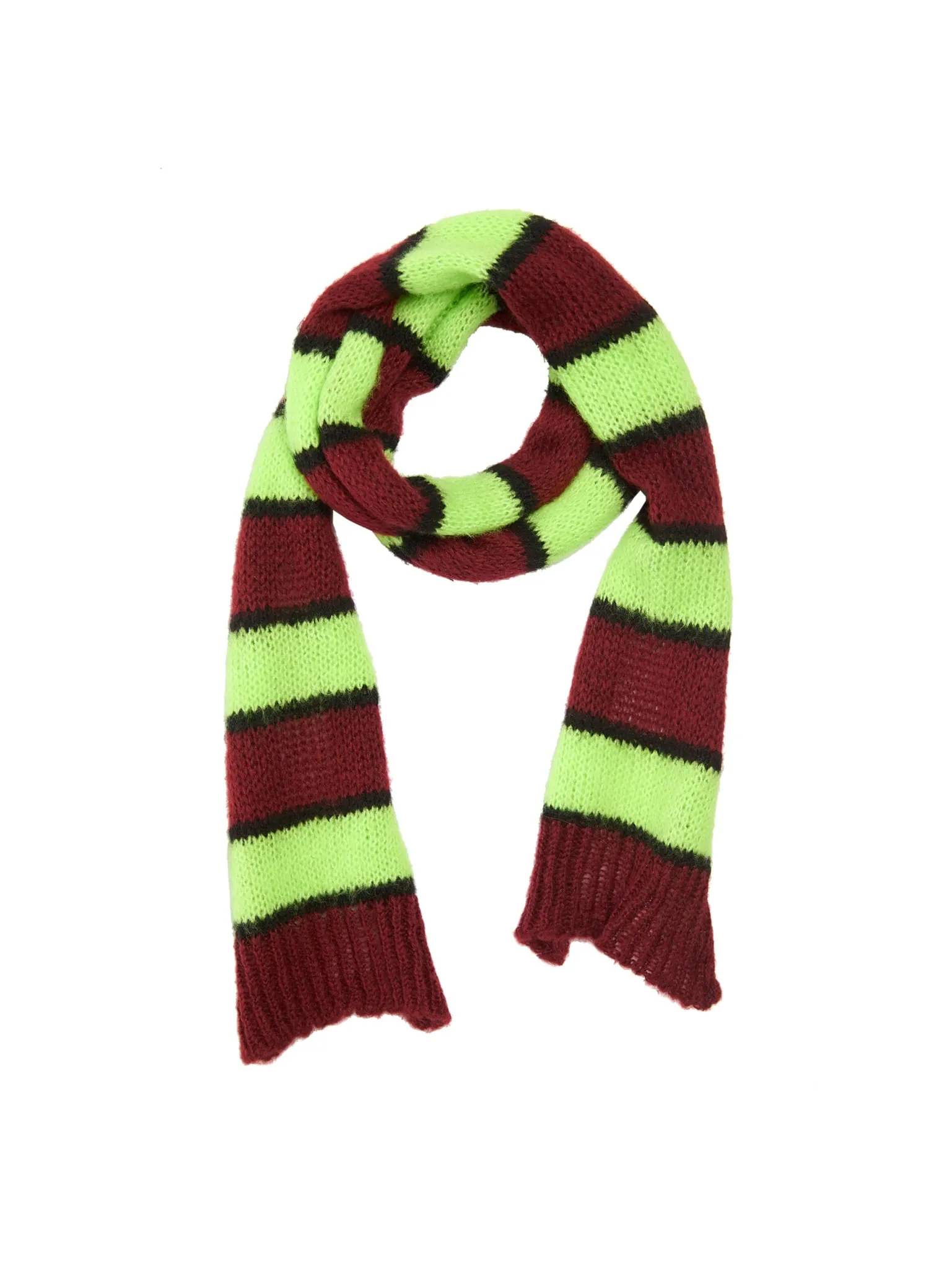 This knitted scarf is a cute accessory to pair with the matching Patricia knit cardigan. The neon green, bordeaux, and black stripes are a color combination that you will love this season, as they can add a splash of color to your outfit.