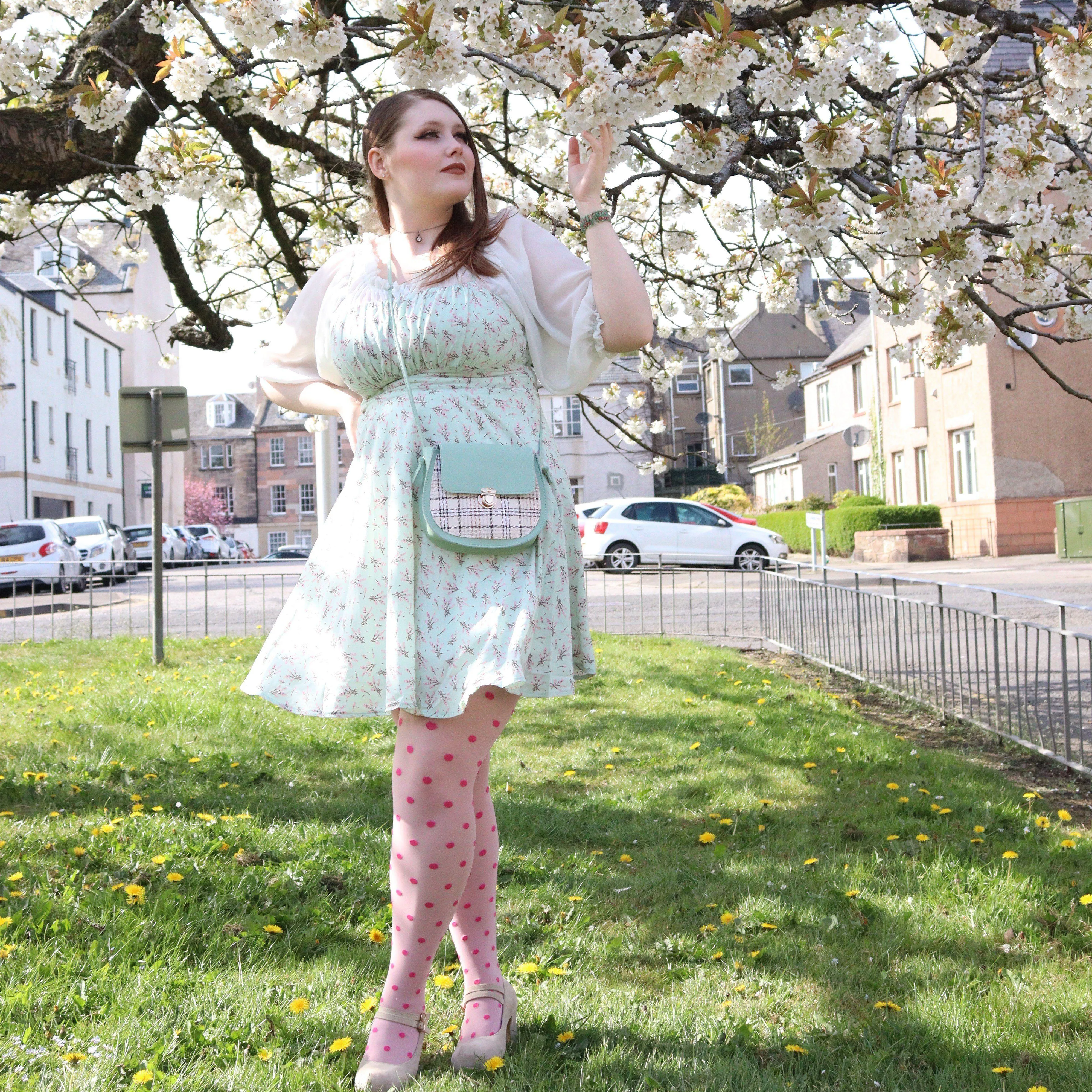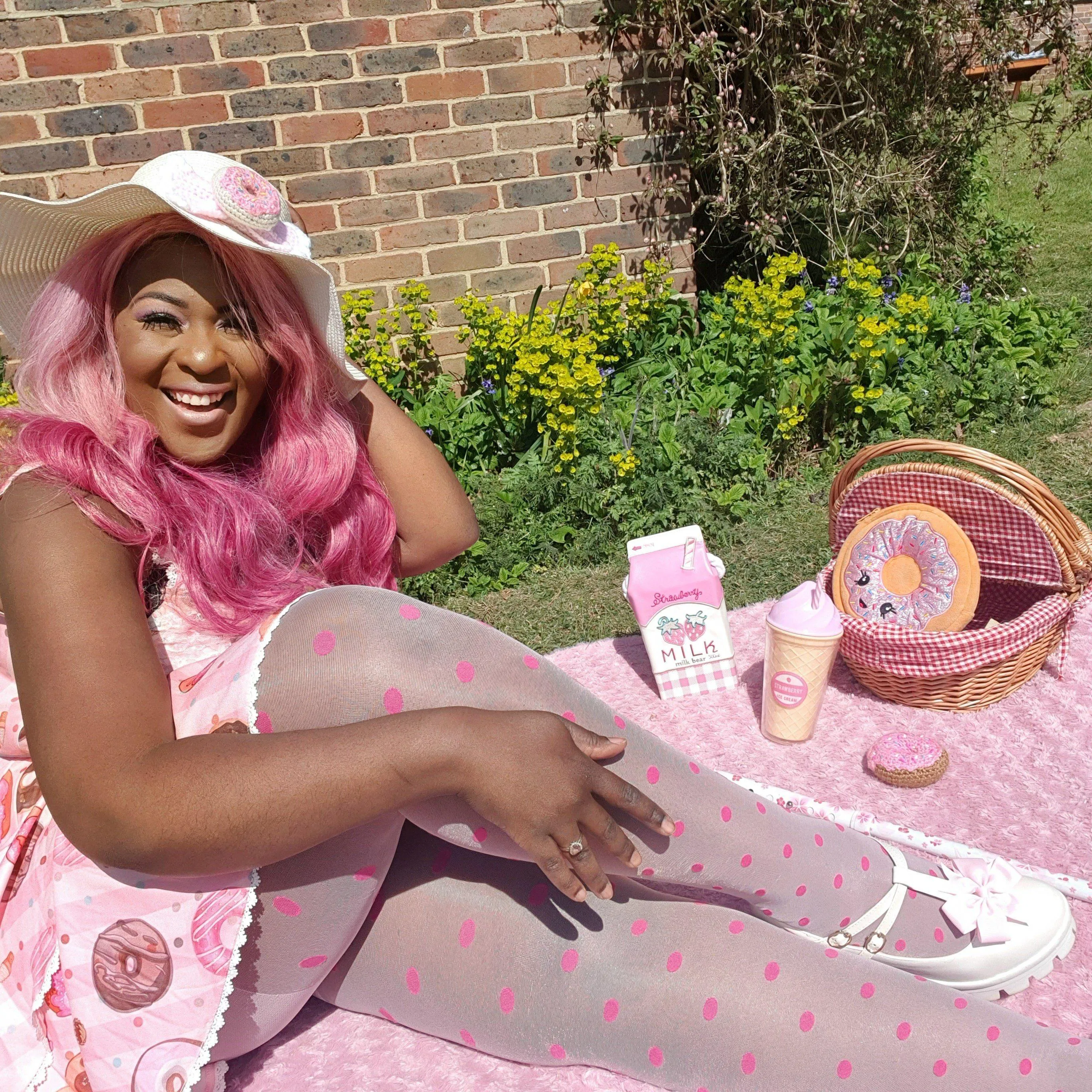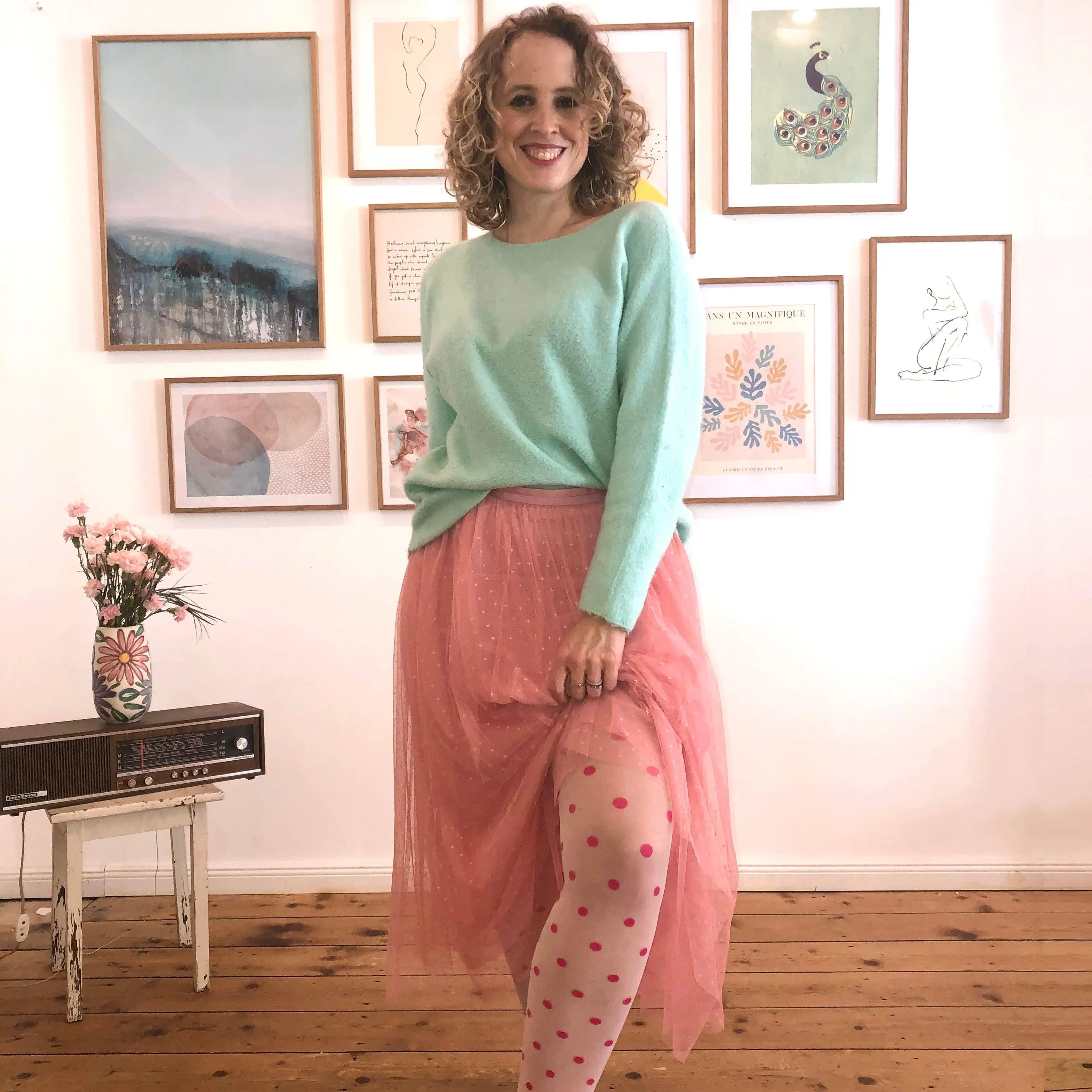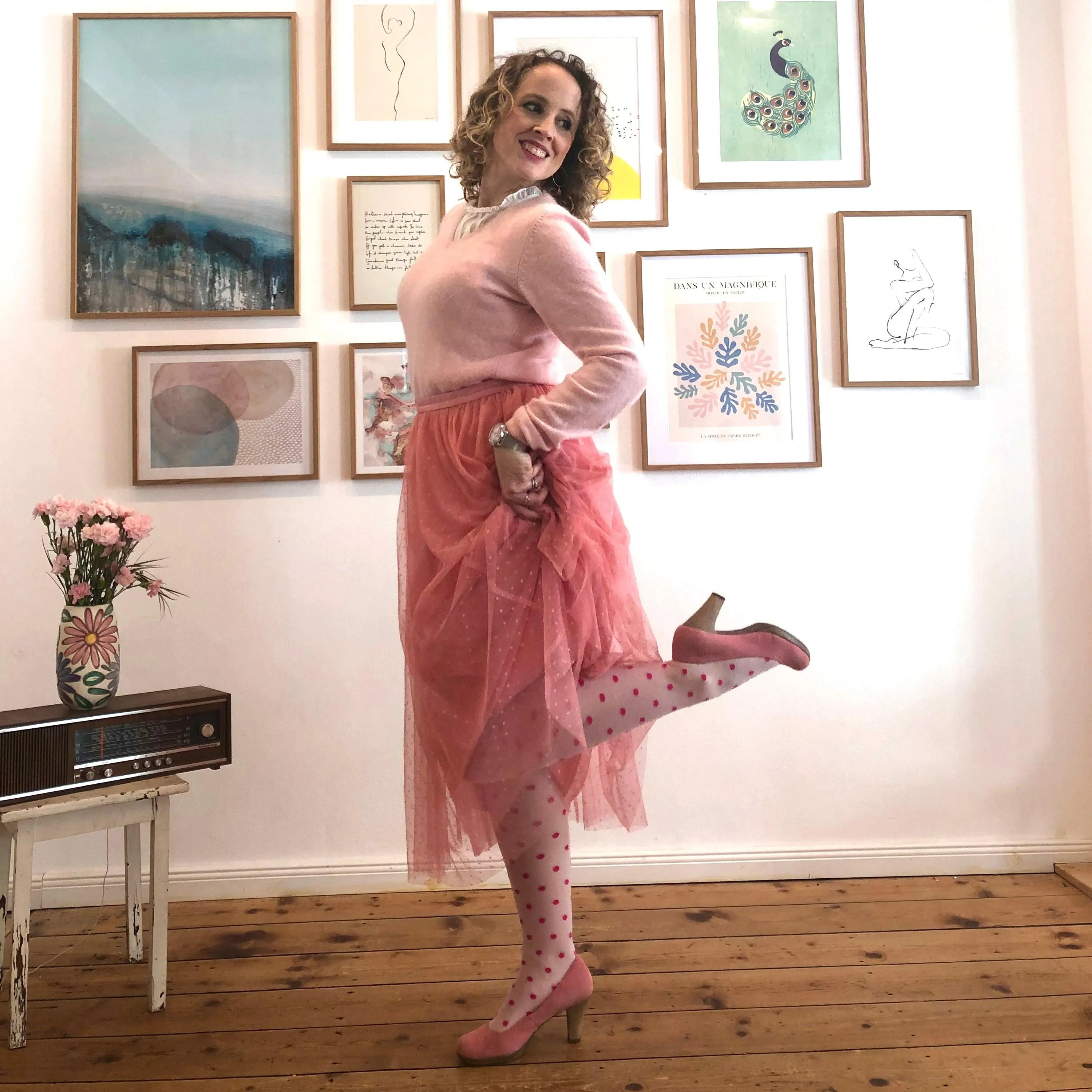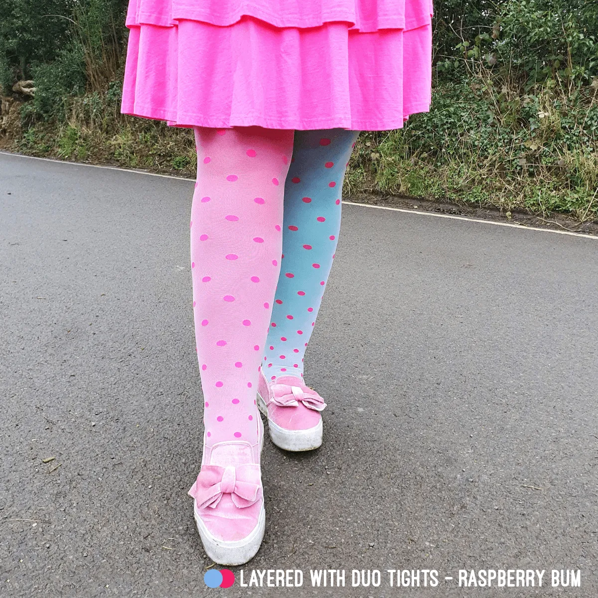 Pink polka pattern sheer tights in 40 denier are great for layering or wearing on their own. The design is knitted right into the base for a cute, durable pair of tights that look great on everybody.